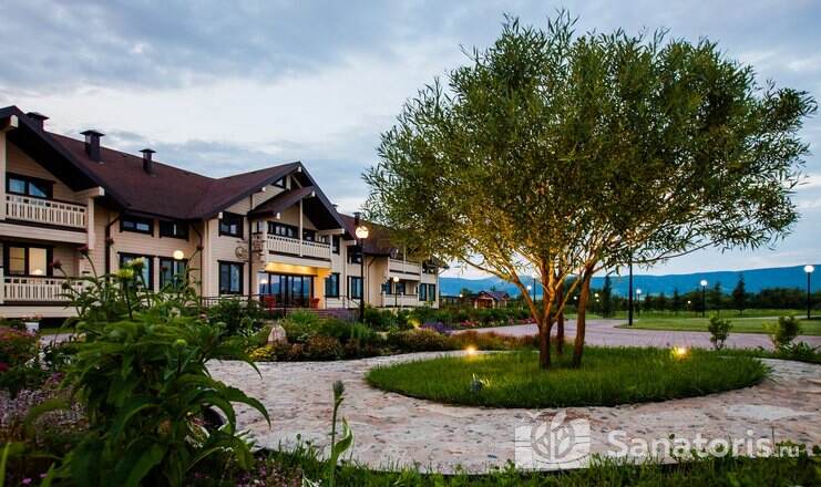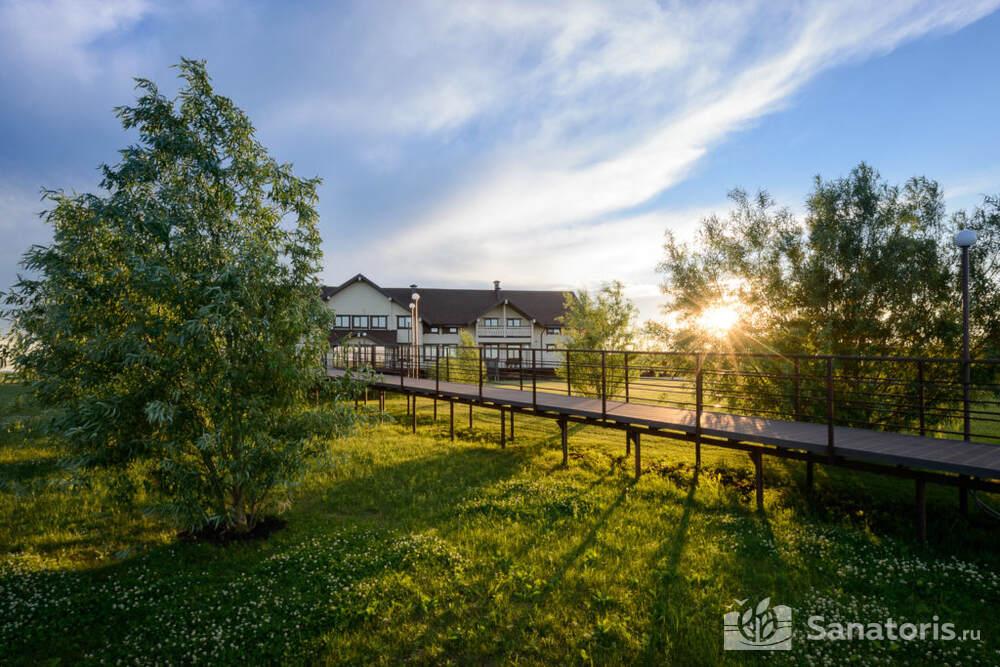 Парковая зона охватывает пять гектаров. Повсюду установлены фонари, скамейки, клумбы и тропинки для прогулок. Есть несколько открытых беседок с садовой мебелью. Возле каждой беседки есть зона барбекю, мангал. Дойти до пляжа можно по пирсу из дерева. Изюминкой санатория является наличие вертолетной площадки.