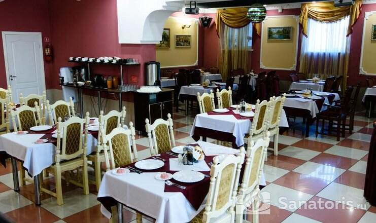 Трехразовое питание (меню-заказ) включено в стоимость курортной путевки. Отдыхающие также могут посетить находящиеся на территории кафе, ресторан. Работает бар с вечерами караоке и продуктовый минимаркет.