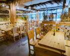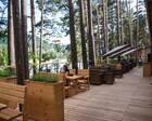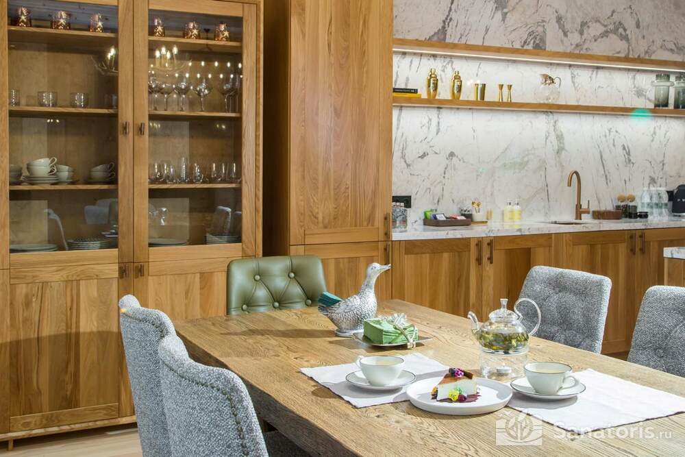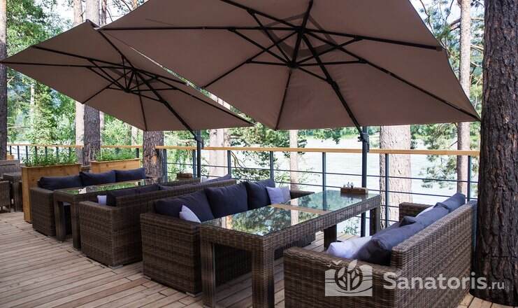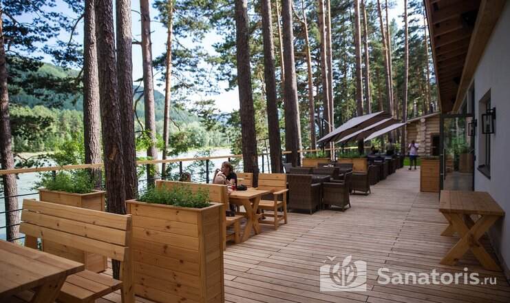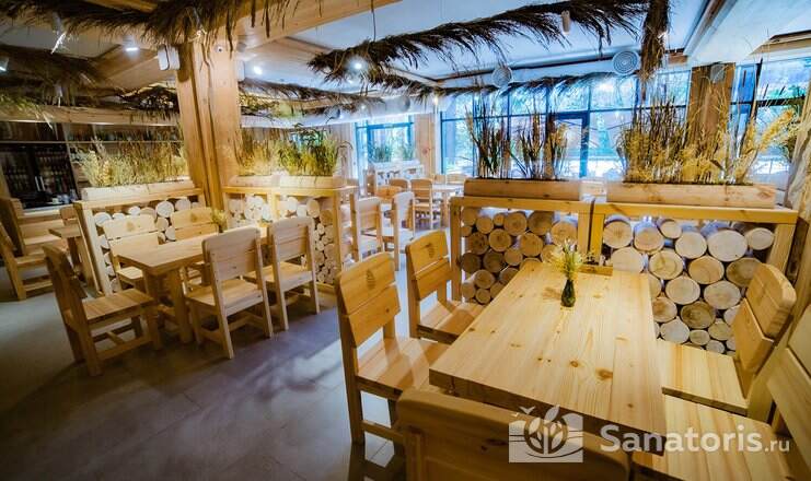 Гости питаются в шикарном панорамном ресторане «Сосны». Здесь подают блюда авторской, европейской и национальной кухни. Ресторан находится на первом этаже гостиницы. Завтраки подают по системе шведский стол. Гостям предлагают выпечку, сырники со свежими ягодами, овощи и фрукты из местных фермерских хозяйств, кофе и лечебные чаи.