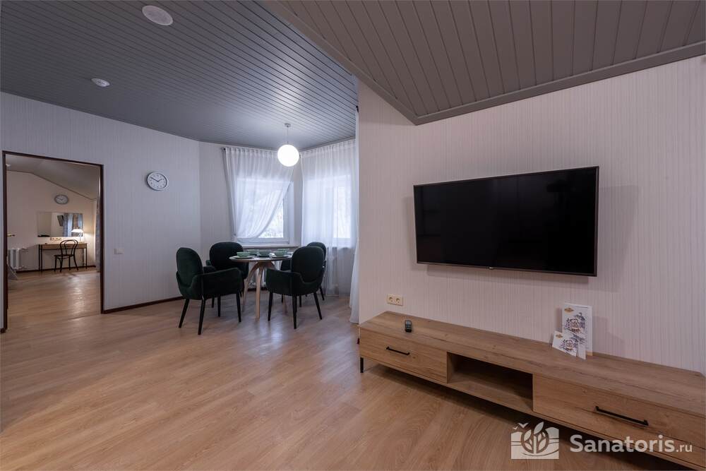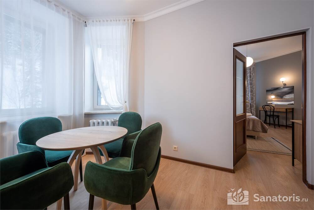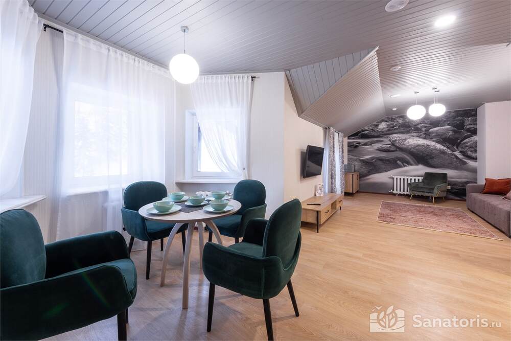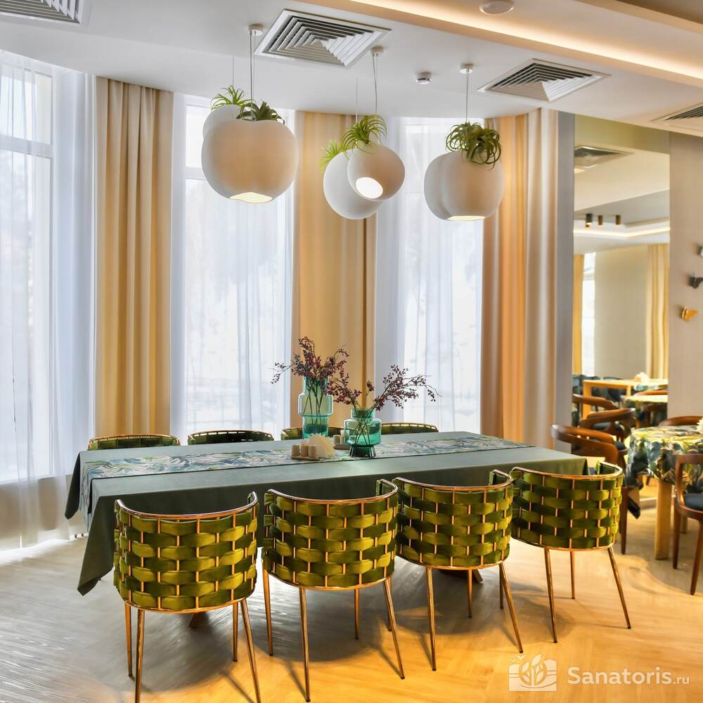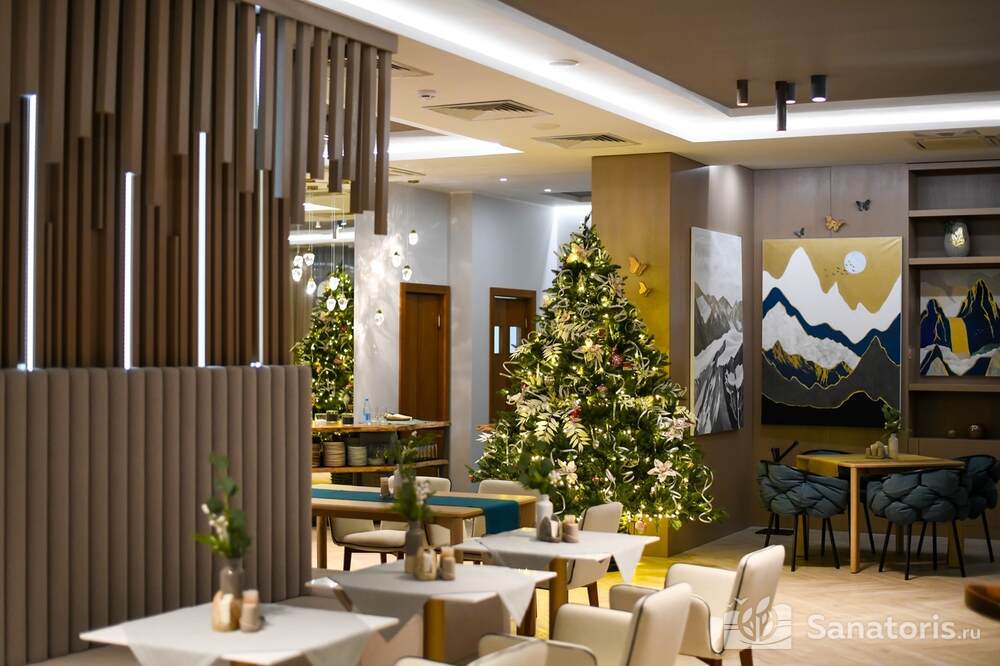 На территории здравницы есть изысканный ресторан. Он рассчитан на 16 человек. Возле ресторана есть каминный зал. Заказывать блюда можно из меню. Для приготовления изысканных блюд применяют натуральные продукты, которые доставляют местные фермеры.