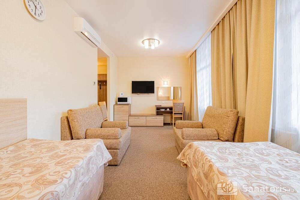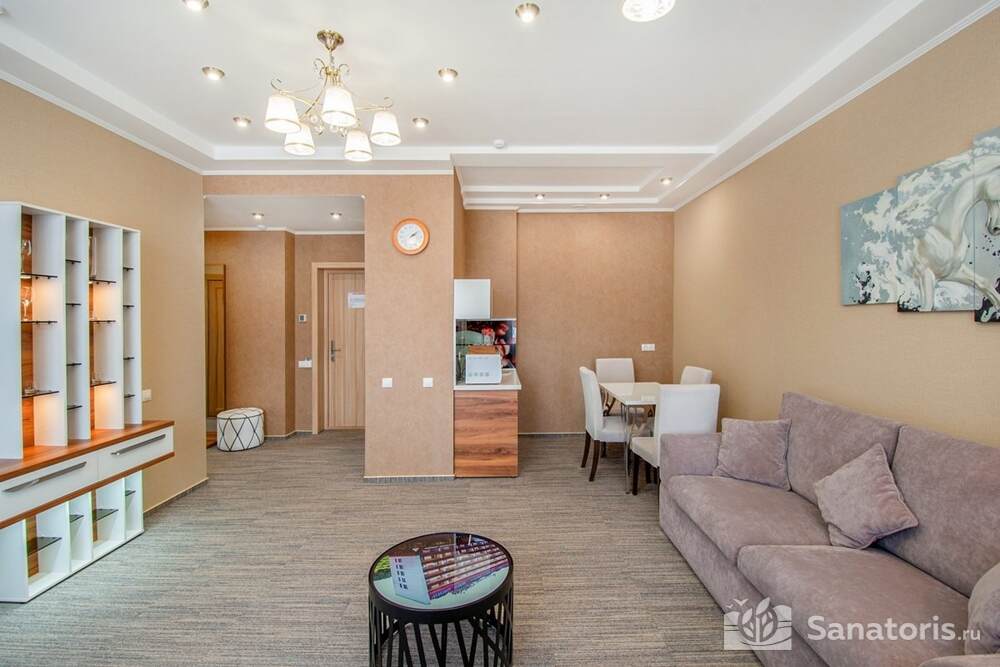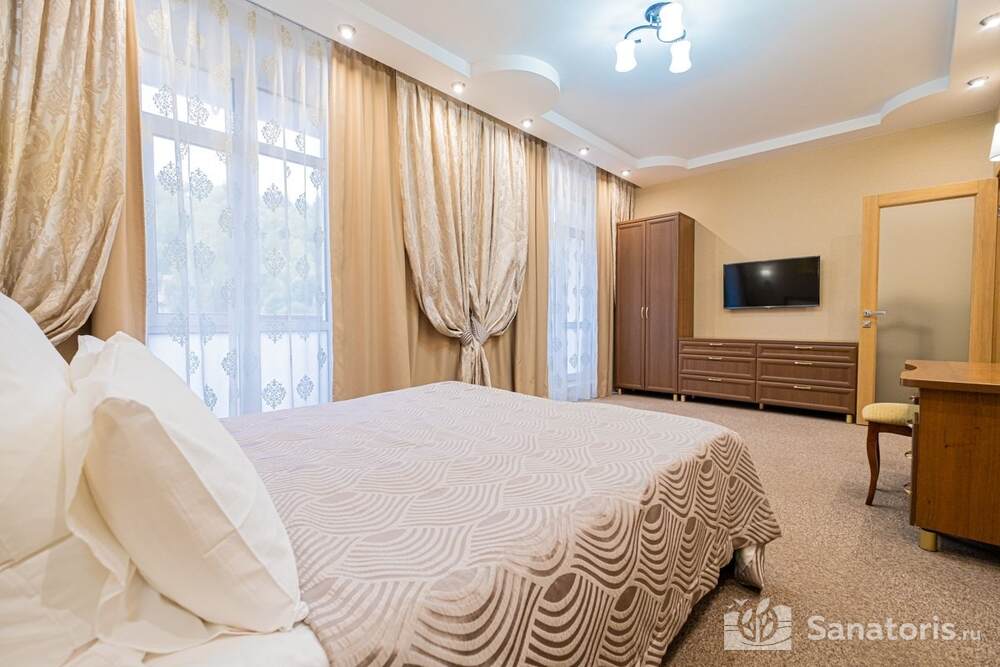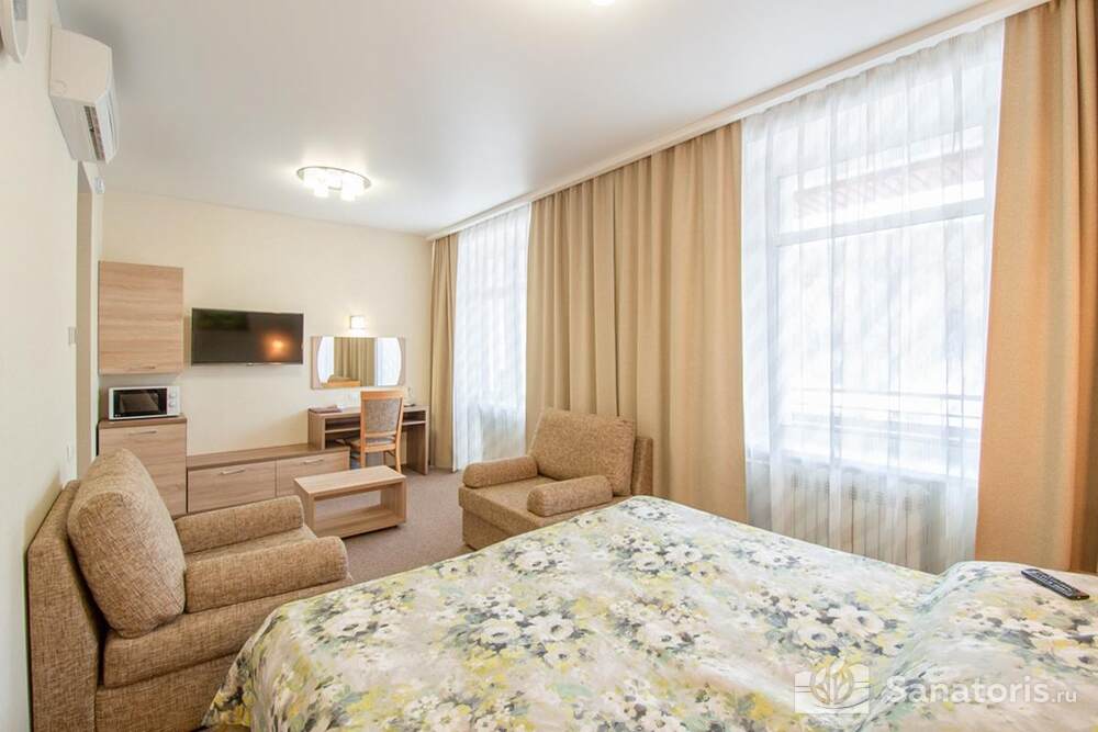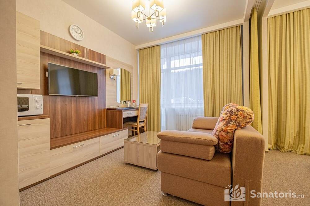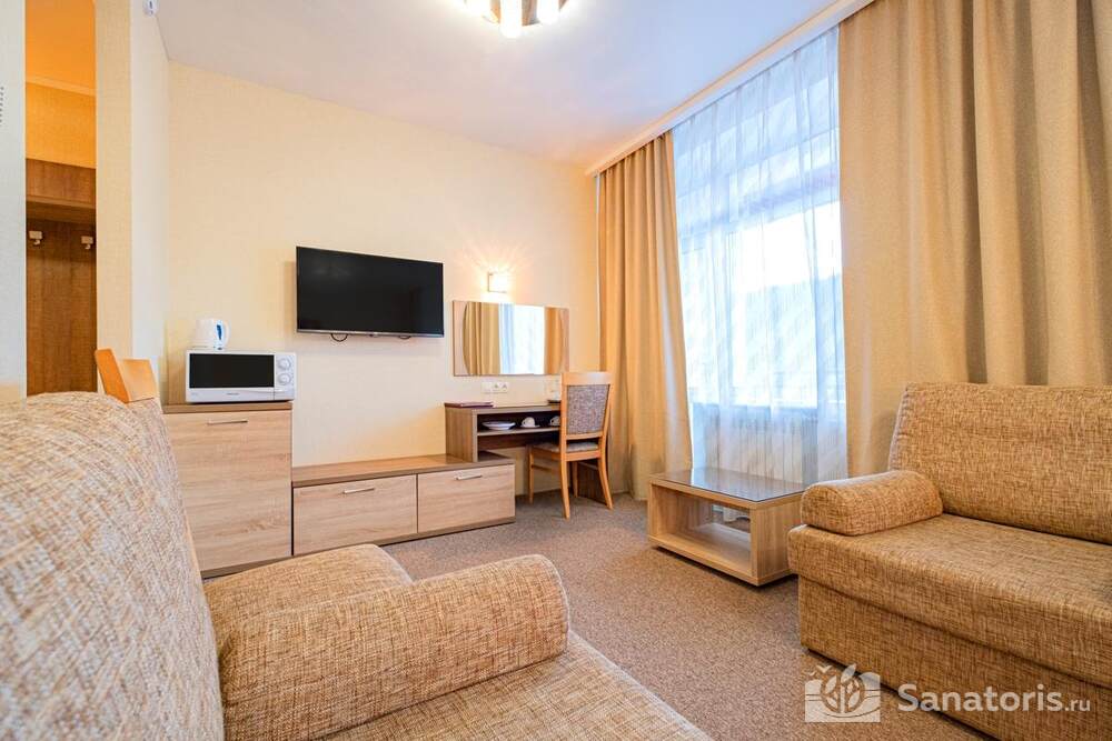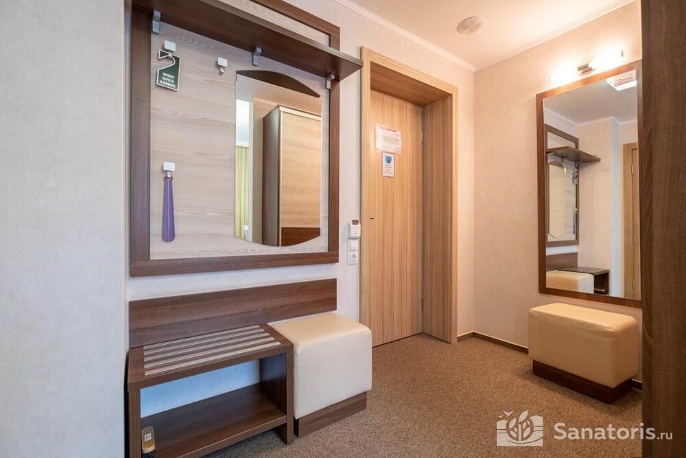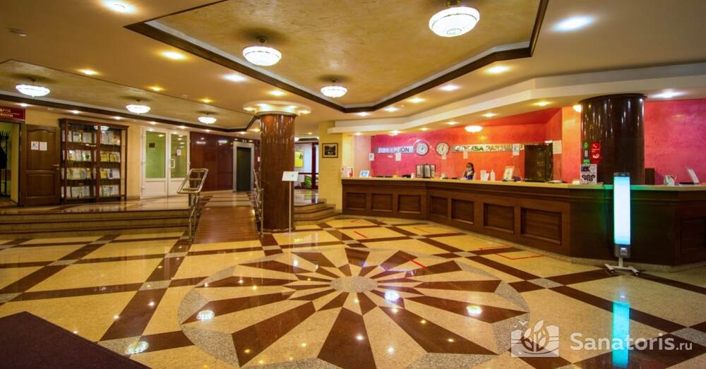 На территории санатория имеется восьмиэтажный жилой корпус, ресторан и медицинский центр. Между этими сооружениями есть теплые переходы. В здании есть бесшумный лифт. Территория комплекса утопает в зелени. Здесь растет много кустов, деревьев и цветов. В парковой зоне обустроены деревянные скамейки.