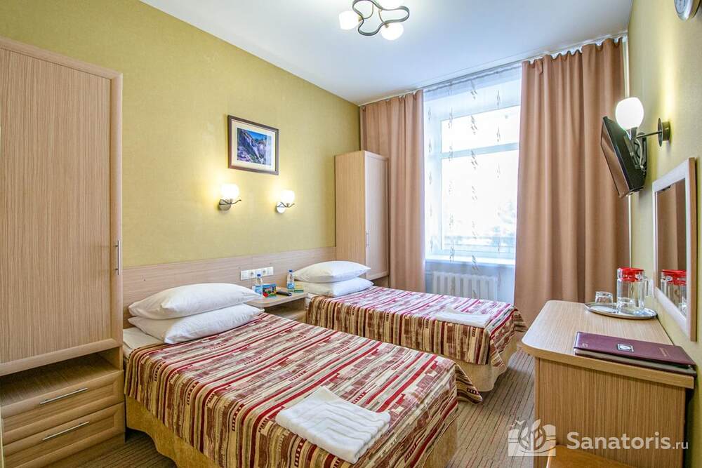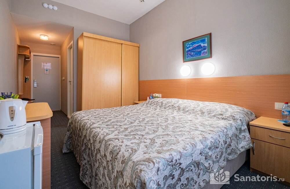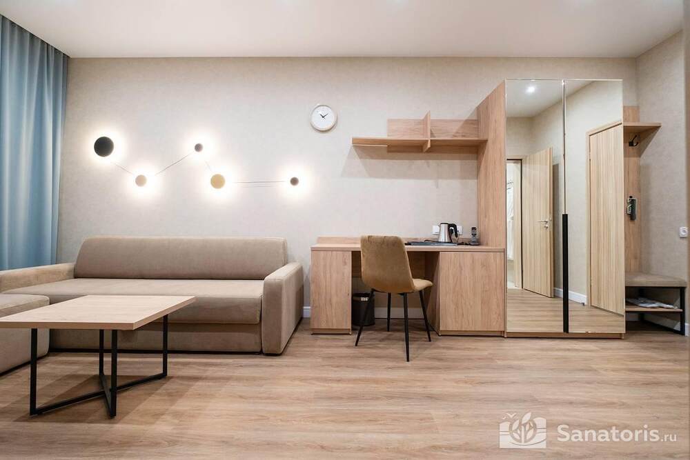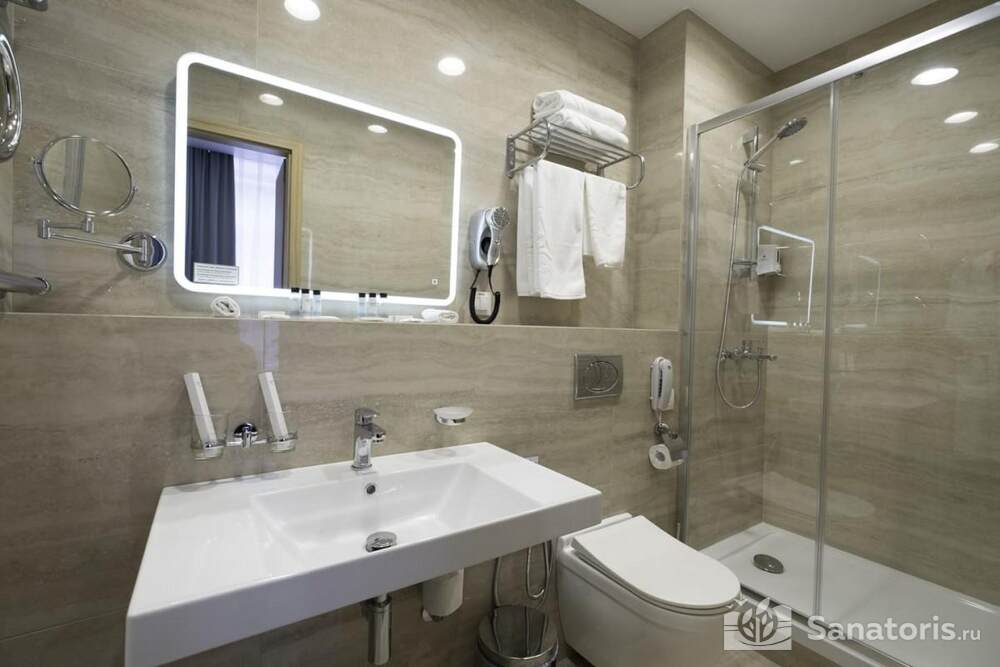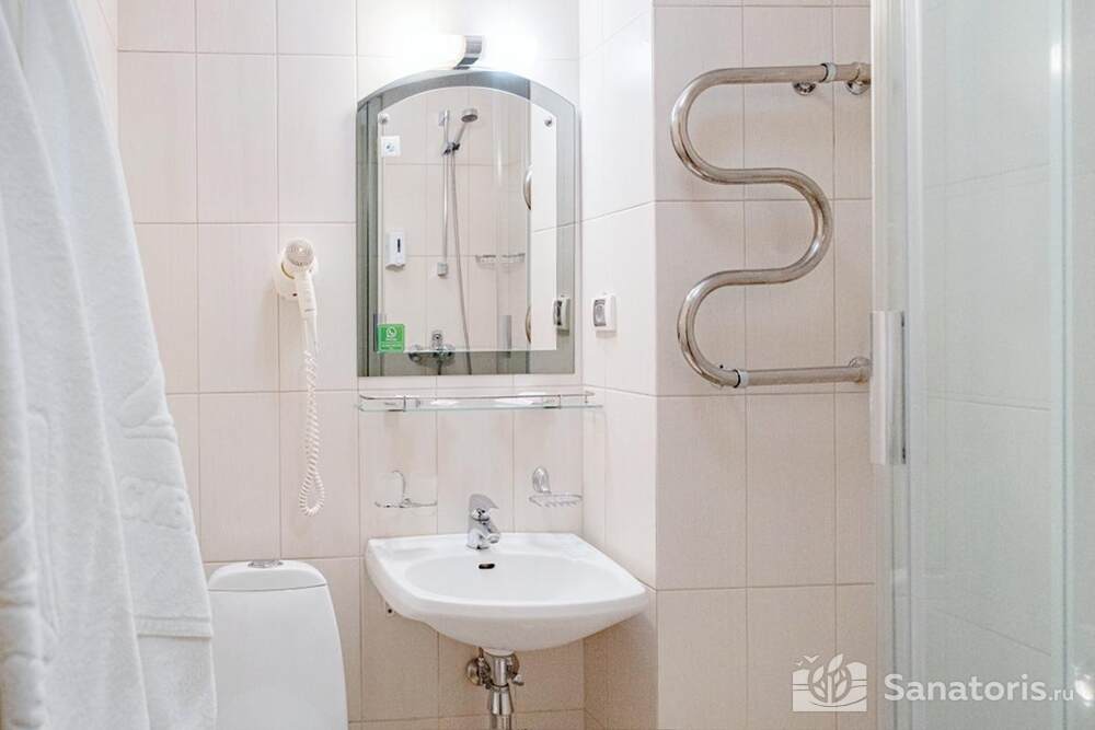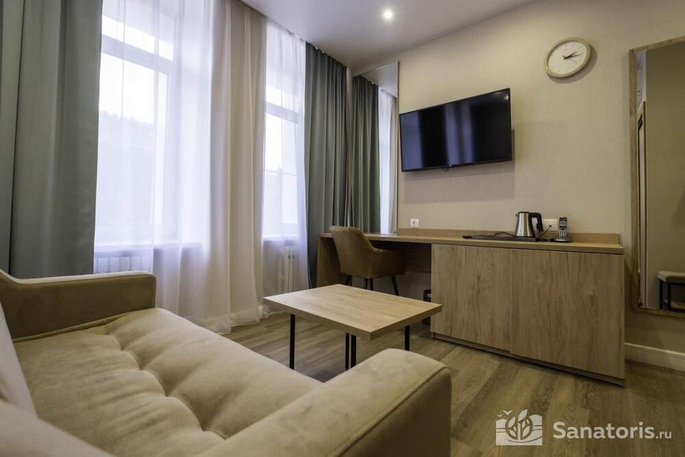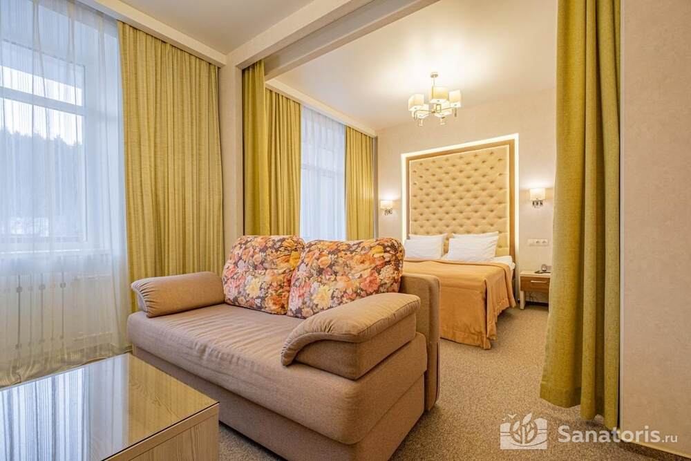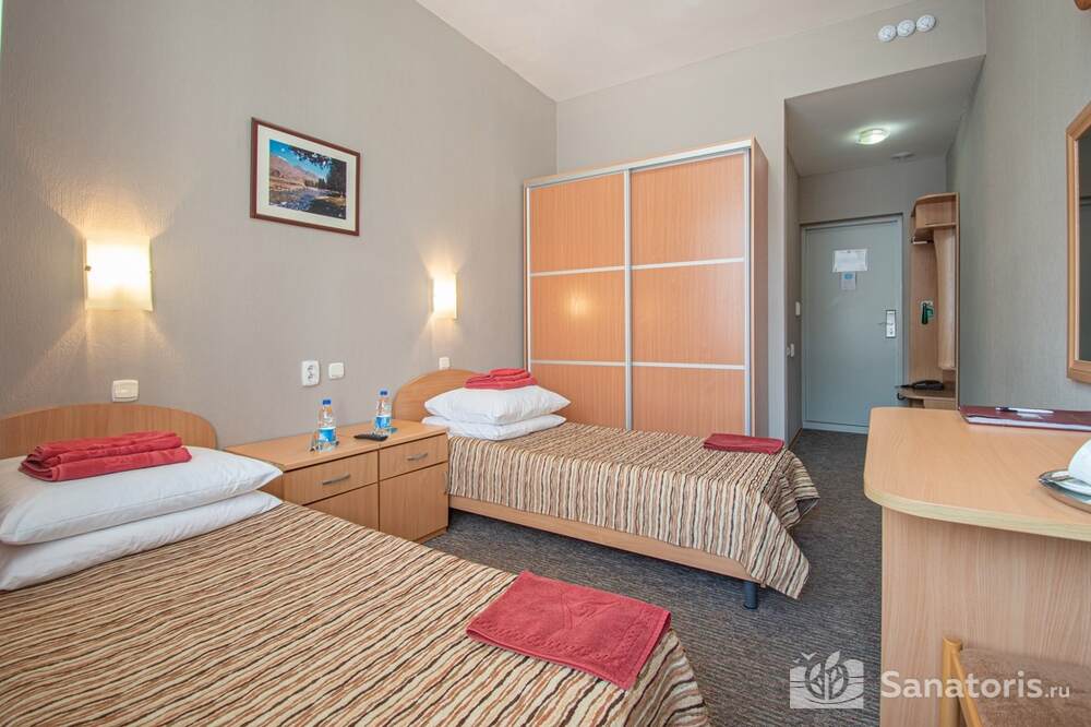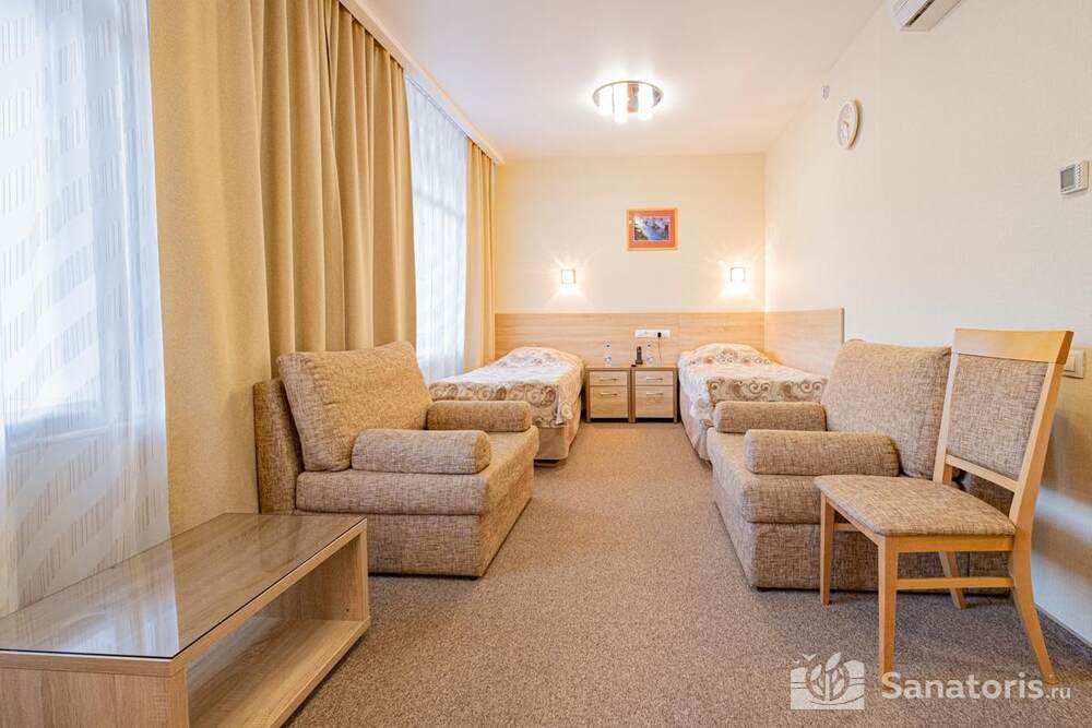 На территории санатория имеется восьмиэтажный жилой корпус, ресторан и медицинский центр. Между этими сооружениями есть теплые переходы. В здании есть бесшумный лифт. Территория комплекса утопает в зелени. Здесь растет много кустов, деревьев и цветов. В парковой зоне обустроены деревянные скамейки.