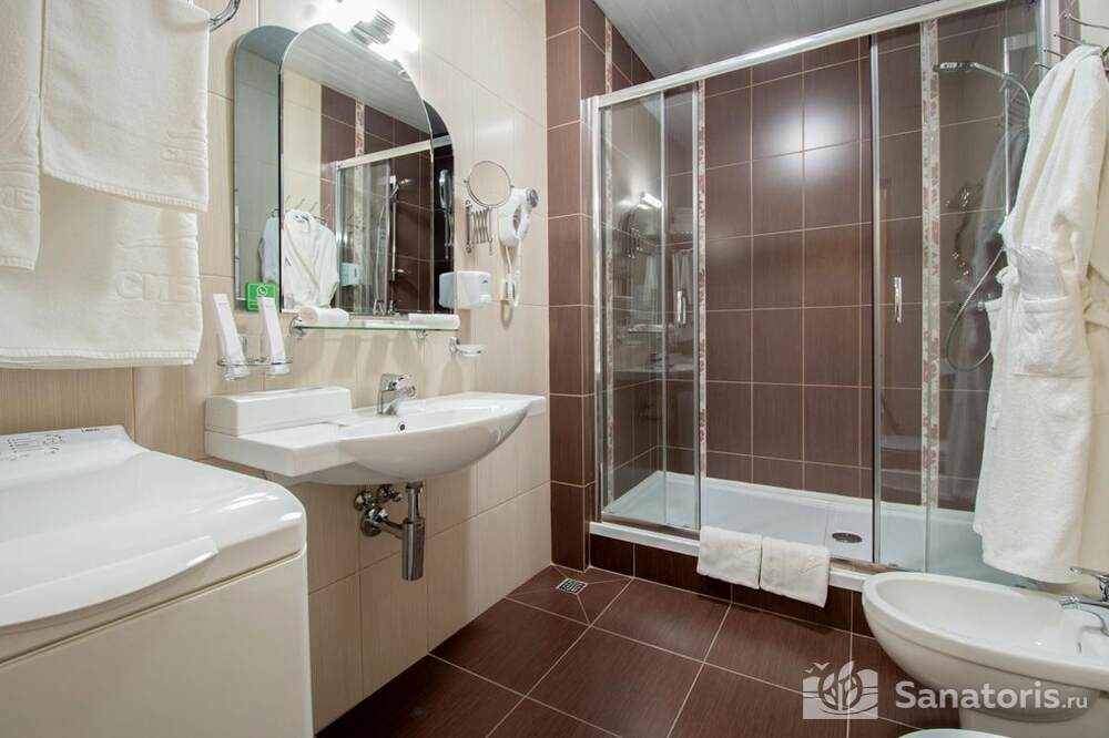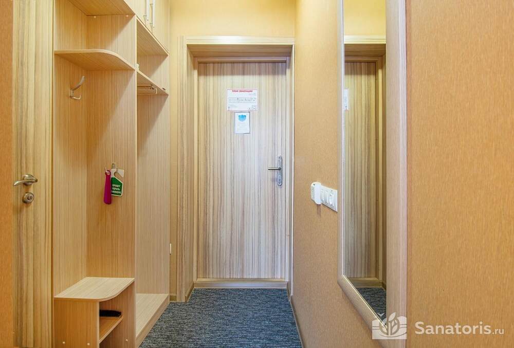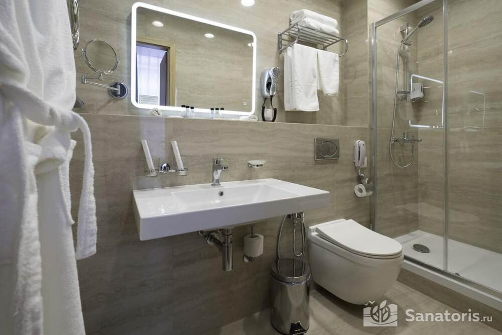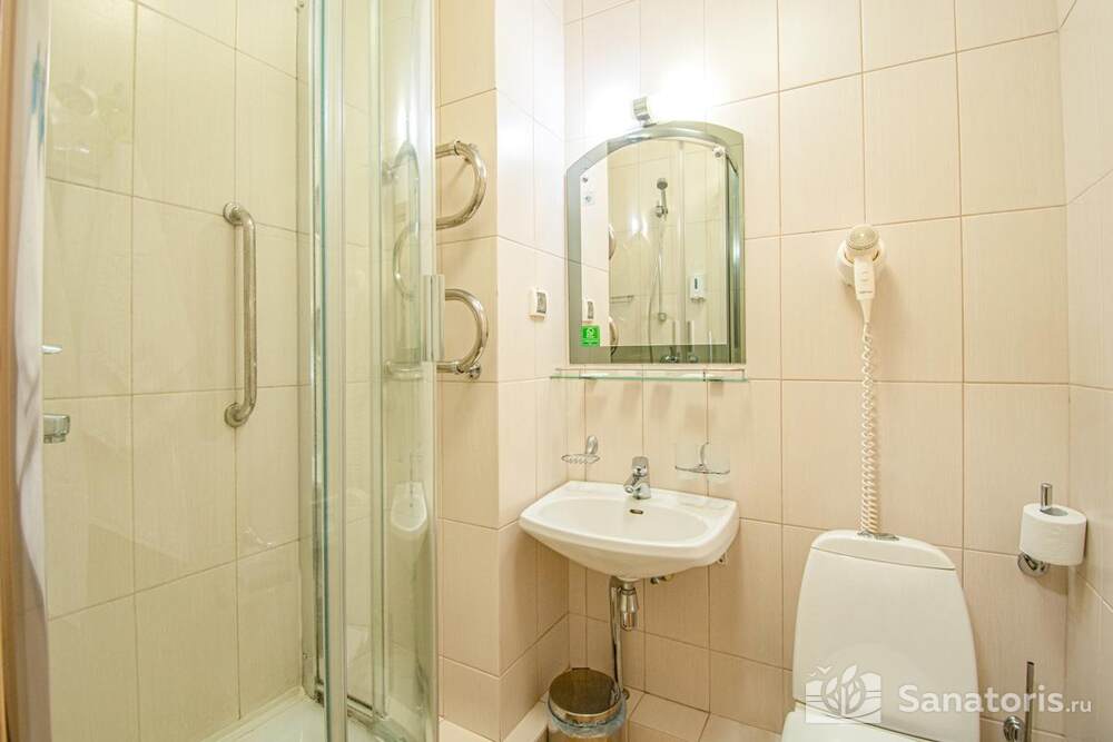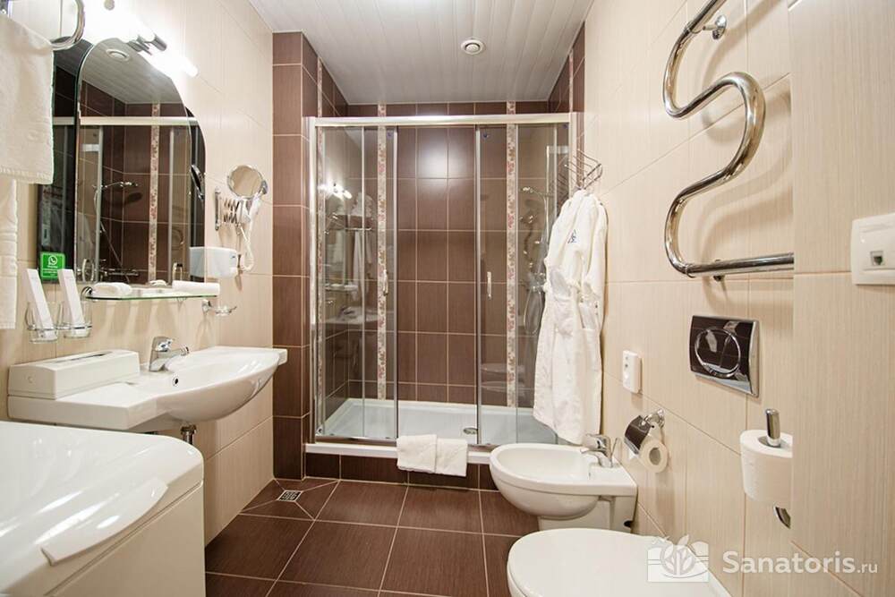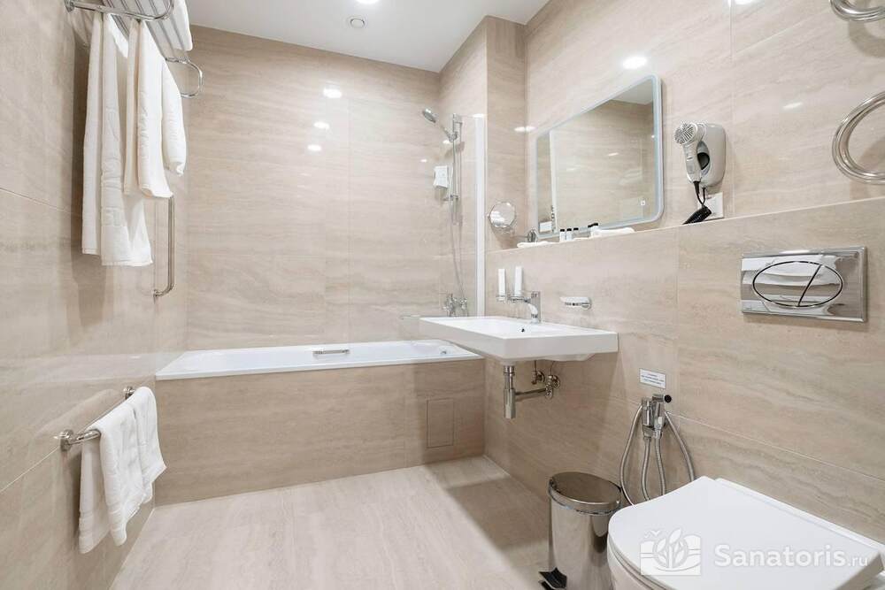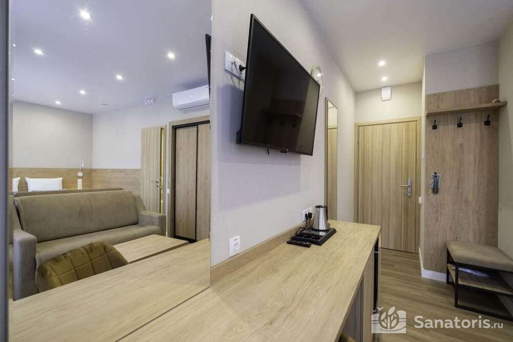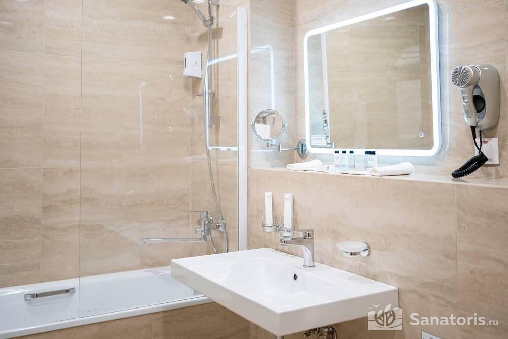 На территории санатория имеется восьмиэтажный жилой корпус, ресторан и медицинский центр. Между этими сооружениями есть теплые переходы. В здании есть бесшумный лифт. Территория комплекса утопает в зелени. Здесь растет много кустов, деревьев и цветов. В парковой зоне обустроены деревянные скамейки.