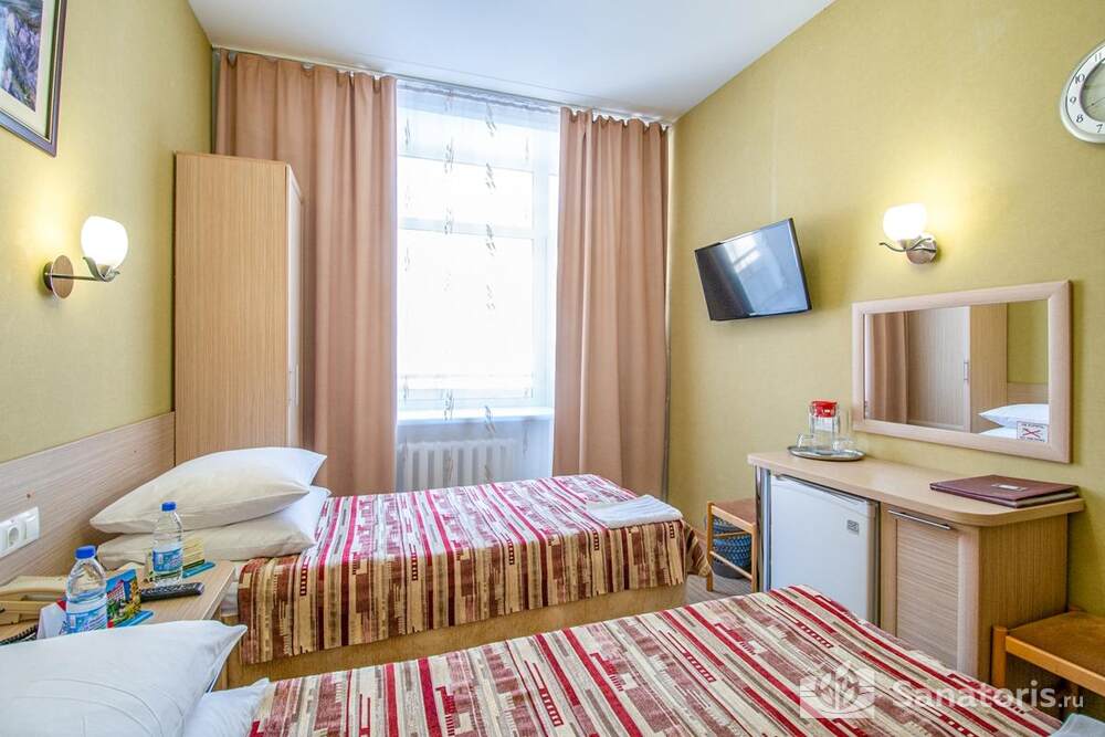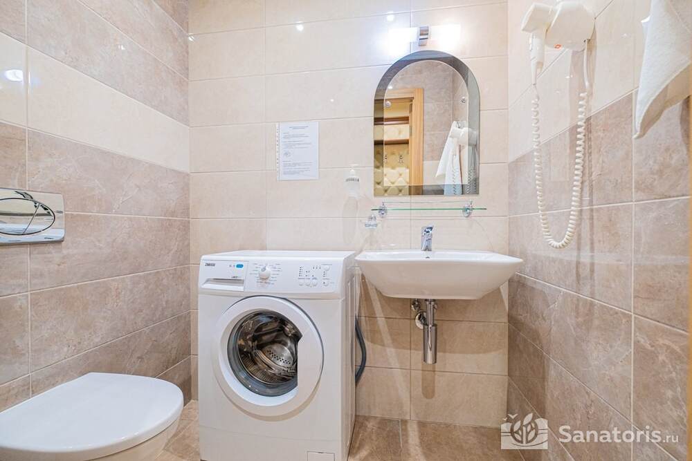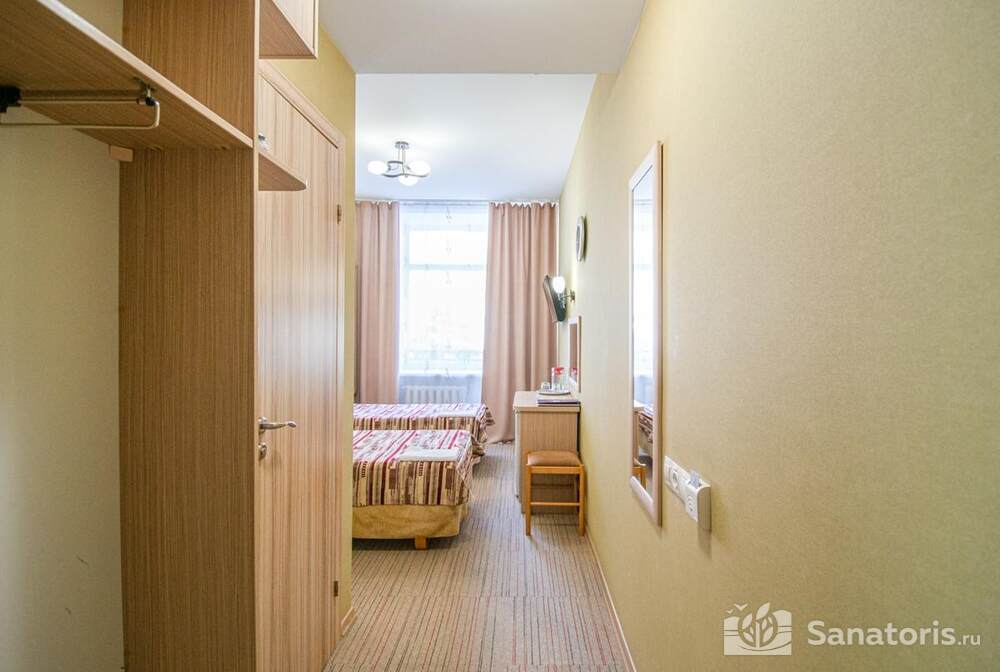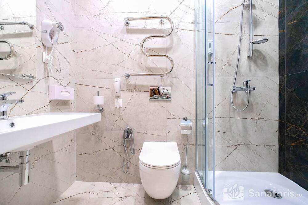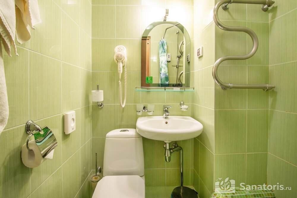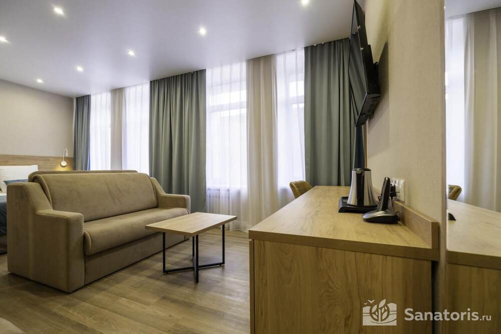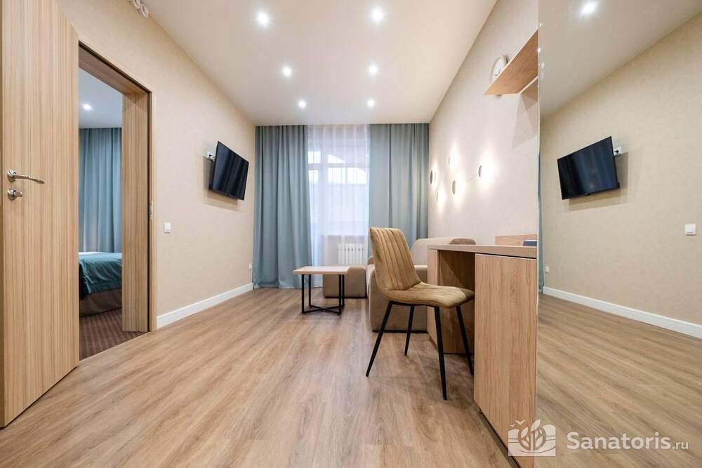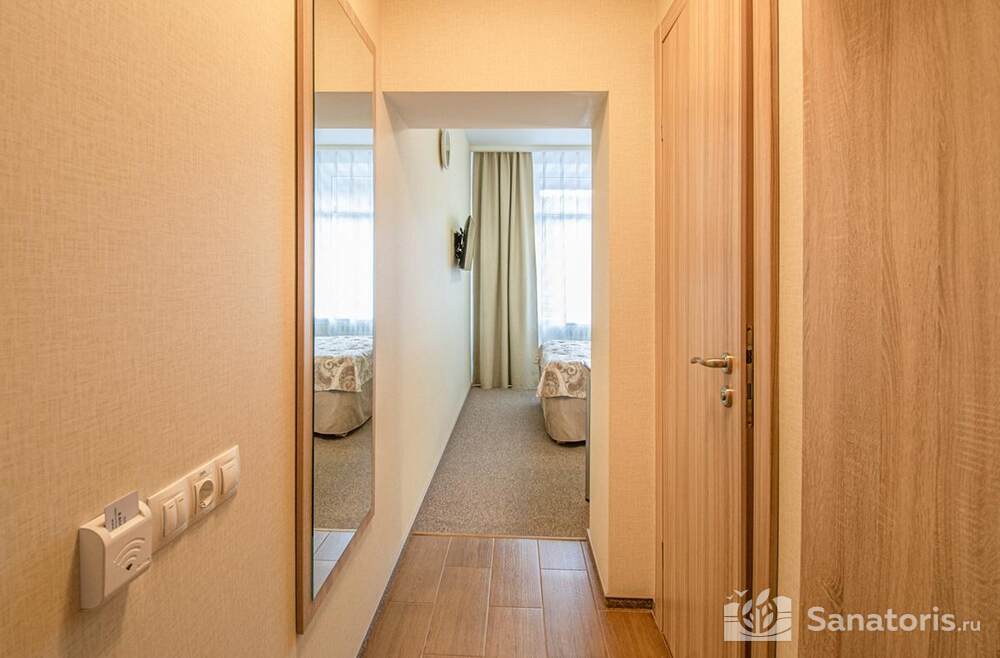 На территории санатория имеется восьмиэтажный жилой корпус, ресторан и медицинский центр. Между этими сооружениями есть теплые переходы. В здании есть бесшумный лифт. Территория комплекса утопает в зелени. Здесь растет много кустов, деревьев и цветов. В парковой зоне обустроены деревянные скамейки.