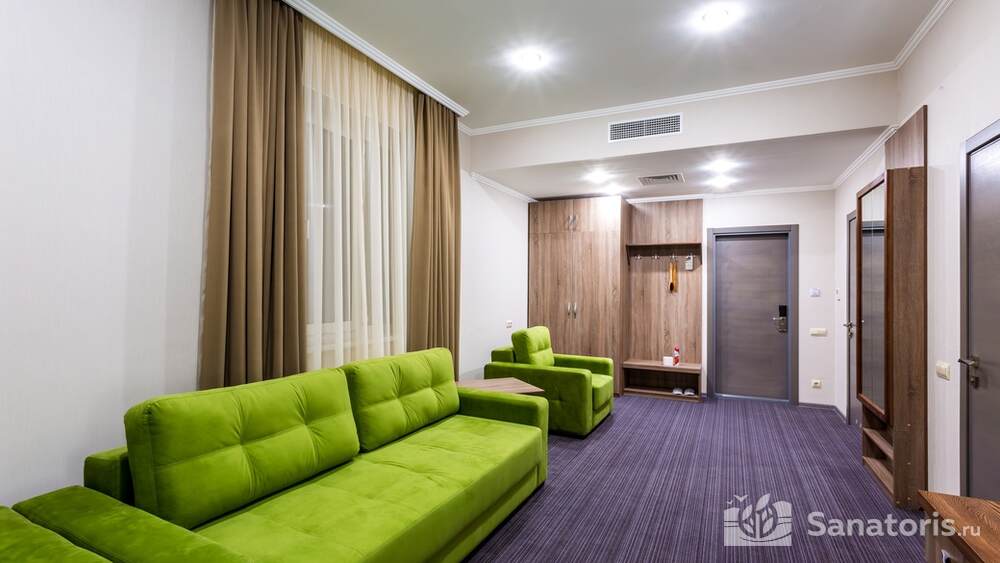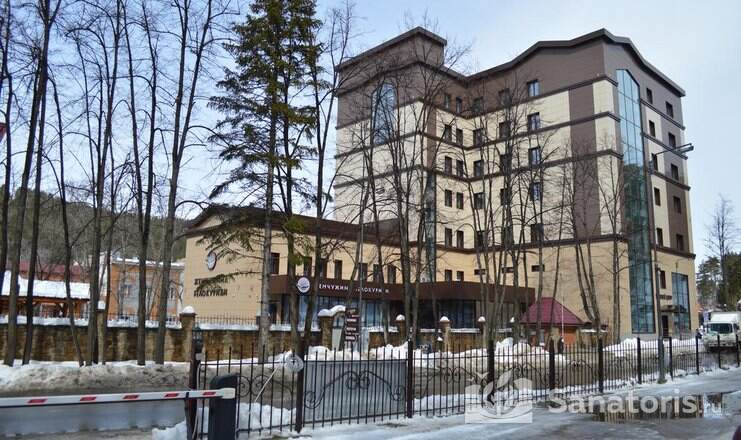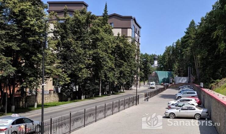 Территория новой здравницы оборудована так, чтобы было комфортно гостям курорта. Здесь и отдельный вход в корпуса, и огороженные участки для прогулок, и фонтан. Строительство гостиничного комплекса шло с учетом удобства для посетителей. Он возведен на стыке улицы Славской и «Ореховой аллеи». Рядом: