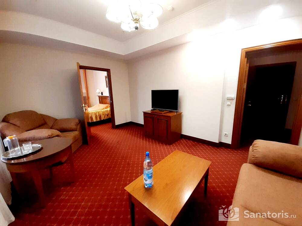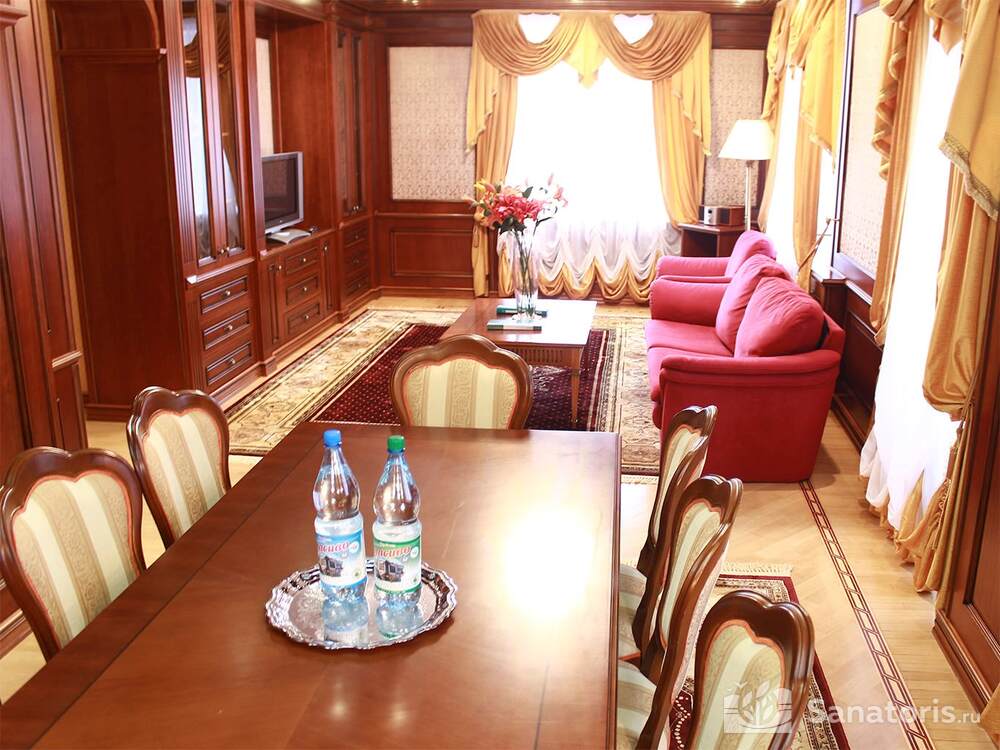 Четырехразовое питание постояльцев осуществляется в шикарном ресторане по системе «заказ-меню». Есть обычные и диетические блюда. Диету подбирает доктор с учетом имеющихся заболеваний. Так же на территории комплекса работает уютное кафе. Здесь можно насладиться прохладительными напитками, вкусными блюдами европейской и национальной кухни.