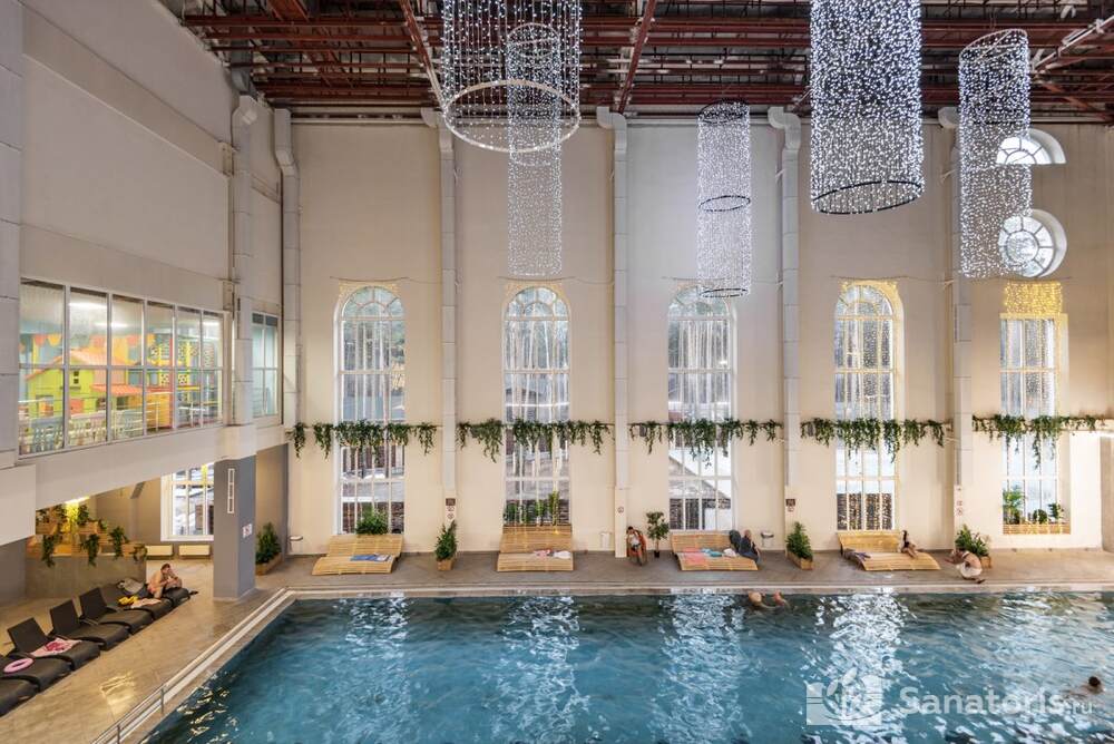 В термальном корпусе есть детский бассейн с подогревом и аквапарком. По соседству работают сауны. На цокольном ярусе работают бассейны с морской и соляной водой, есть музыкальный бассейн. Здесь же работает банный комплекс, где представлены бани разных народов мира. На улице есть дополнительные бани.
