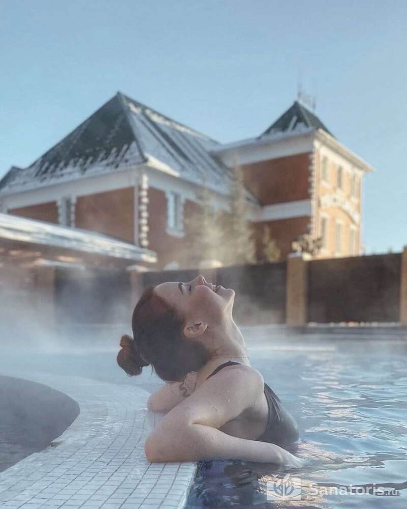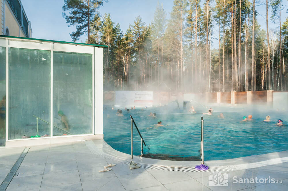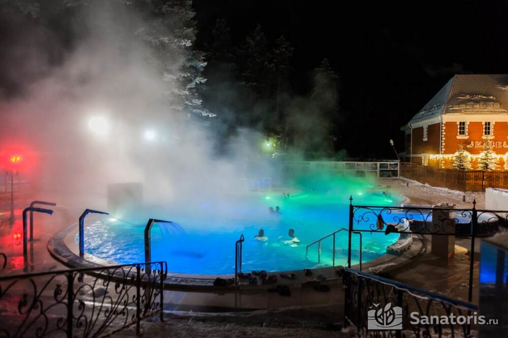 Есть два огромных бассейна с термальной водой. Температура воды в них составляет около 40 градусов. Берут минеральную воду из собственного бювета. Рядом с бассейном оборудованы водопады и гейзер. Летом здесь ставят лежаки.