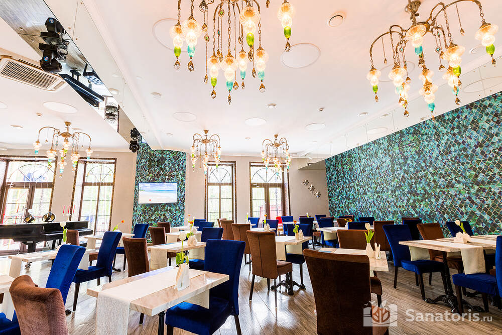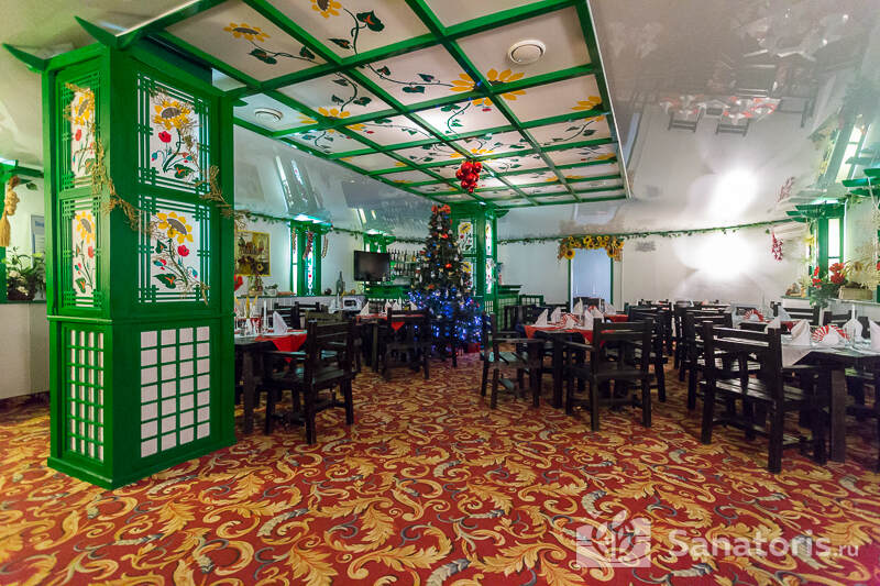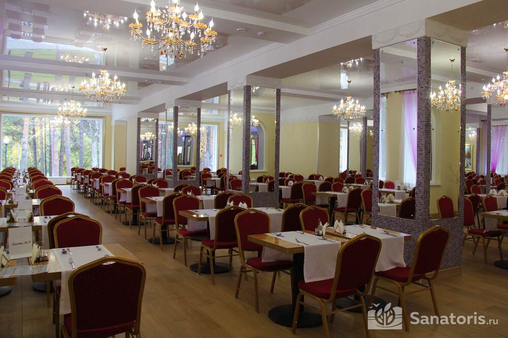 Гости оздоровительного комплекса обеспечиваются комплексным питанием 3 раза в день. Есть заказное меню и шведский стол. В просторном ресторане царит атмосфера уюта и тепла. Дополнительно на территории санатория функционирует кафе и бар.
