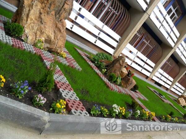 Территория оздоровительного комплекса ухоженная и благоустроенная. Главный корпус состоит из 6 этажей. Здесь расположен пищевой блок, зимний сад на крайнем этаже. По соседству обустроен медицинский центр, который соединяется с основным корпусом.