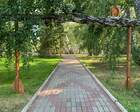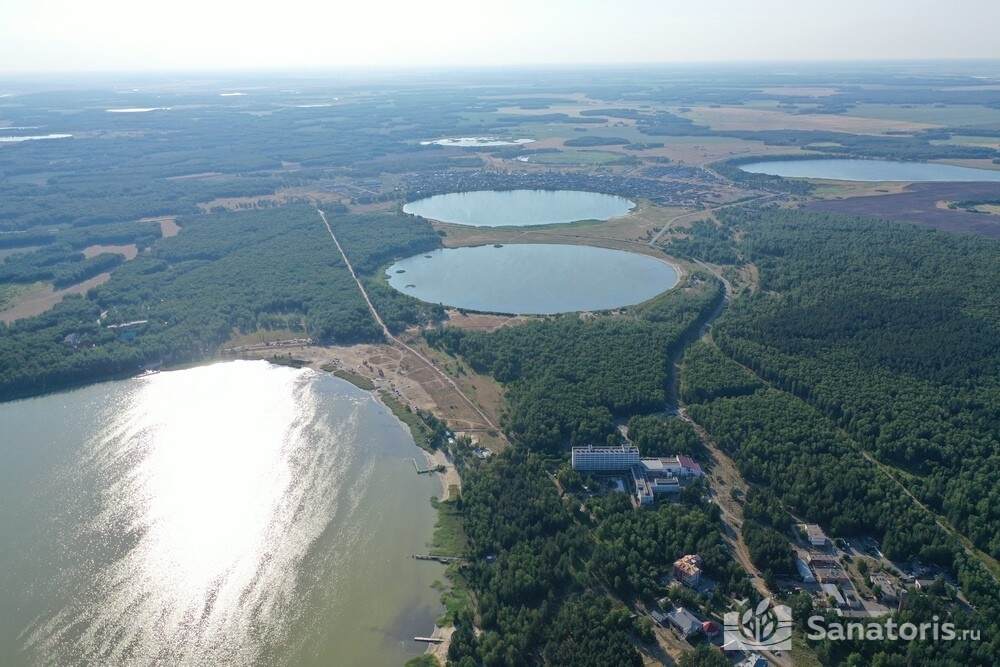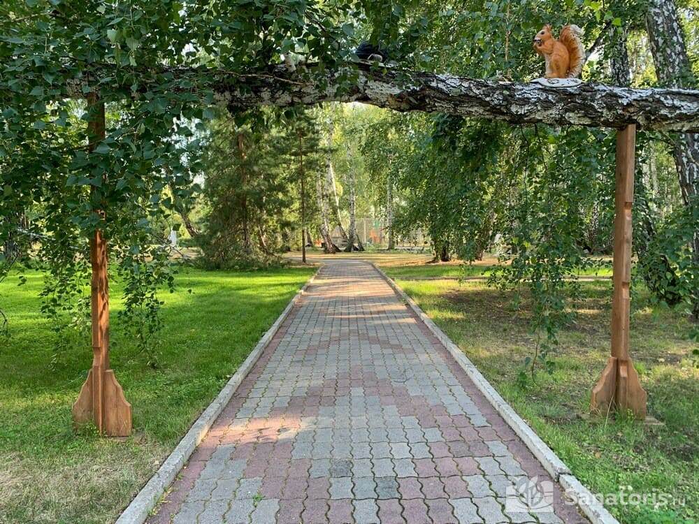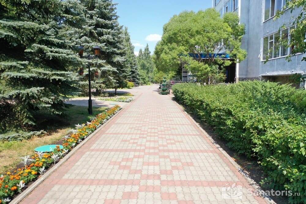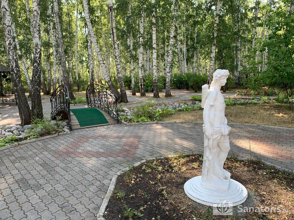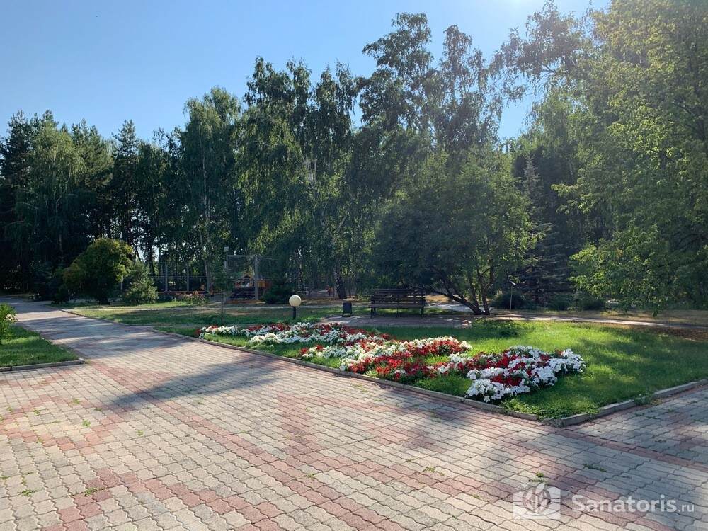 Общая площадь здравницы составляет 13 гектаров. Находится она в лесопарковой зоне. На территории комплекса произрастает множество декоративных кустарников, деревьев и цветов. На ухоженных газонах вымощены дорожки из натурального камня. Вечером включают освещение. Гости могут отдохнуть в тени деревьев и насладиться пением птиц. По всей территории установлено множество скамеек и уютных беседок. Есть небольшой мостик и открытый театр.