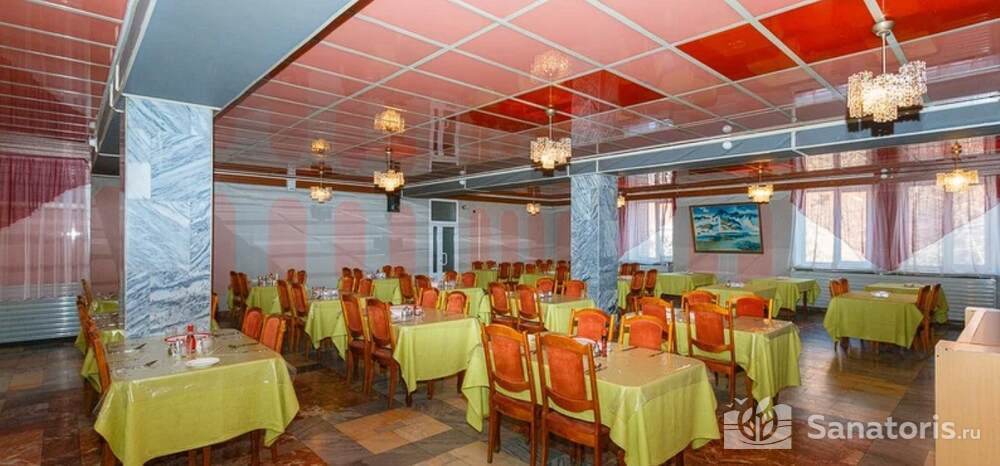Гости санатория питаются в большой столовой. Комплексное питание осуществляется три раза в день для взрослых и пять раз для детей. Есть диетическое и детское меню. Ежедневно в рационе присутствуют свежие овощи и фрукты. Изюминкой питания является кислородный коктейль и чаи из трав.