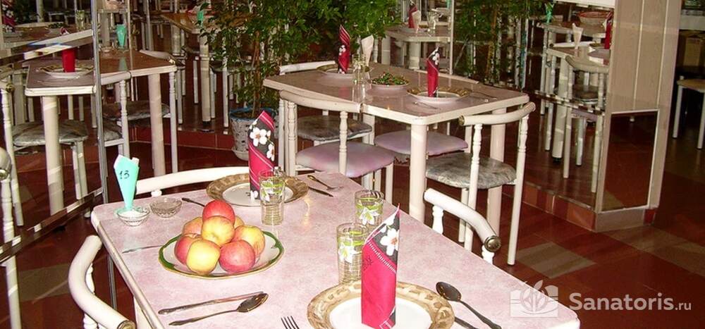 Гости санатория питаются в обеденном зале. Для взрослых предусмотрена система комплексного питания четыре раза в сутки. Детям предоставляется питание пять раз в сутки. В меню входят вкусные блюда европейской и национальной кухни. Ежедневно в рационе присутствуют свежие овощи и фрукты, рыба и мясо. Так же в столовой делают отличную выпечку. Гости могут выбрать общее или диетическое меню.