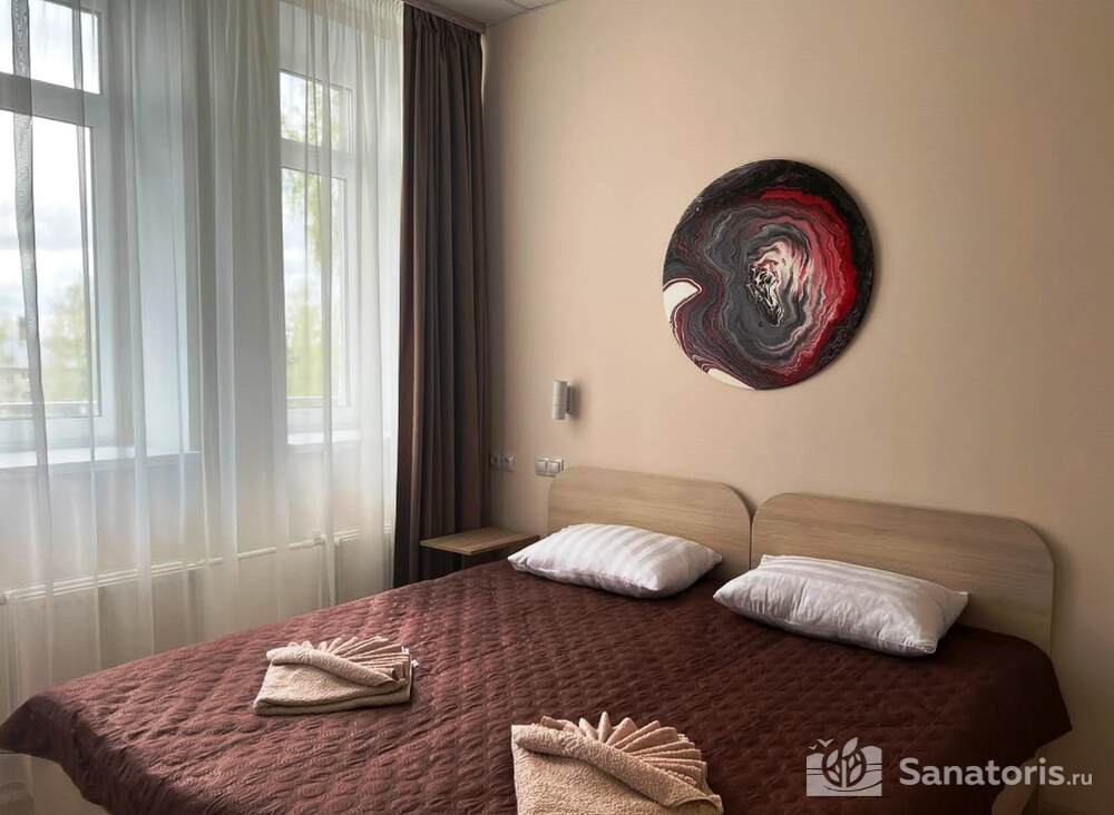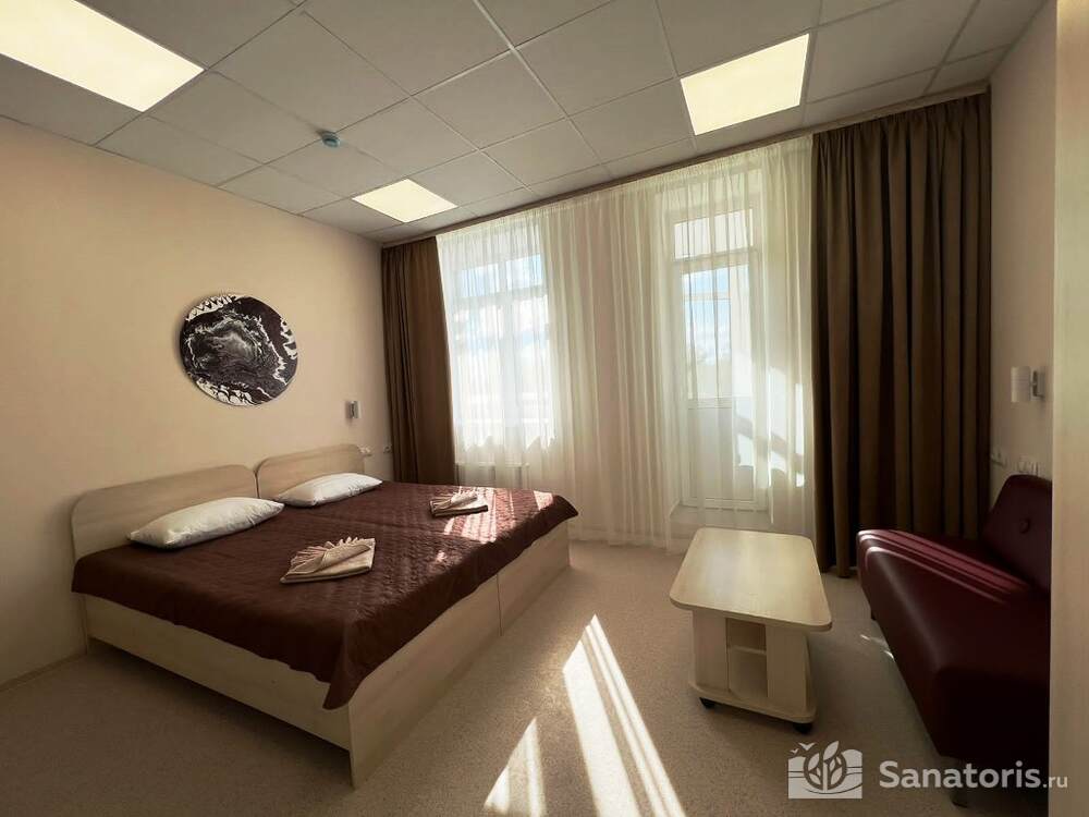 В санатории гостей ждет высокий уровень сервиса и комфортного проживания. На территории расположено 2 жилых корпуса и 8 коттеджных домиков, лечебный корпус и столовая. Жилой фонд включает в себя уютные номера различной категории, интерьер которых выполнен в светлых тонах, что создает ощущение спокойствия и умиротворения. Все номера имеют необходимый набор мебели и бытовой техники.