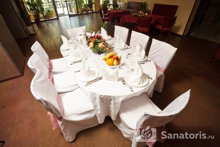 В отеле созданы условия и для умиротворенного отдыха, и для ведения дел, а также для квалифицированного лечения. В здании имеется 2 разных по площади актовых зала. Они оснащены необходимой мебелью, есть аппаратура для проведения презентаций.