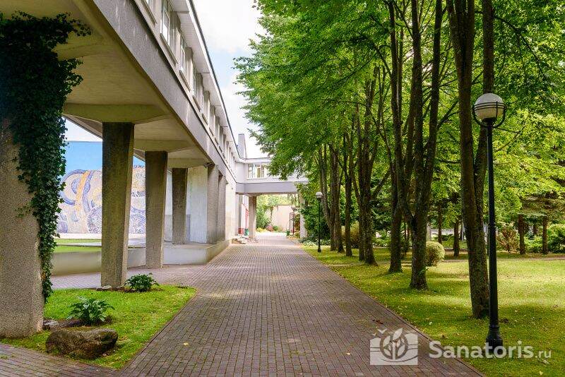 Санаторий облюбовал территорию лесопарка и окружен пышной зеленью. Находится на высоком берегу, высота его 45 м. К морю оборудован спуск с удобными лестницами.