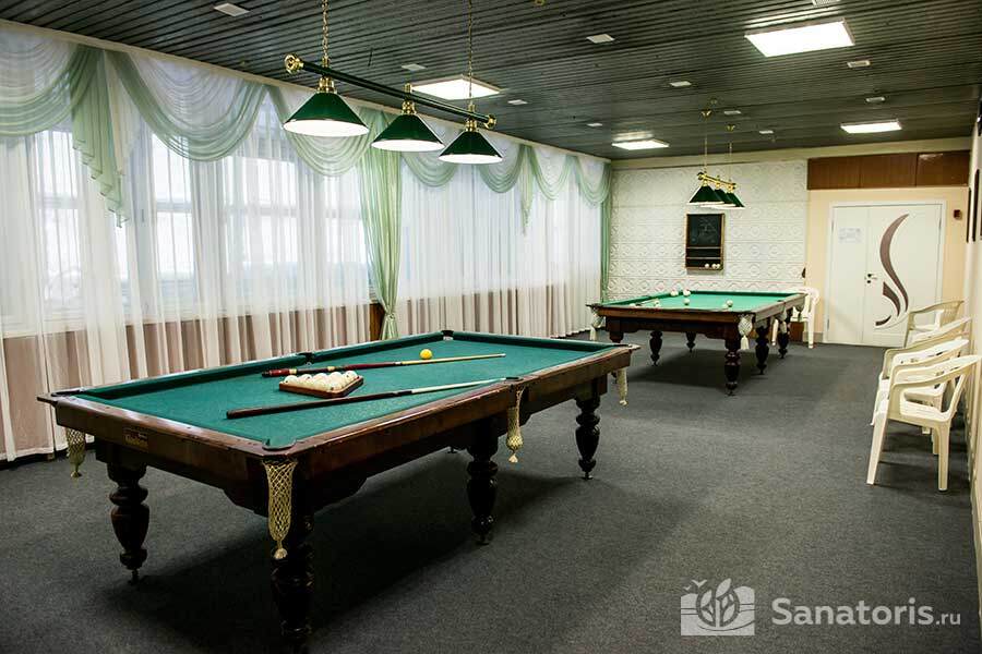 Так же на территории есть бильярд и тренажеры для занятий спортом.Тем гостям, которые любят петь обязательно придется по душе студия караоке.Летом на территории можно гулять в парковой зоне, после проведения лечебных процедур приходить на озеро и ловить рыбу.