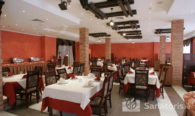 Гости комплекса питаются в изысканном ресторане. Подача блюд осуществляется по системе шведский стол. Ежедневно на столах присутствуют свежие овощи и фрукты. Дополнительно отдыхающие могут посетить бар, который расположен рядом с жилыми корпусами.