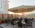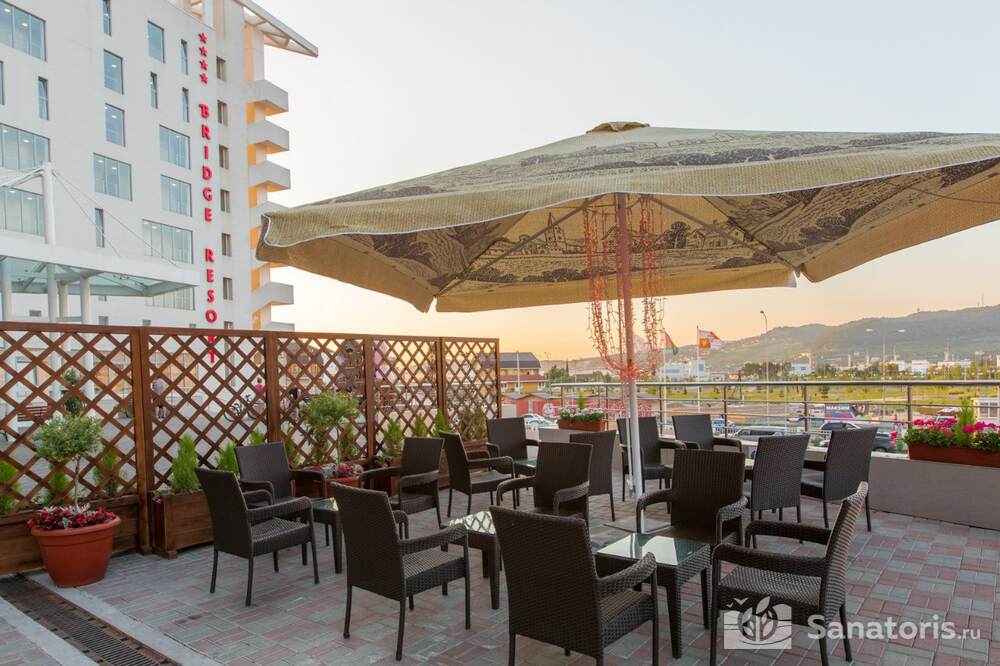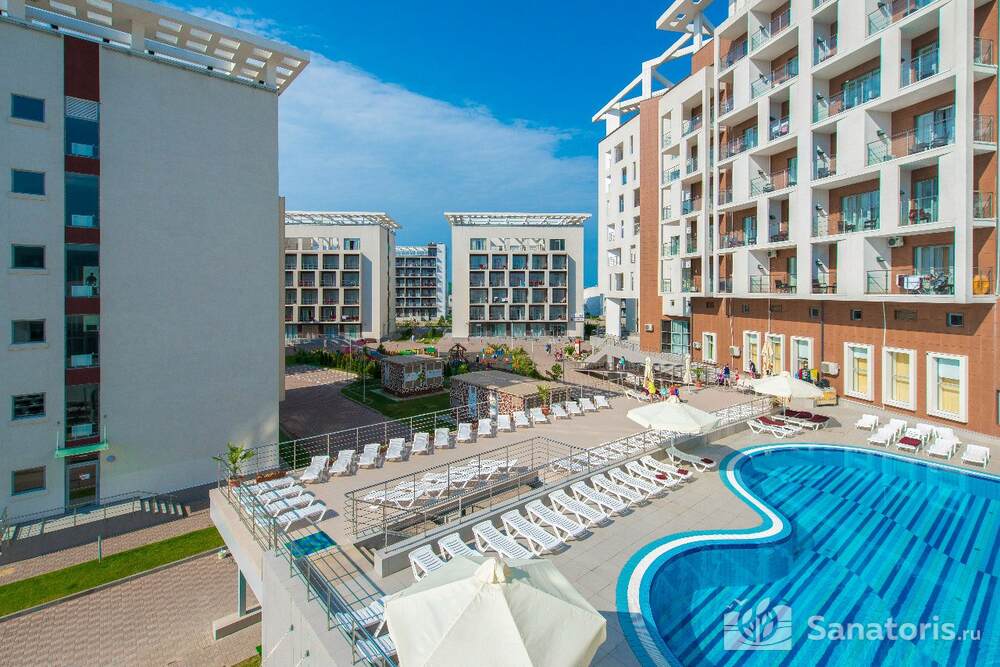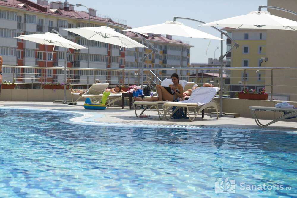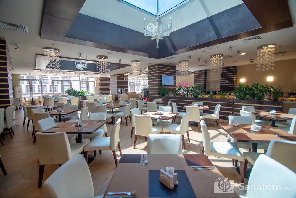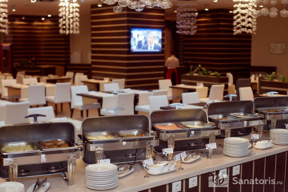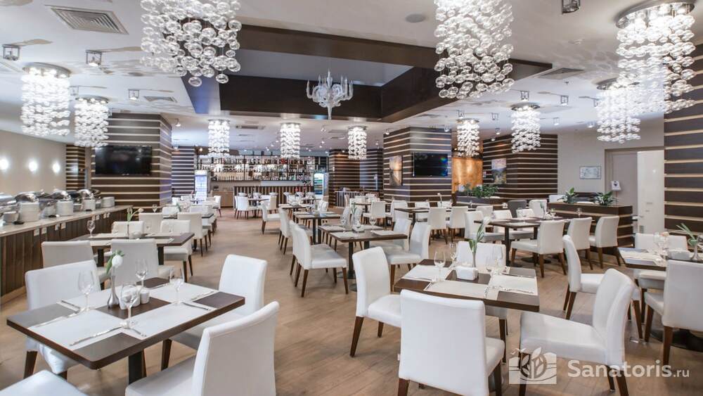 Отель располагает собственным рестораном. Постояльцы обеспечиваются комплексным питанием три раза в день. На территории курорта есть большой открытый бассейн, закрытый бассейн с подогревом, детский бассейн. Кроме этого работает аквацентр «Бриз».