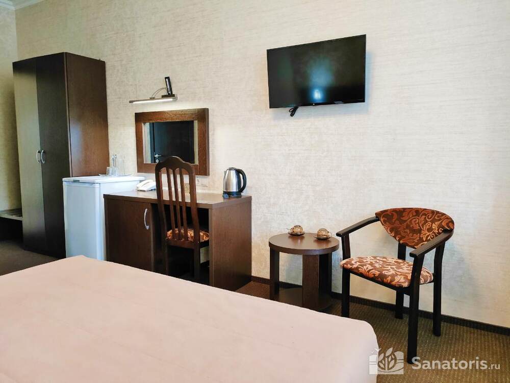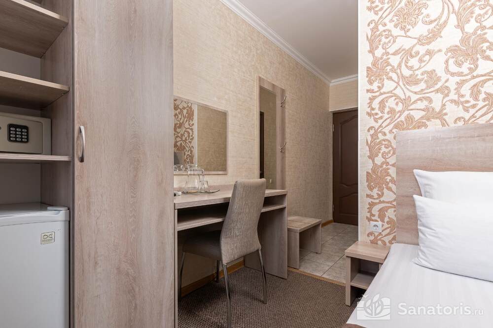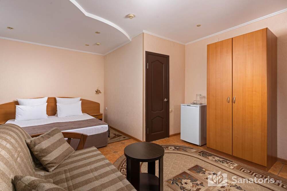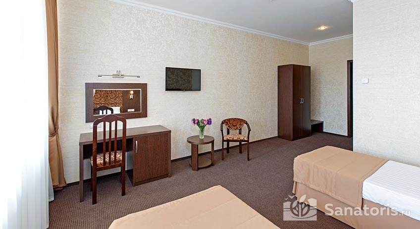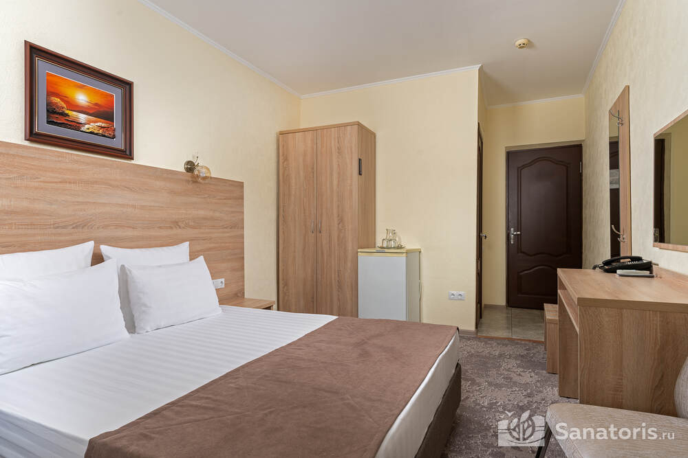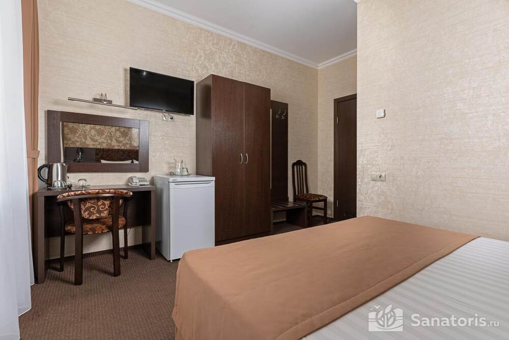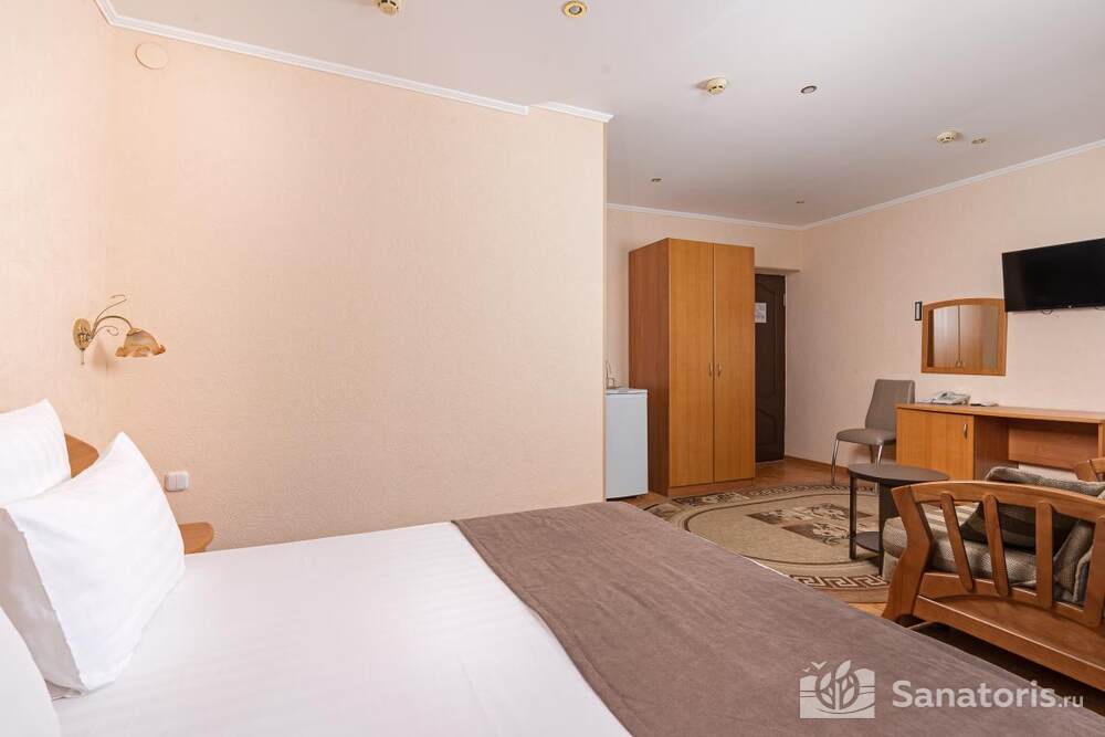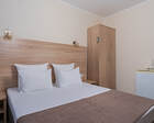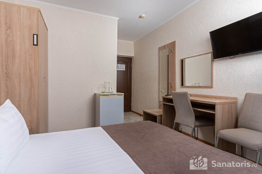 - Удобство в номере — в распоряжение предоставляется стандартный набор мебели: односпальные или двуспальные кровати, шкаф, стол и стулья. В некоторых номерах присутствует балкон. Также в комнате имеется холодильник, телевизор и чайная посуда.