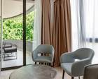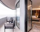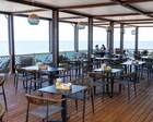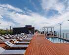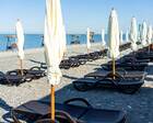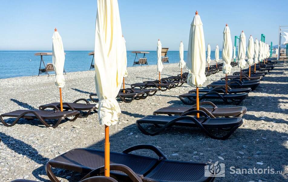 Пляж на береговой линии Черного моря оборудован шезлонгами и зонтиками для комфортного отдыха постояльцев в летнее время года.
