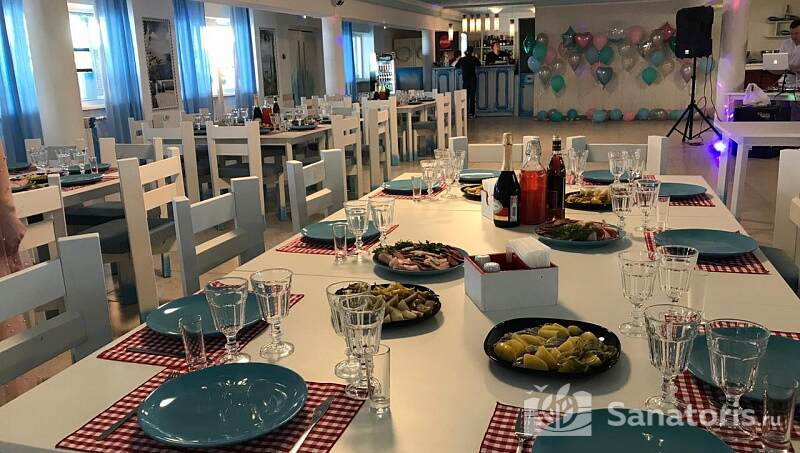 Питание постояльцев обеспечивается в столовой, которая оборудована отдельно от спальных корпусов. Здесь подают вкусные блюда европейской и национальной кухни. Кроме этого на территории пансионата работает шикарный ресторан, где подают разные деликатесы и напитки. Под открытым небом обустроена зона отдыха с мангалами и уютными беседками. Гости пансионата могут пожарить мясо и отдохнуть на свежем воздухе.
