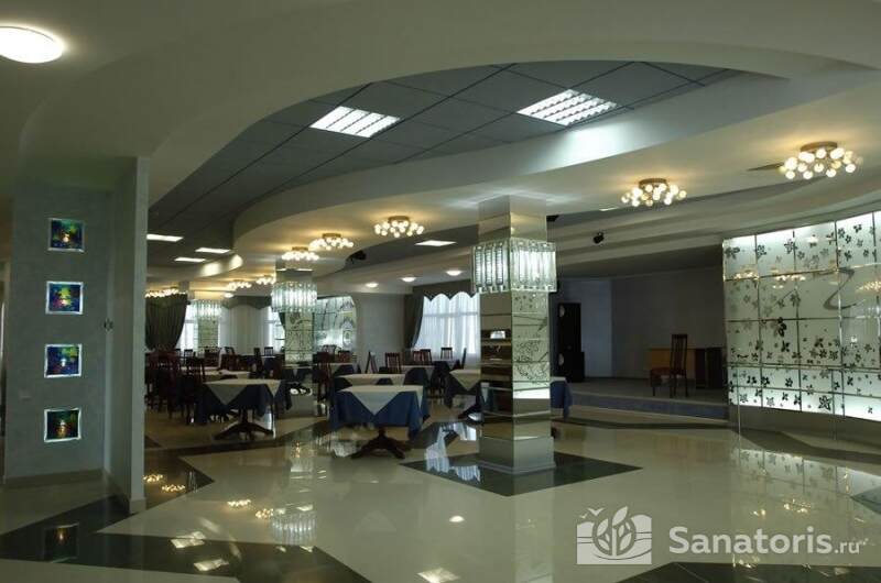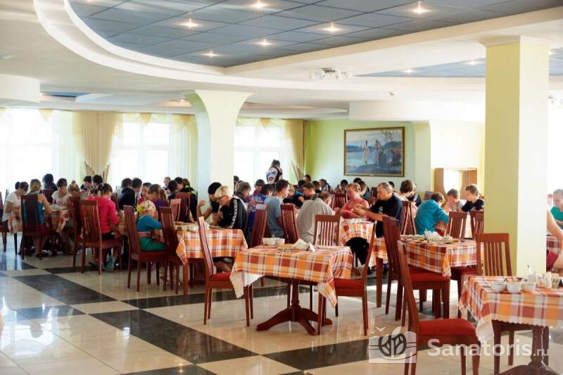 Питание гостей осуществляется в просторном обеденном зале. Все продукты готовятся исключительно из натуральных продуктов, которые доставляются в санаторий из местных фермерских хозяйств. Для детей разработано специальное меню. По назначению специалиста предлагают диетические блюда.