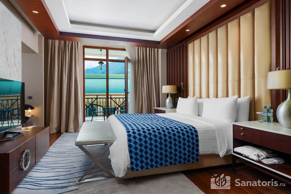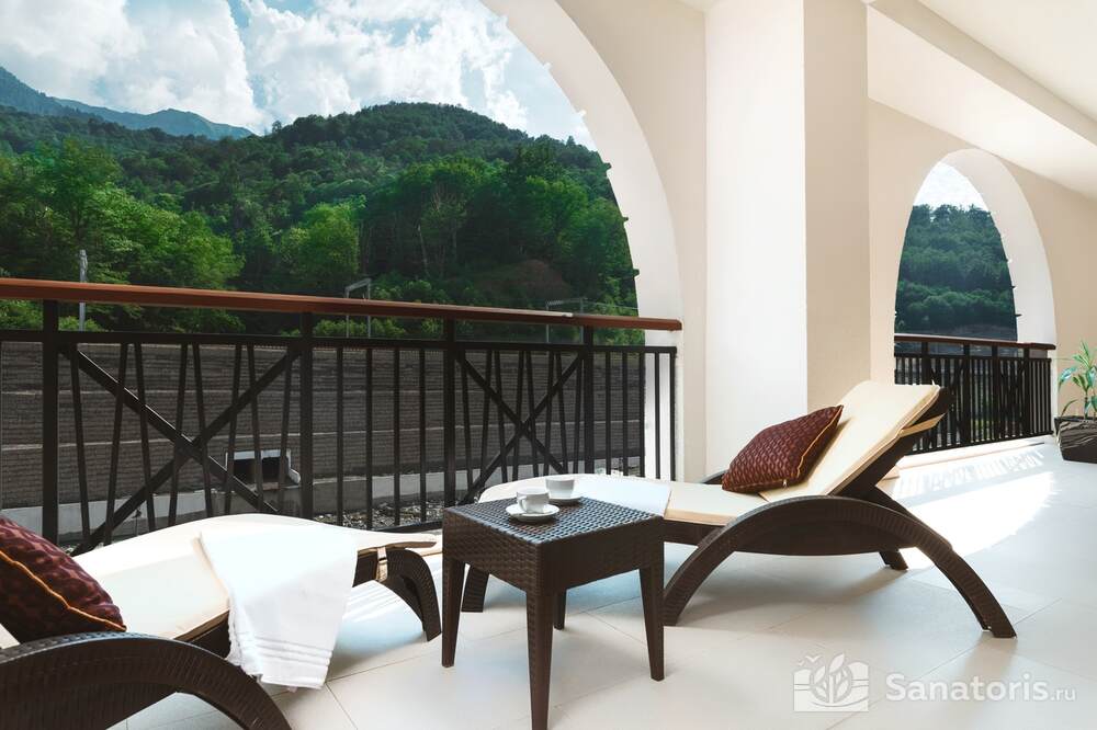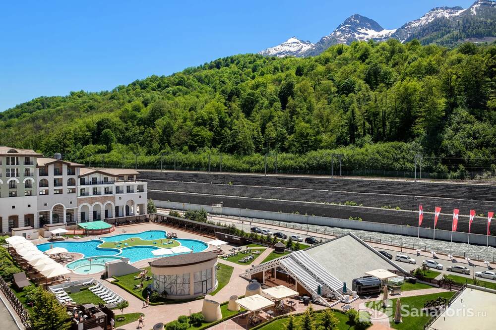 Пятизвездочный отель находится на высоте 380 метров над уровнем моря. Ближайший аэропорт расположен в городе Сочи. Расстояние до него составляет 40 километров. До берега Черного моря – 42 километра. Такое месторасположение курорта позволяет туристам насладиться тремя климатами и местами одновременно.