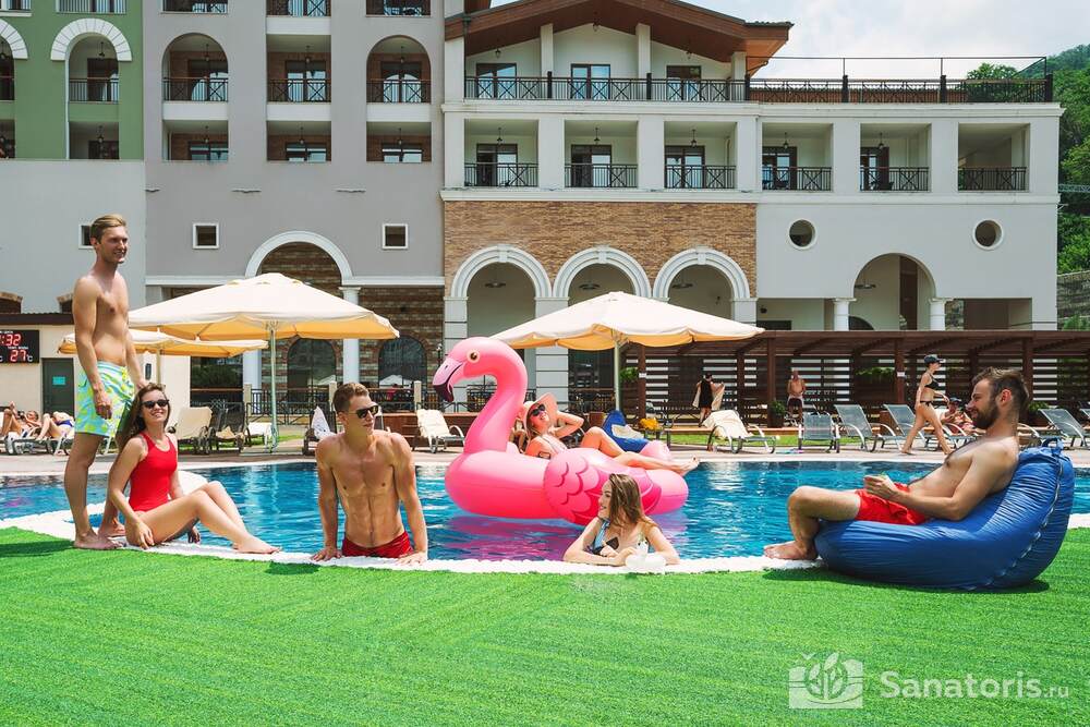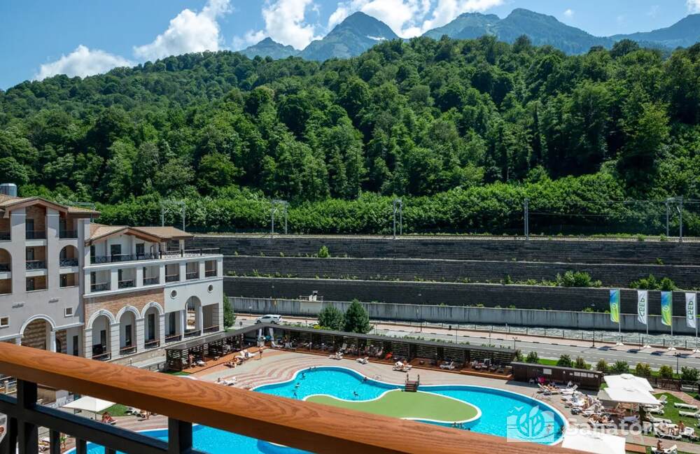 Рядом с отелем есть канатная дорога. Именно с нее начинаются все маршруты. Дойти до этой локации можно всего за несколько минут. Активный район деревни Эсто-Садок расположен в шаговой доступности. Здесь есть великолепная набережная, магазины, рестораны и кафе. Работает пункт проката, где туристы могут арендовать спортивное снаряжение и экипировку.