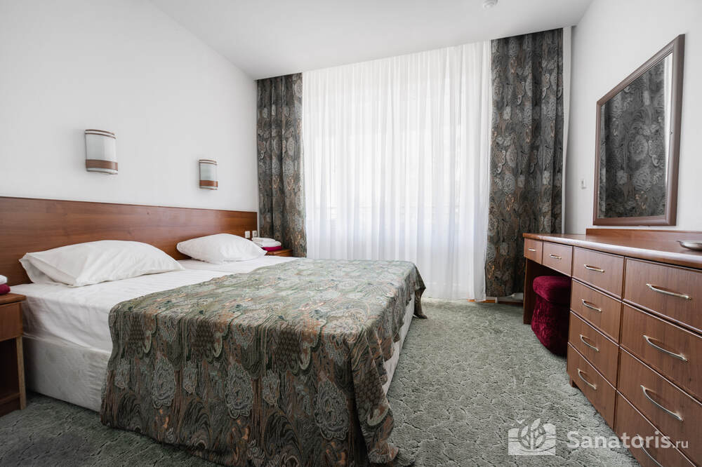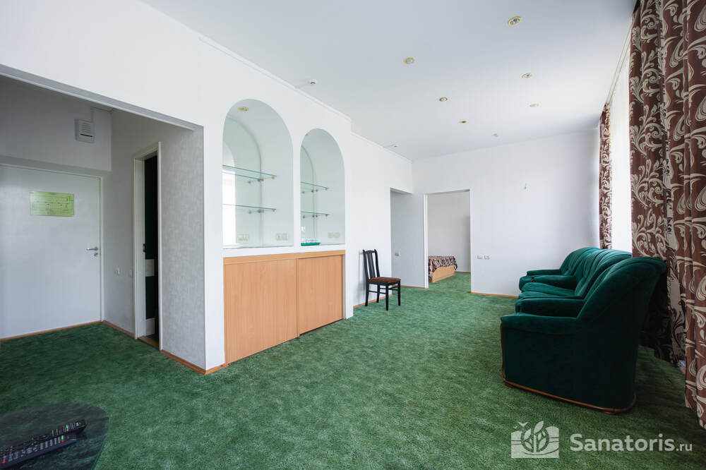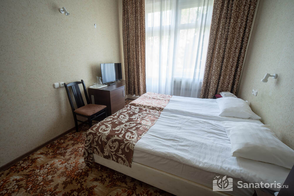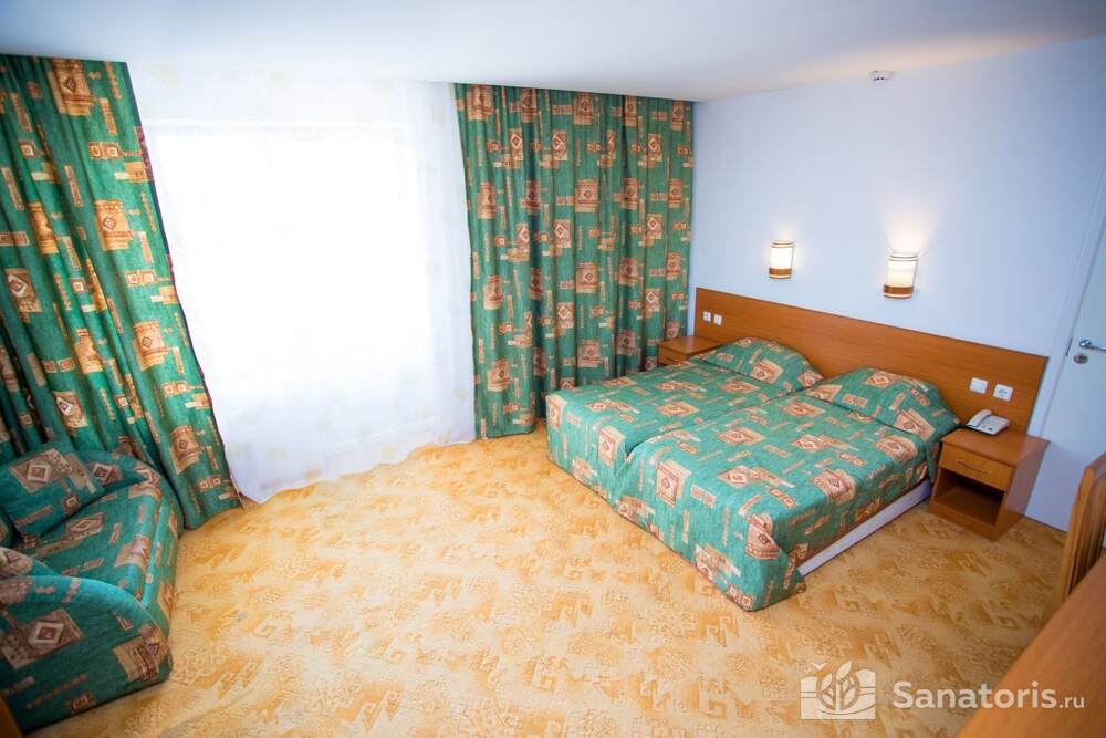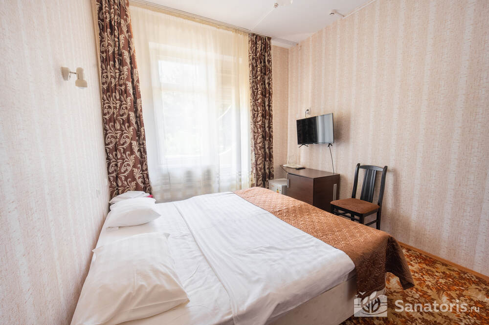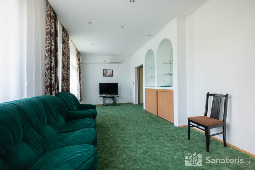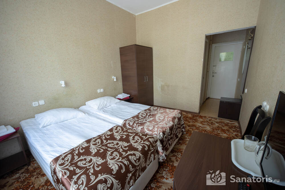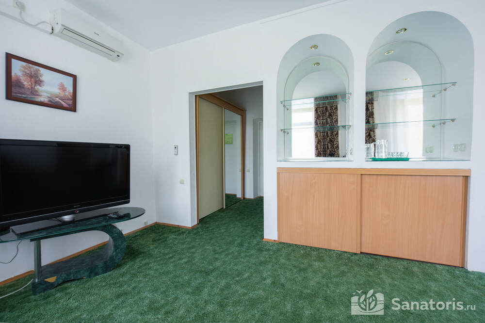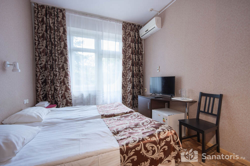 - Хорошо продуманная инфраструктура. Архитектурная часть санатория состоит из одного административного и двух жилых корпусов. На выбор посетителям представлены номера нескольких типов («люкса», «эконом» и пр.). В каждом из них предусмотрен санузел, душевая, ванная и полный набор бытовых приборов (телевизор, холодильник, кондиционер). На всей территории комплекса доступен бесплатный вай-фай.