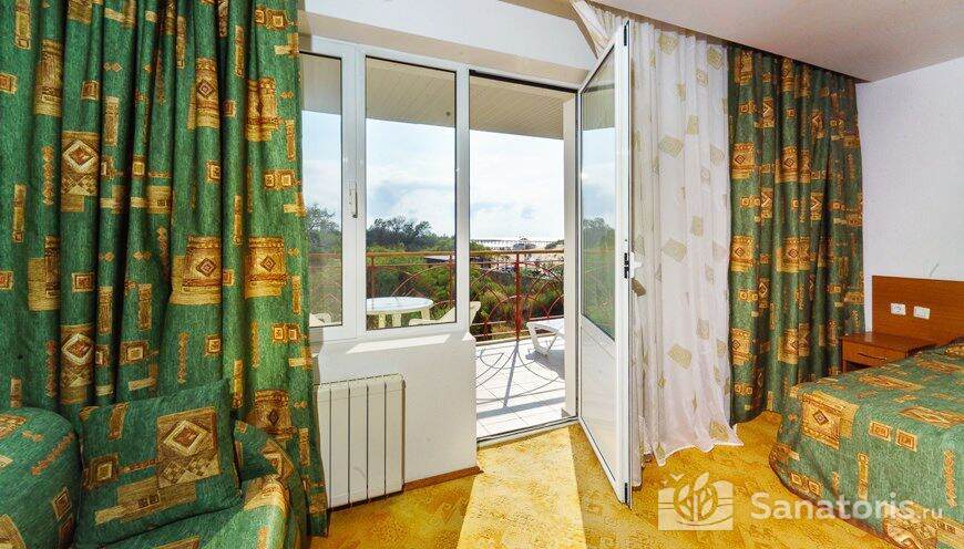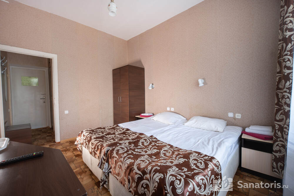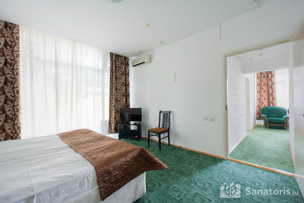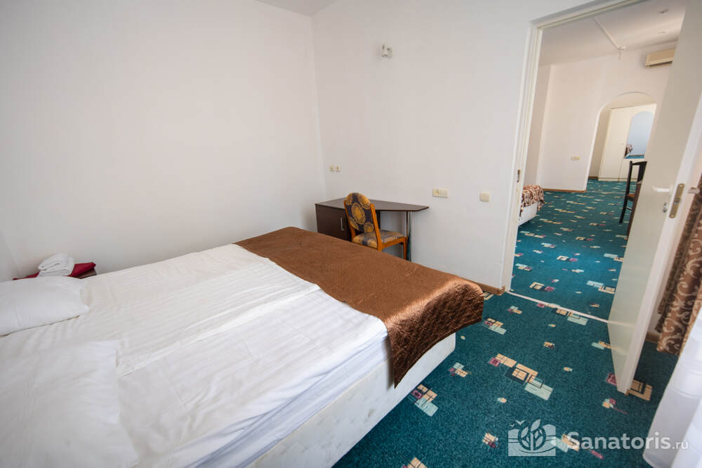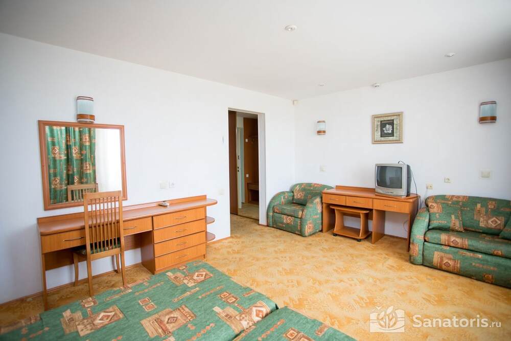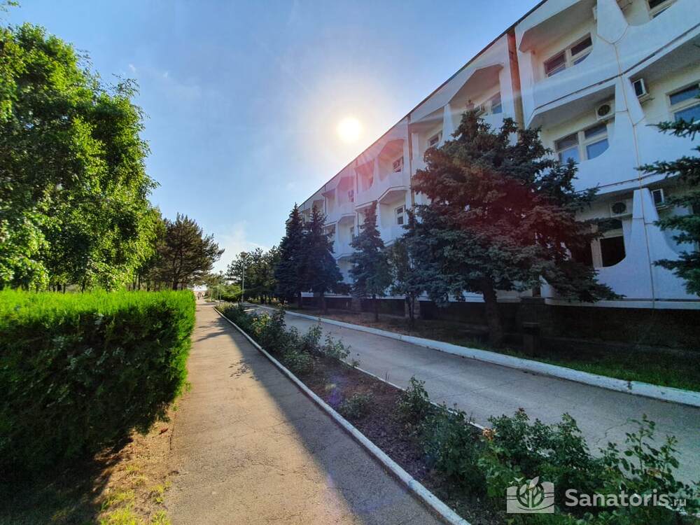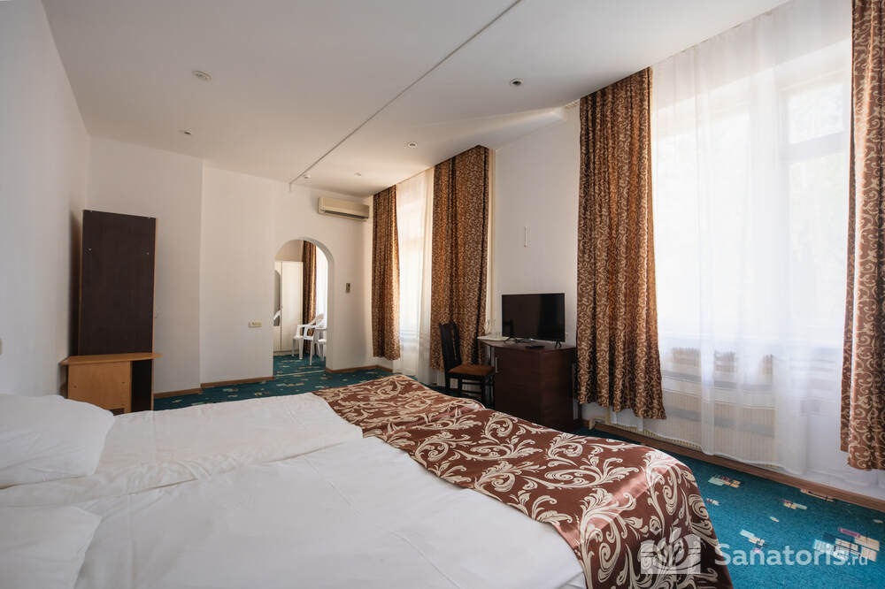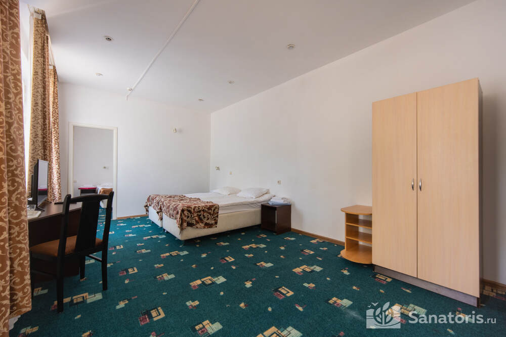 - Хорошо продуманная инфраструктура. Архитектурная часть санатория состоит из одного административного и двух жилых корпусов. На выбор посетителям представлены номера нескольких типов («люкса», «эконом» и пр.). В каждом из них предусмотрен санузел, душевая, ванная и полный набор бытовых приборов (телевизор, холодильник, кондиционер). На всей территории комплекса доступен бесплатный вай-фай.