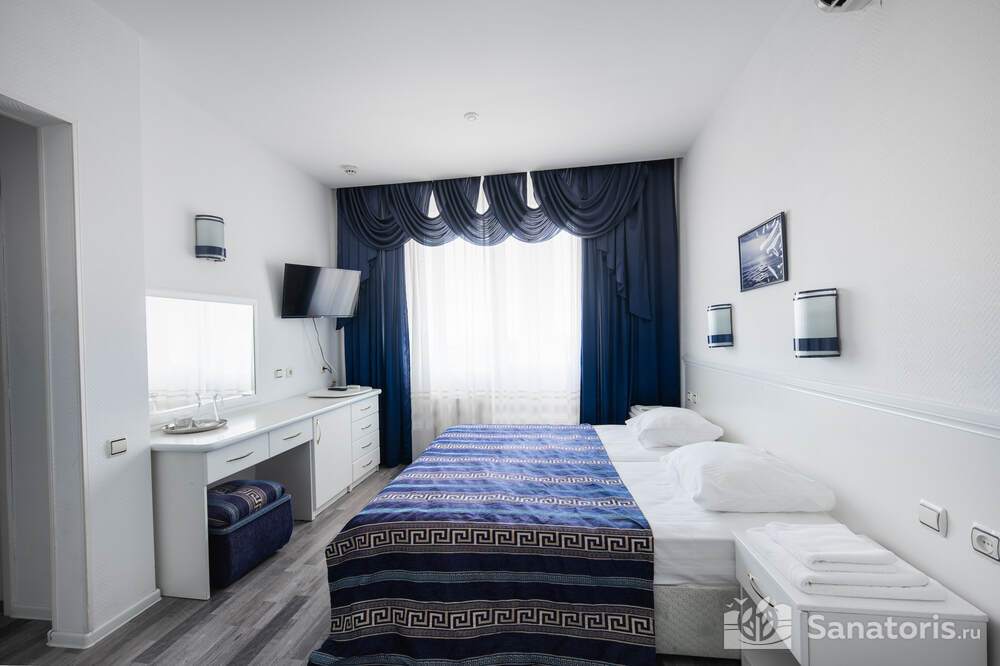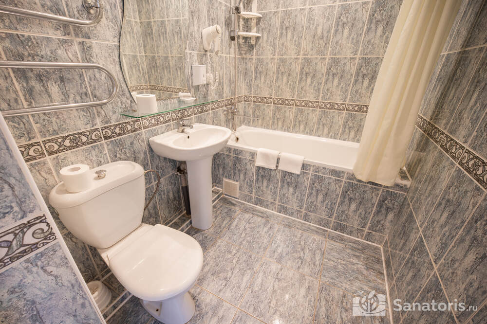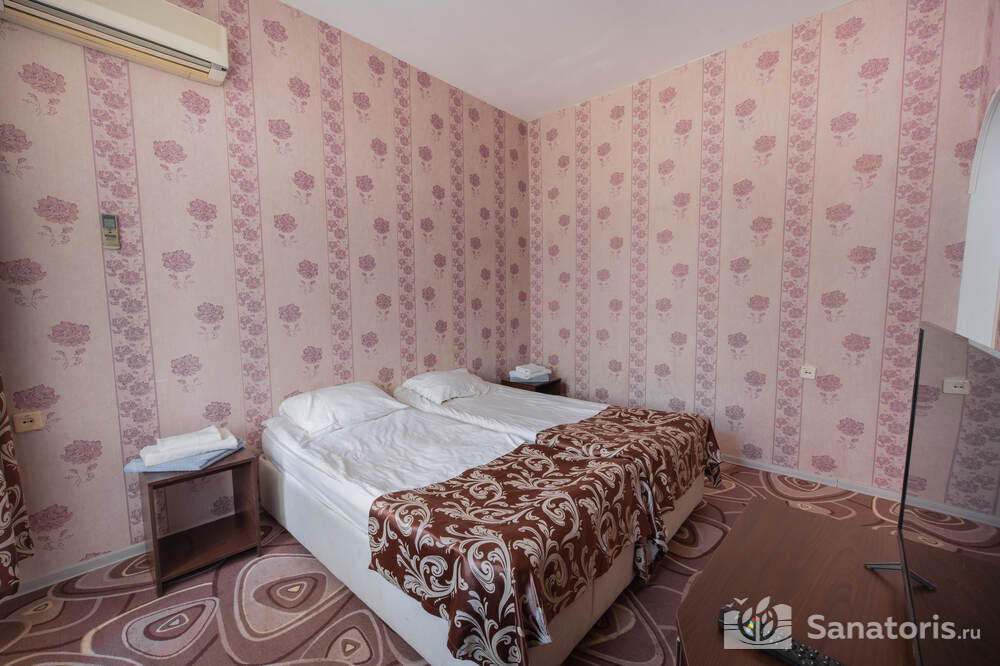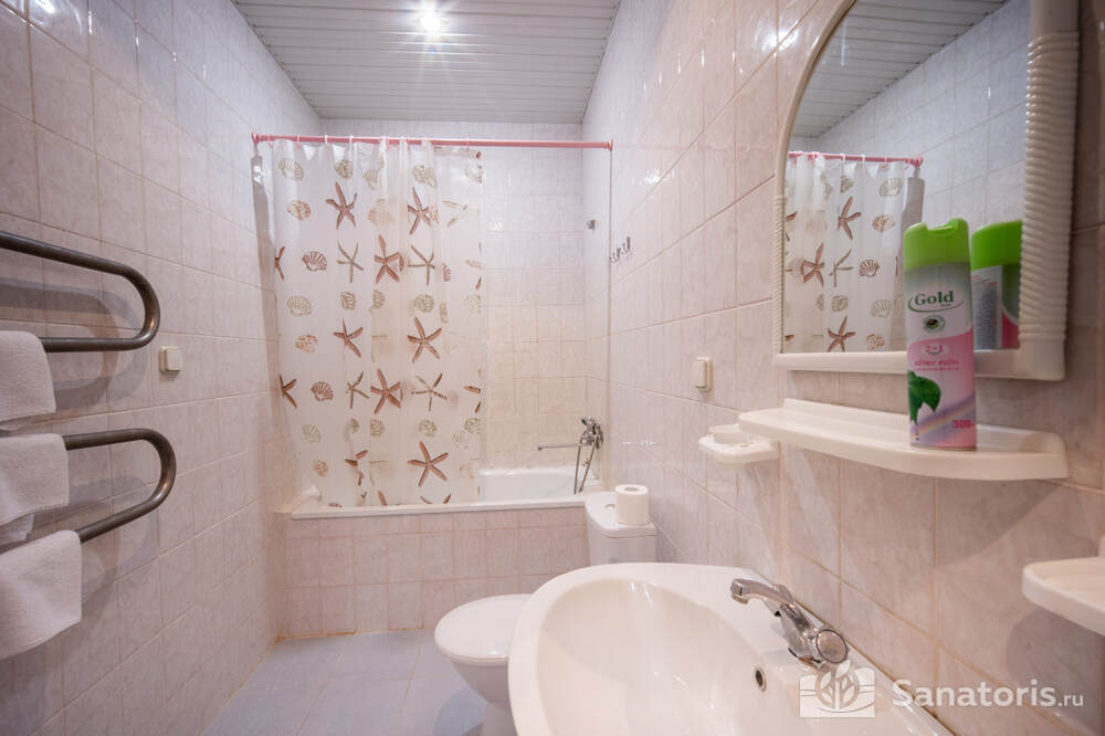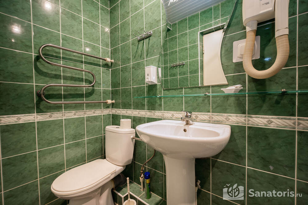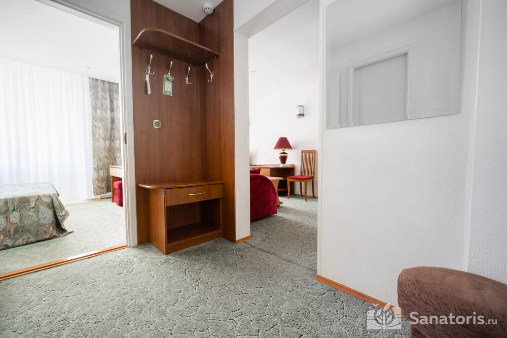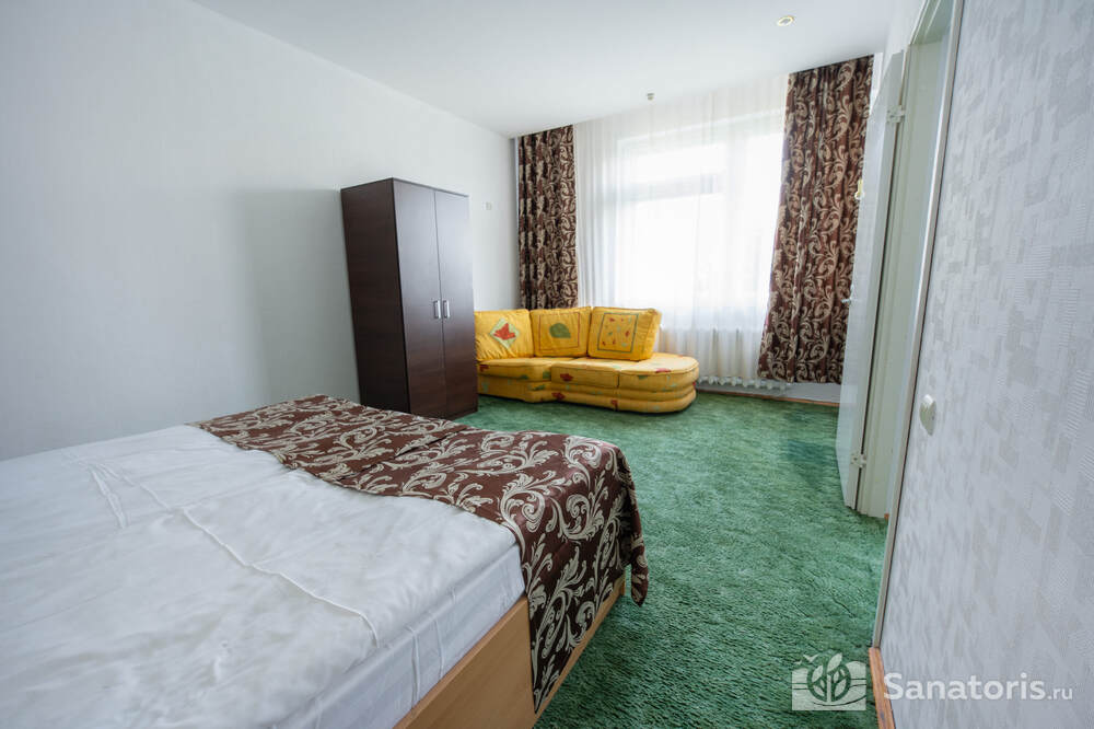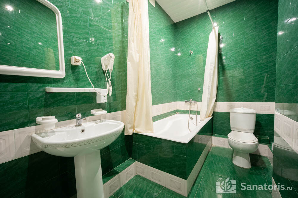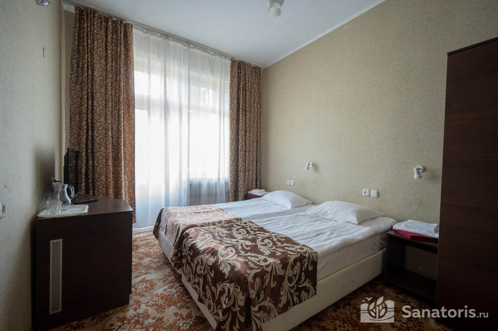 - Хорошо продуманная инфраструктура. Архитектурная часть санатория состоит из одного административного и двух жилых корпусов. На выбор посетителям представлены номера нескольких типов («люкса», «эконом» и пр.). В каждом из них предусмотрен санузел, душевая, ванная и полный набор бытовых приборов (телевизор, холодильник, кондиционер). На всей территории комплекса доступен бесплатный вай-фай.