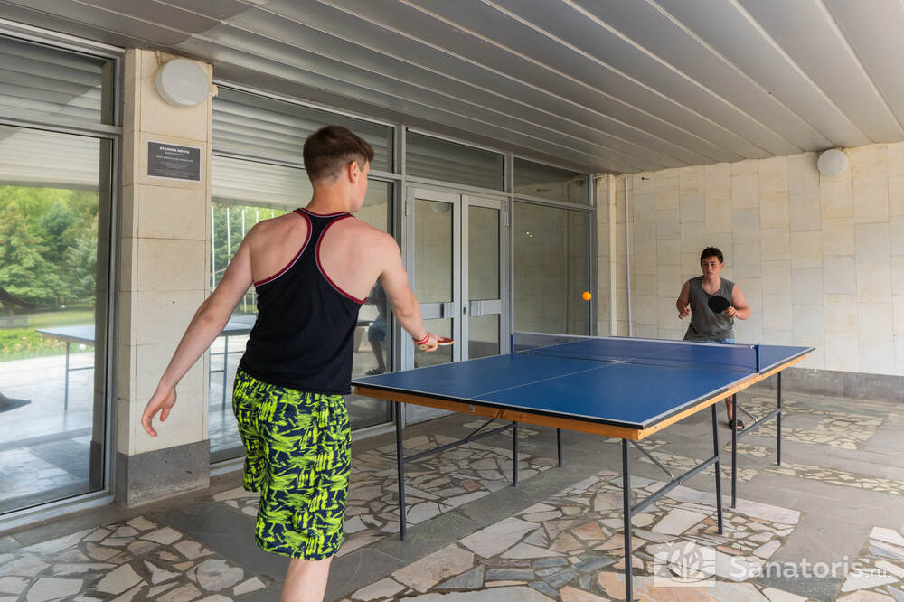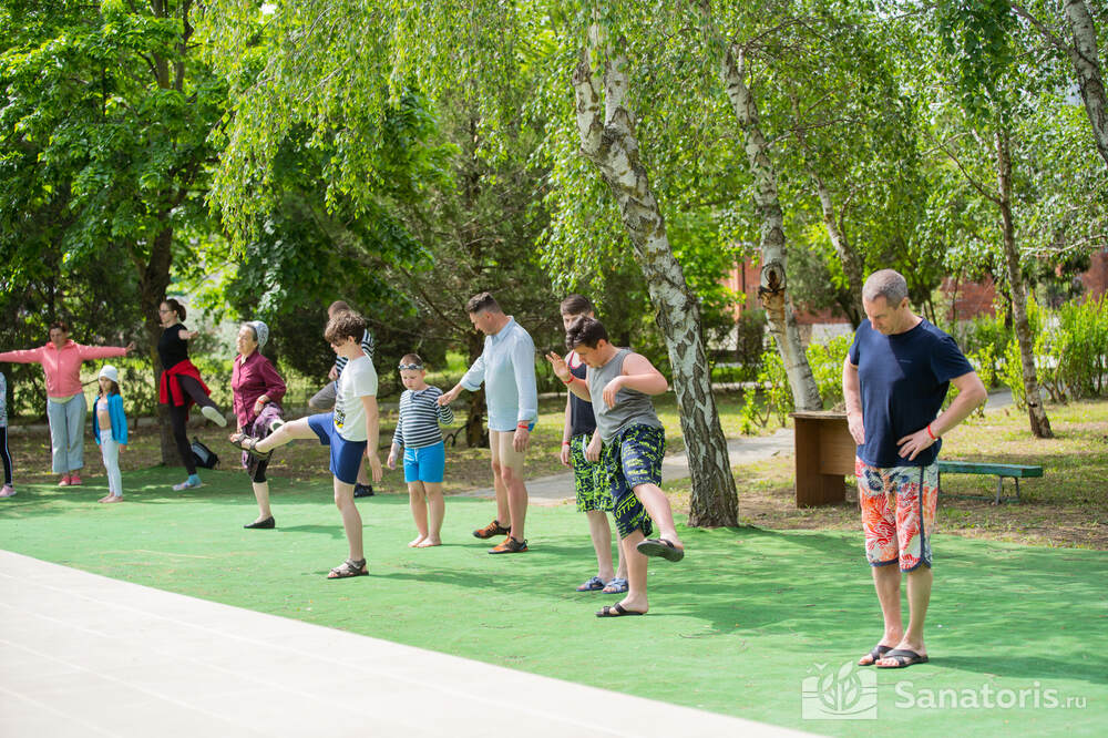 - Тренажерный зал, комплекс ЛФК, футбольные, теннисные, волейбольные и детские площадки. В санатории постоянно дежурит опытный тренер, который поможет составить подходящий комплекс физических упражнений.