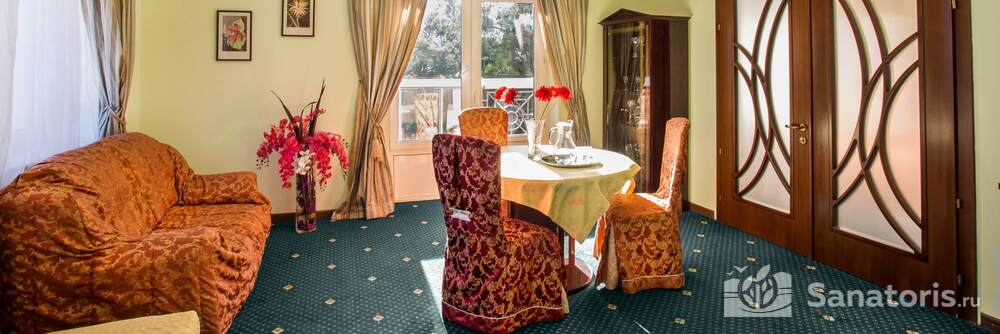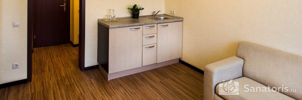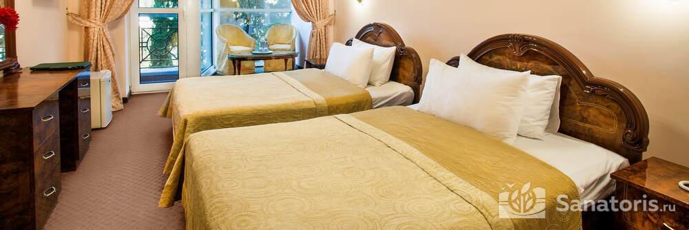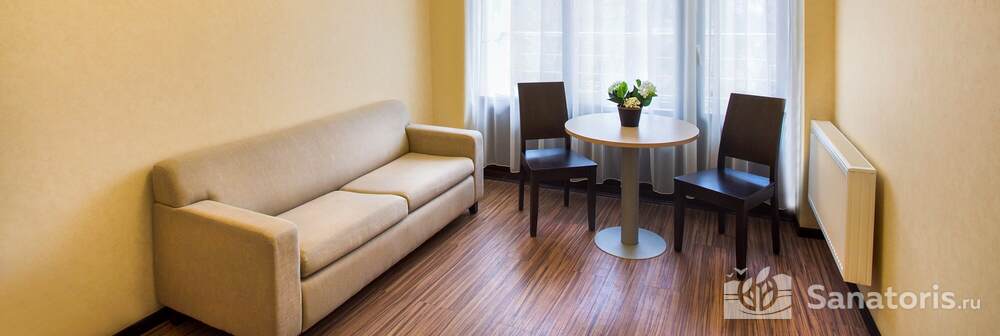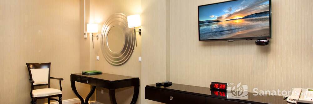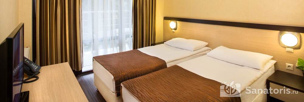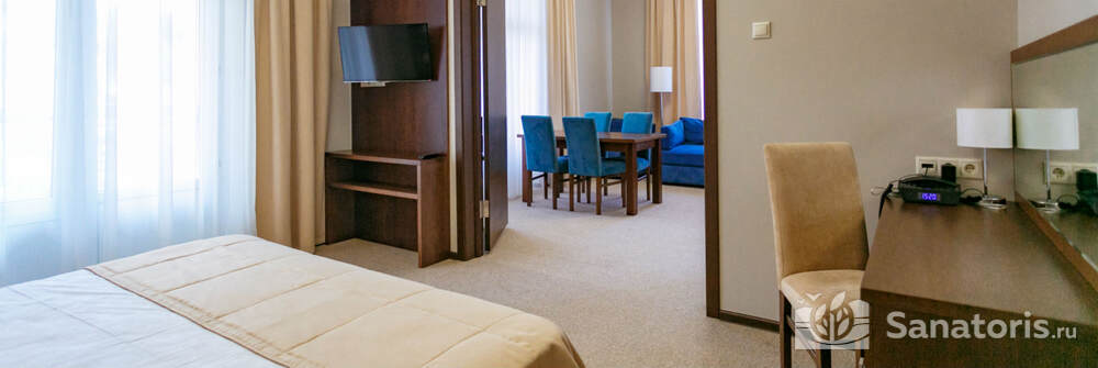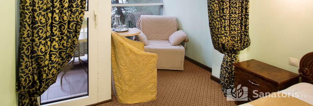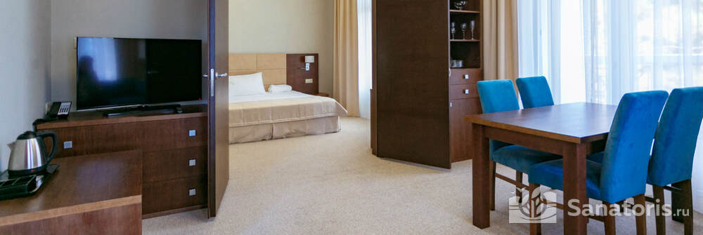 Номера обустроены всем необходимым для комфортного отдыха, в том числе и кондиционерами. Принимаются дети с двух лет, если же нужна лечебная программа, то с четырех. Когда родители будут на процедурах, ребятами займутся опытные аниматоры и воспитатели. Развлечений для самых маленьких полно: специальная площадка, бассейн, различные аттракционы и игрушки.