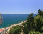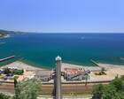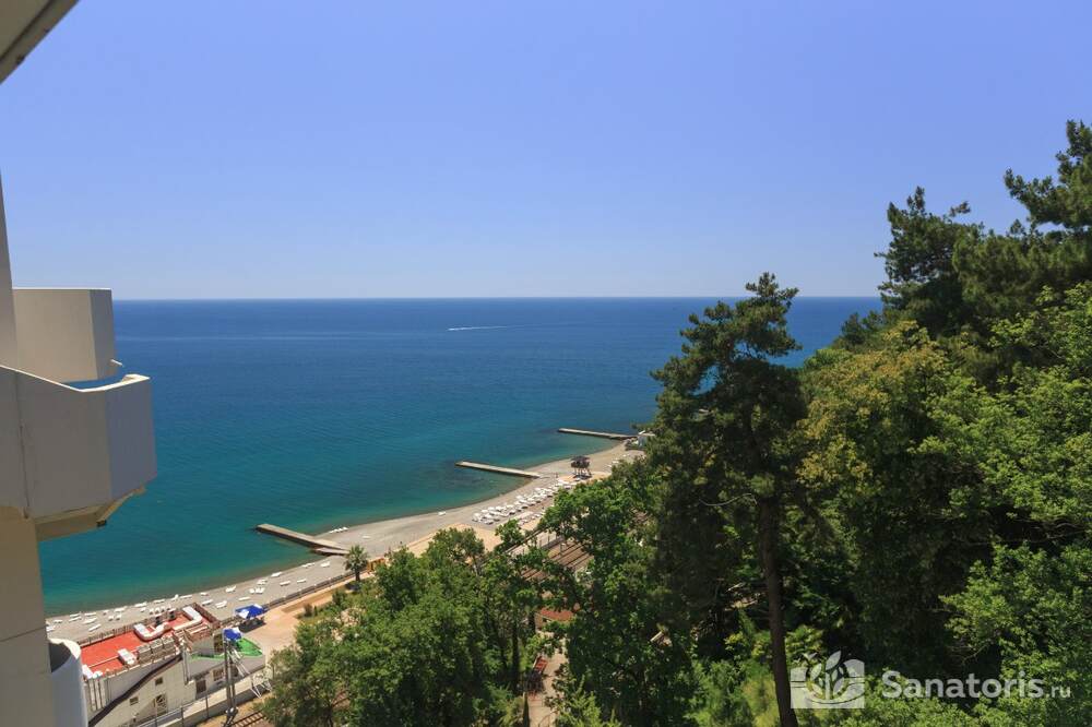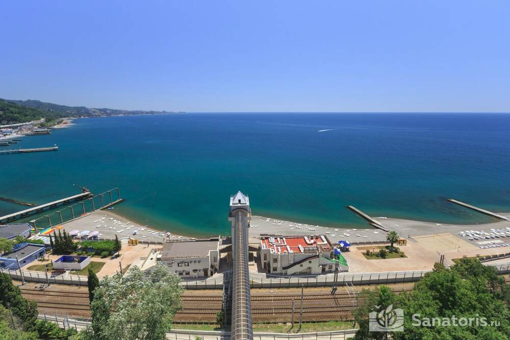 Пляж здравницы ухоженный, есть крупная и мелкая галька. Для спуска удобно использовать панорамный лифт. На территории имеется все необходимое для комфортного отдыха: лежаки, шезлонги и так далее. Также оборудование можно приобрести в магазине на территории санатория.