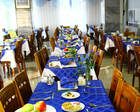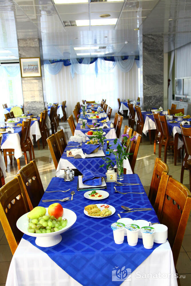 Гости санатория могут питаться в одном из четырех обеденных залов: 2 стандартных, детский и VIP-зал. Отдыхающим предлагают меню на завтрашний день, из которого можно заказать предпочитаемые блюда, плюс к этому присутствуют элементы шведского стола, а также возможность соблюдать диету согласно медицинскому предписанию.