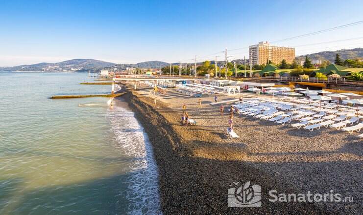 Пансионат располагает собственным пляжем. Он находится в 350 метрах от жилого корпуса. На пляже есть вся необходимая для качественного отдыха инфраструктура: душевые кабинки, раздевалки, лежаки, пляжные зонты и навесы.