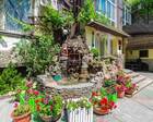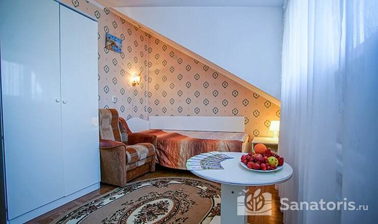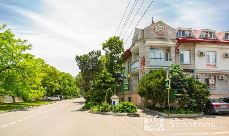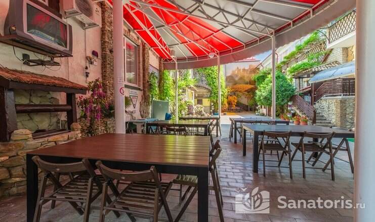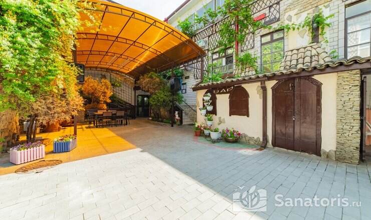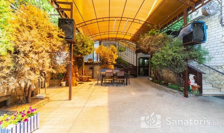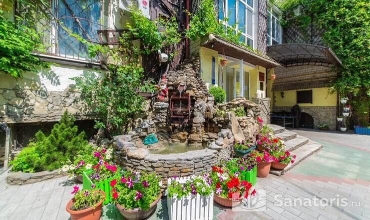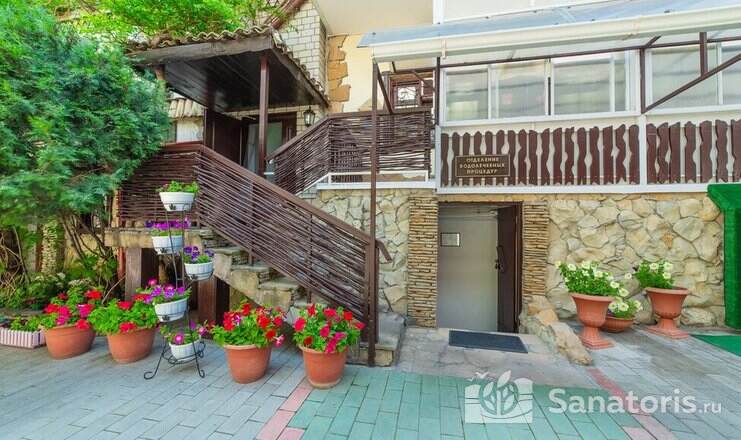 Территория оздоровительного комплекса огорожена и находится под круглосуточной охраной. Для удобства гостей оборудованы уютные беседки, фонтаны, клумбы с разнообразными цветами. Изюминкой санатория является древний родник с целебной водой.