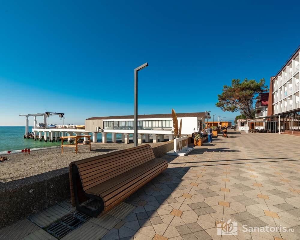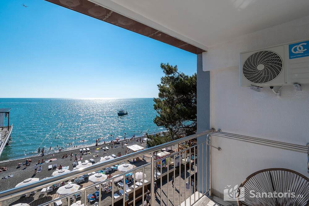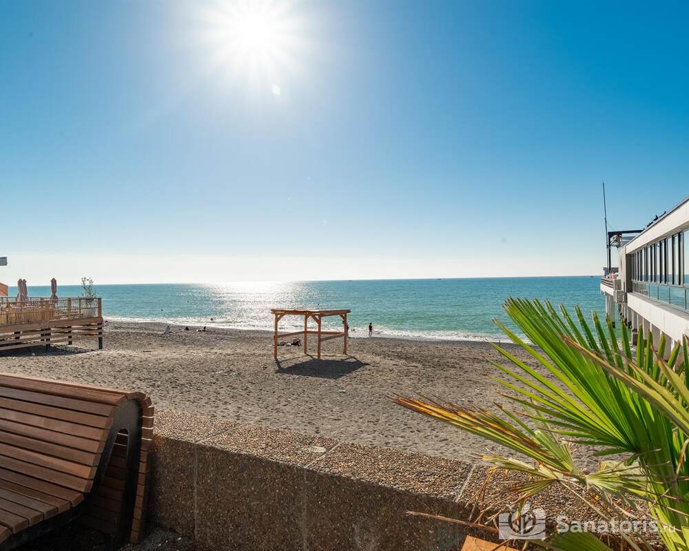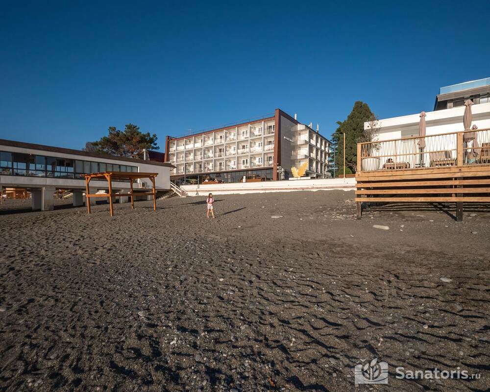 Пляж расположен в пяти метрах от отеля. Пологий вход в море максимально безопасен для детей. На пляже есть навесы, шезлонги, раздевалки, душ.