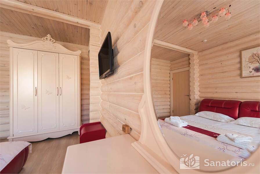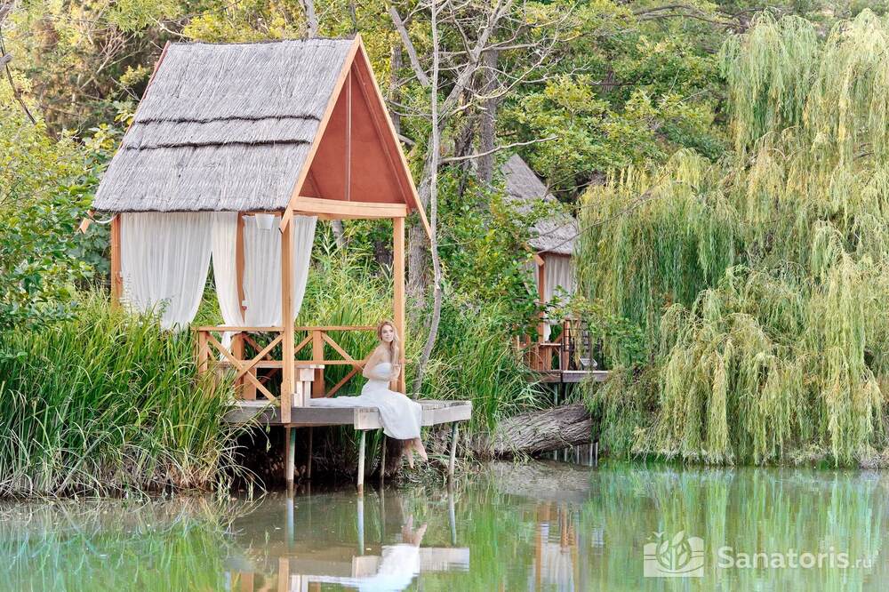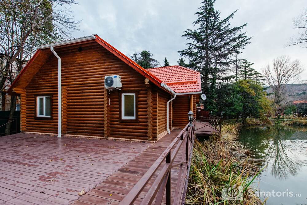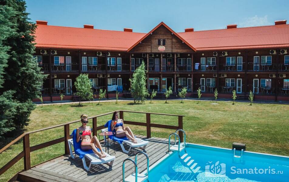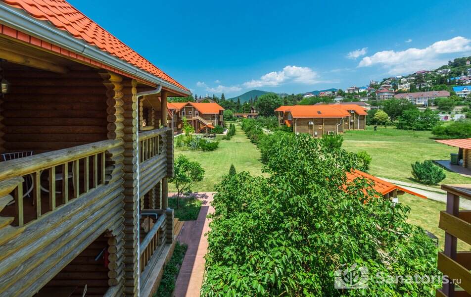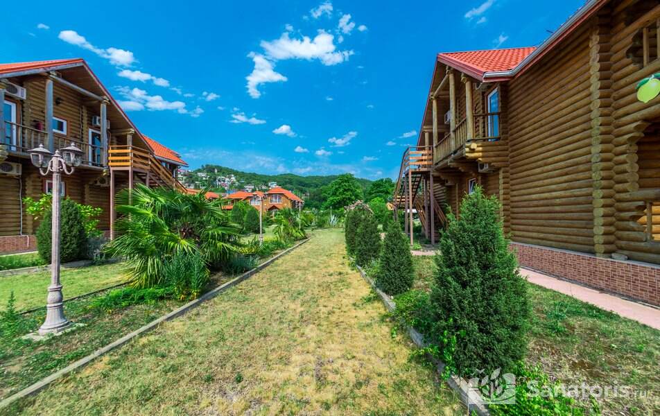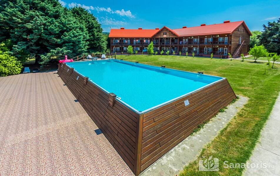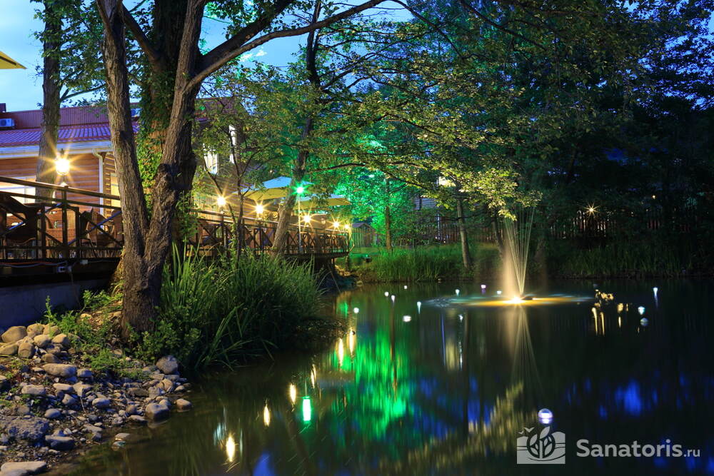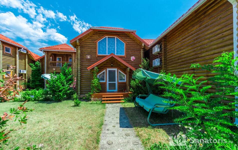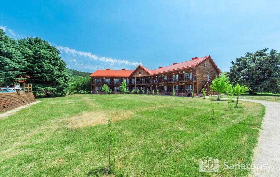 В ухоженной парковой зоне площадью 7 Га размещаются 9 комфортных коттеджей и 2-этажный корпус, выполненные из соответствующих экоматериалов. Здания великолепно смотрятся на фоне природы. Также приятны прогулки по аллеям, мимо цветущих клумб и декоративных кустарников. Есть летнее кафе на террасе, плавающий ресторанчик, детские площадки и игровые комнаты в гостинице.
