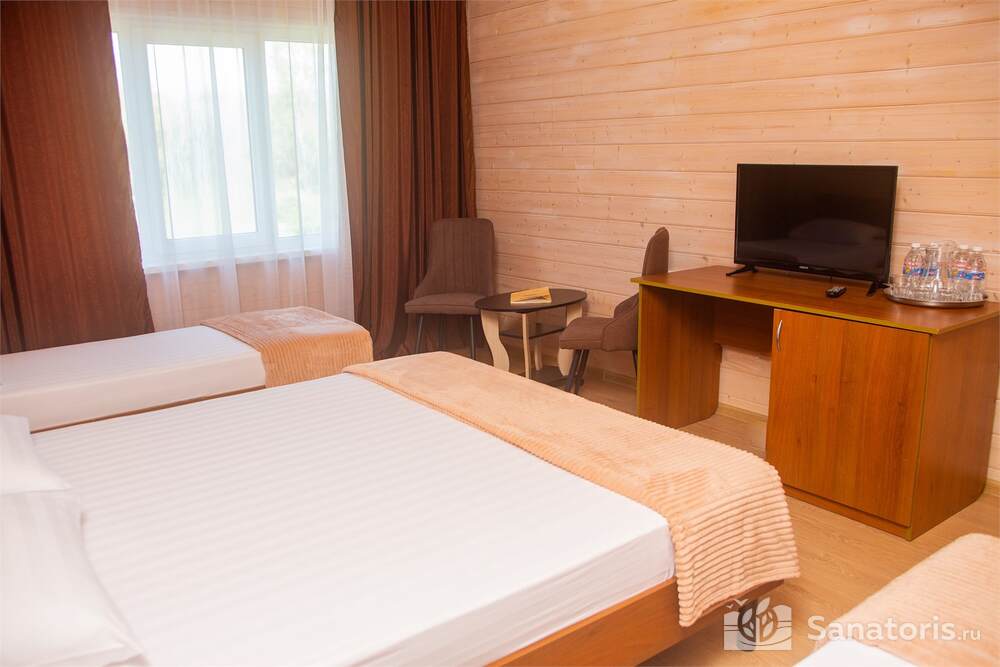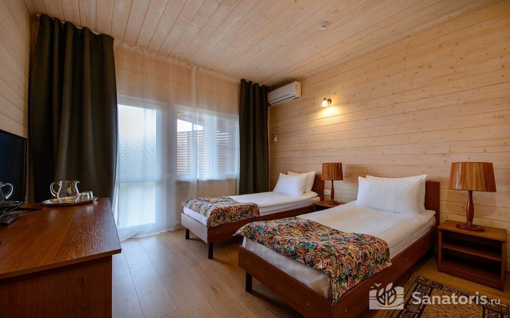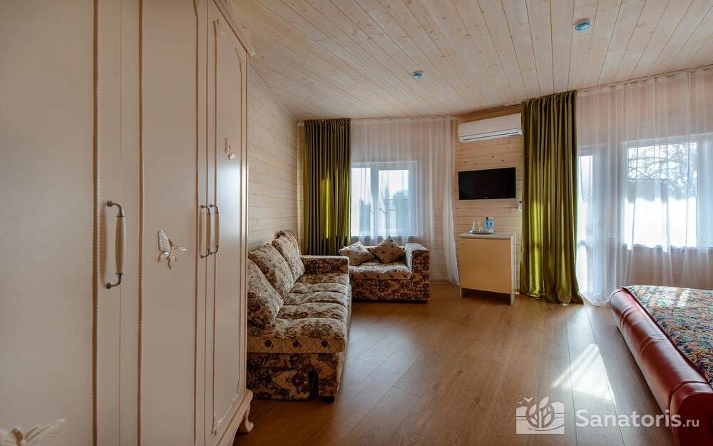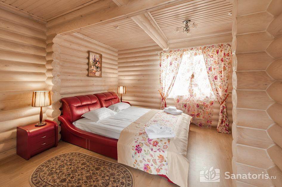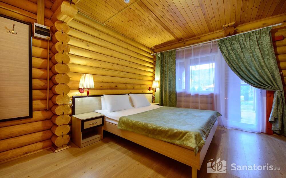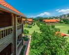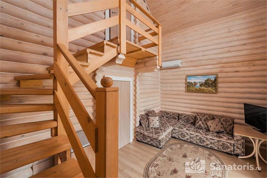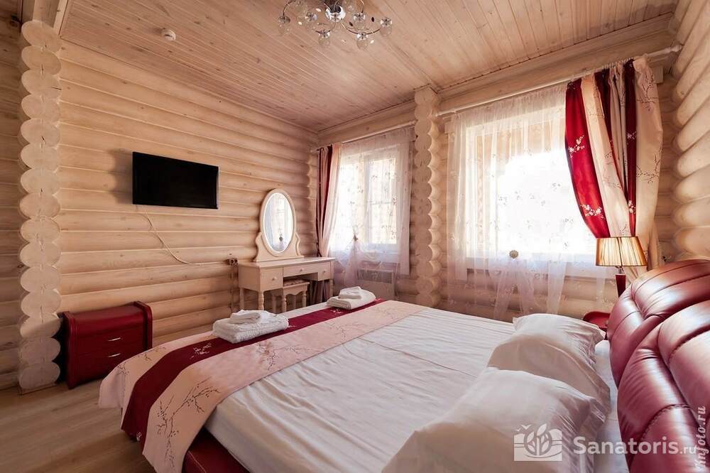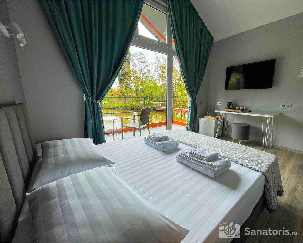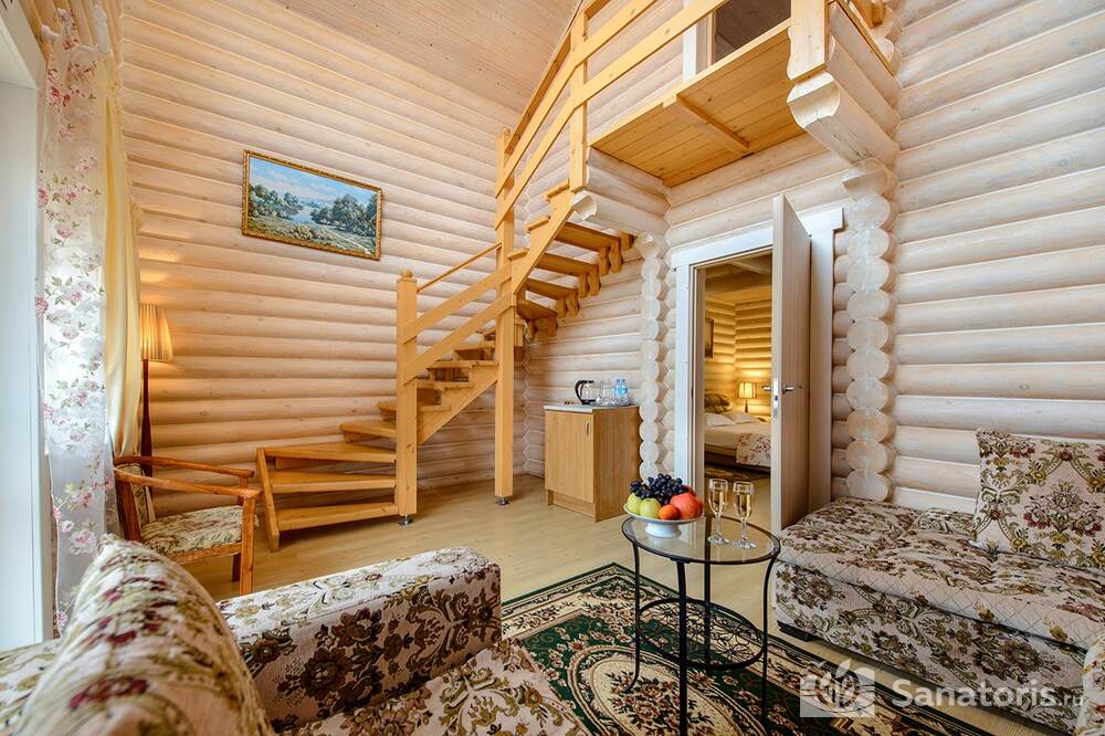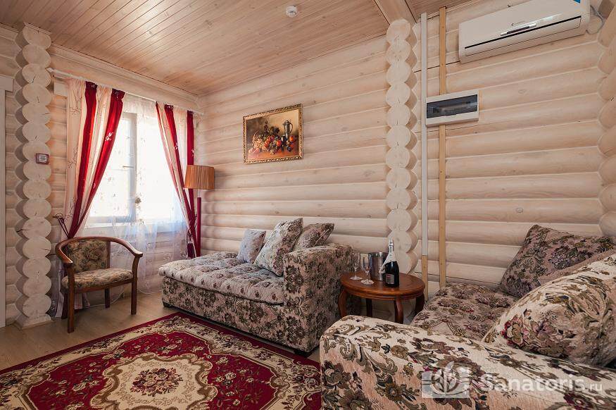 В ухоженной парковой зоне площадью 7 Га размещаются 9 комфортных коттеджей и 2-этажный корпус, выполненные из соответствующих экоматериалов. Здания великолепно смотрятся на фоне природы. Также приятны прогулки по аллеям, мимо цветущих клумб и декоративных кустарников. Есть летнее кафе на террасе, плавающий ресторанчик, детские площадки и игровые комнаты в гостинице.