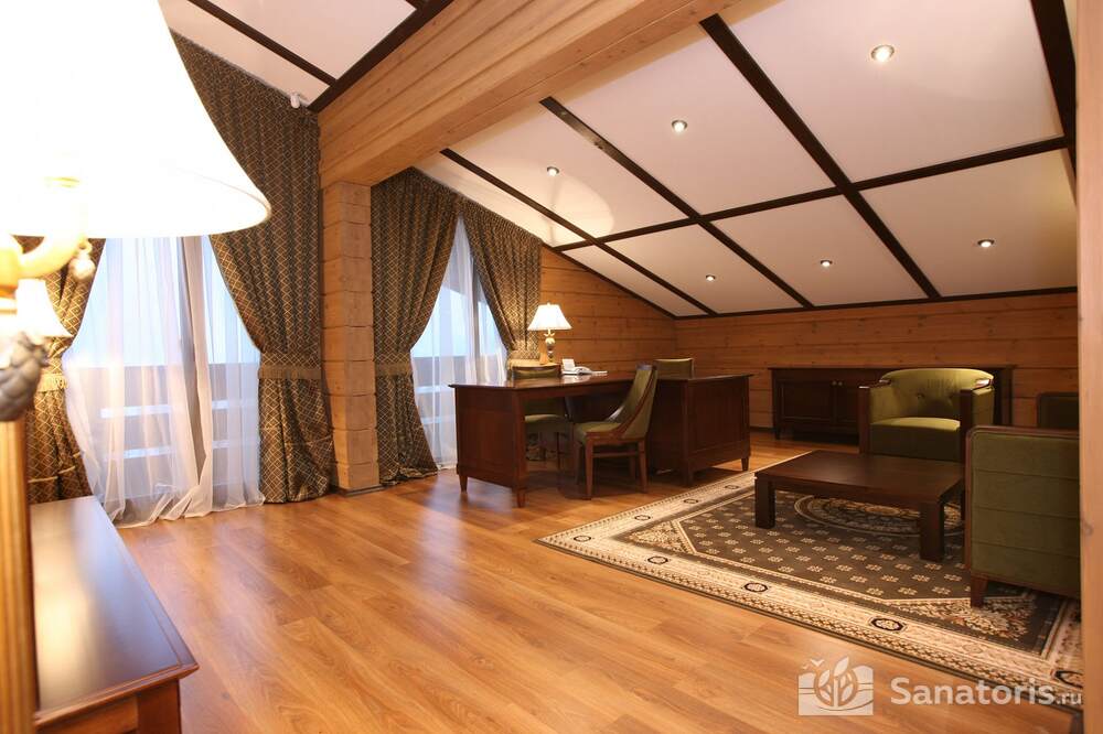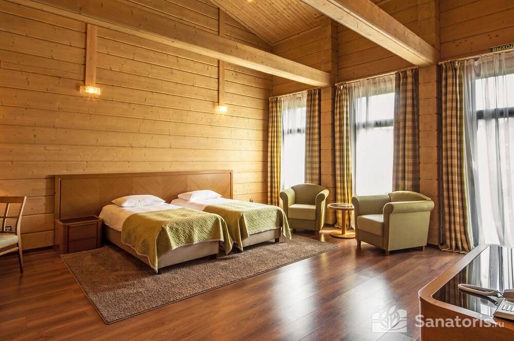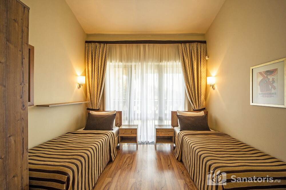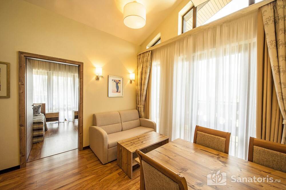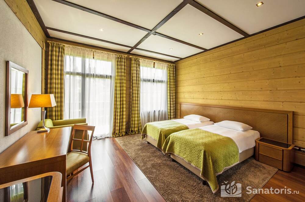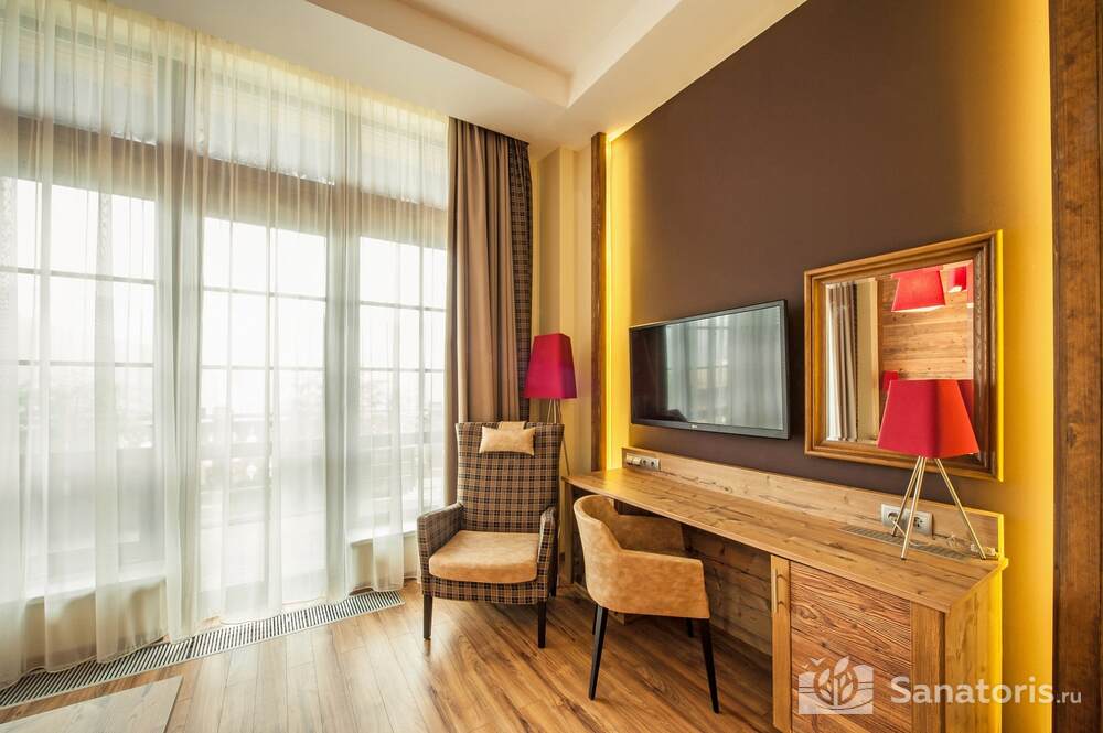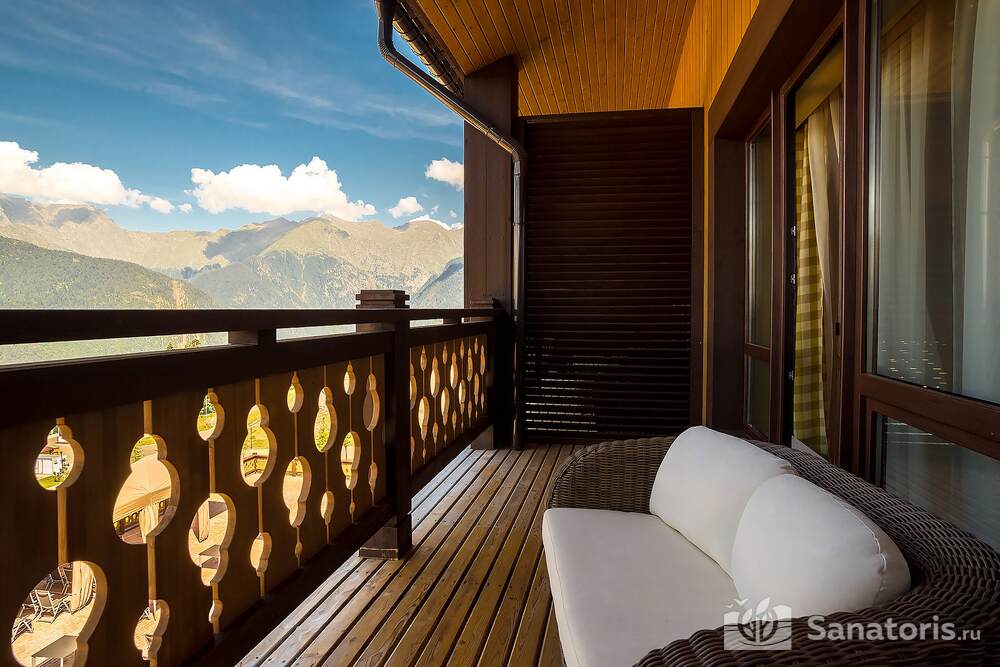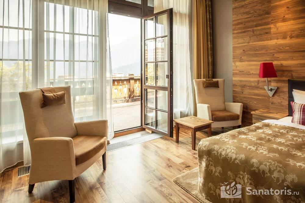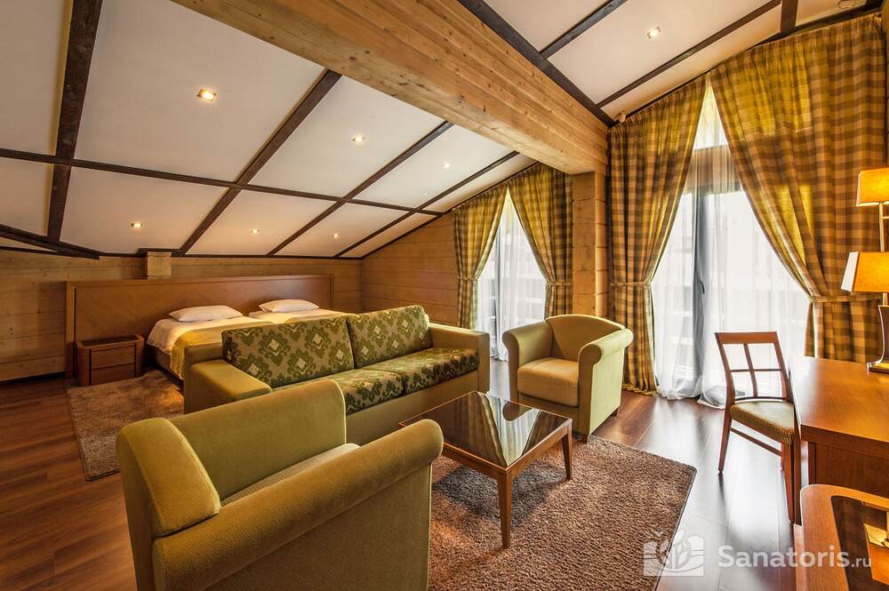 Гостиничный комплекс одновременно может принять в своих стенах до 1100 людей. Номера находятся отдельно от основного корпуса, но между ними имеется удобный переход. В главном корпусе к распоряжению гостей доступны услуги ресторана, посещение спортивного зала и бассейна. Имеются специально оборудованные номера для людей с инвалидностью. Спальные номера оборудованы коммуникациями первой необходимости. Для личного пользования проживающих доступны чайник, телефон, мини бар, банные принадлежности. Из номера открывается прекрасный вид на горы. Для посетителей доступен бесплатный WI-FI. Прием и заселение новоприбывших гостей осуществляется на ресепшене главного корпуса.