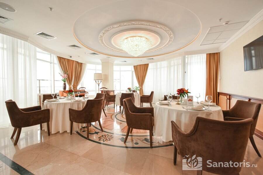 Гости питаются в шикарном ресторане. Здесь подают вкусные блюда средиземноморской и национальной кухни. Большие окна открывают шикарный вид на речку и живописный парк.
