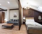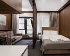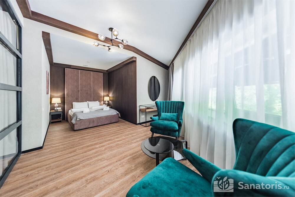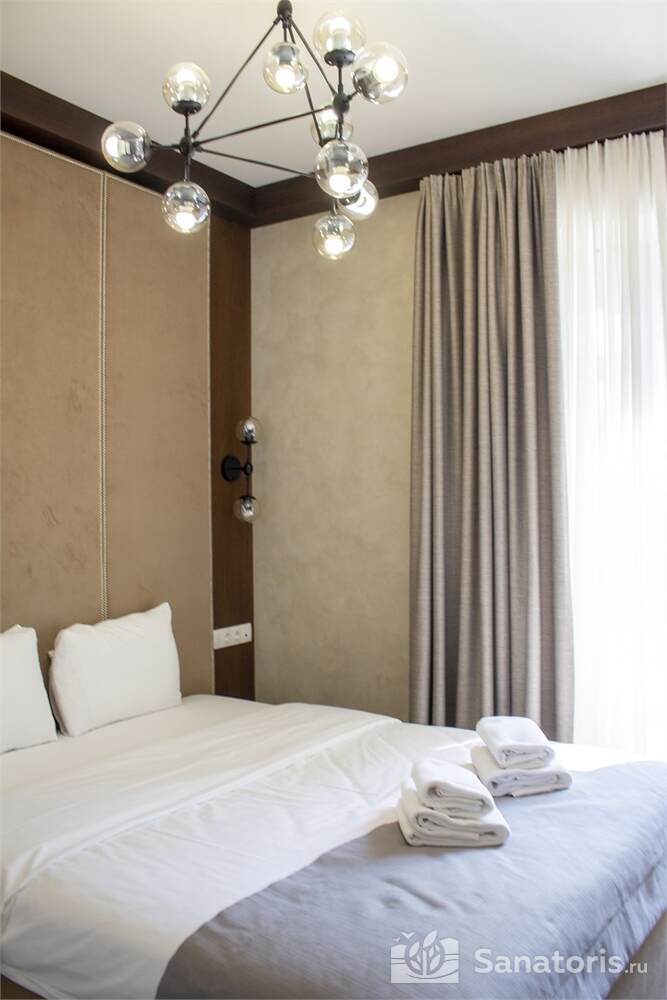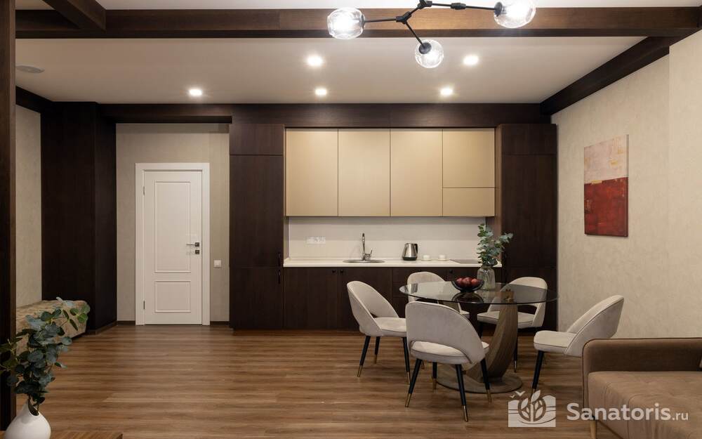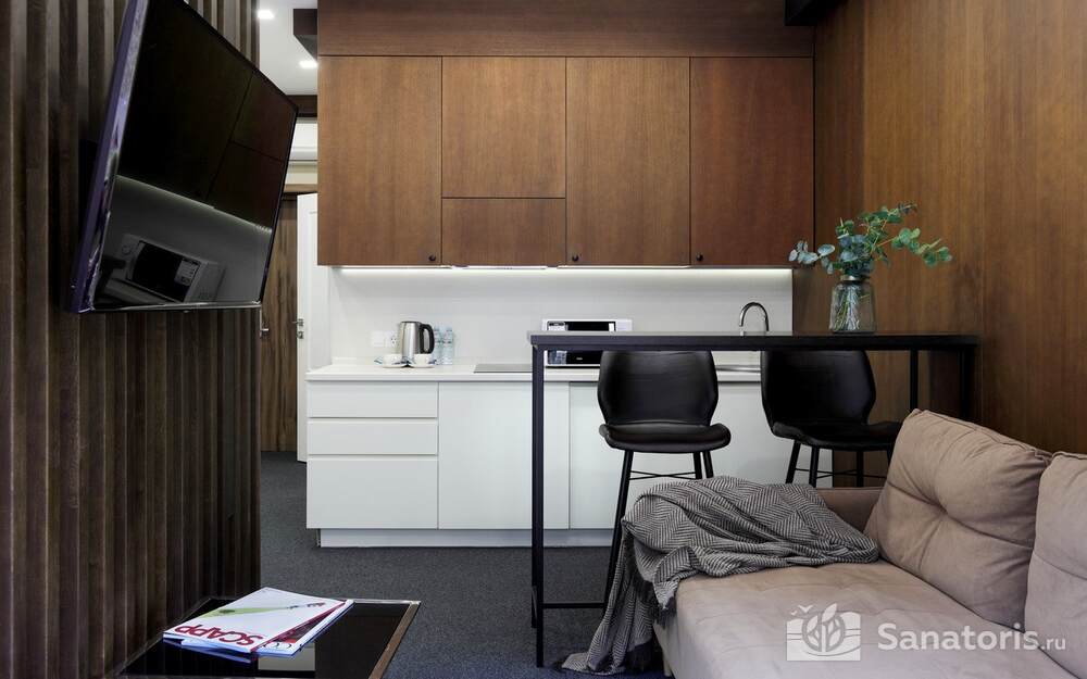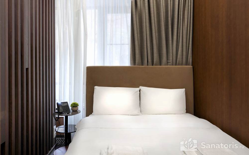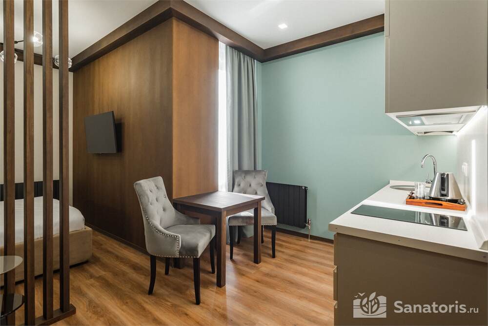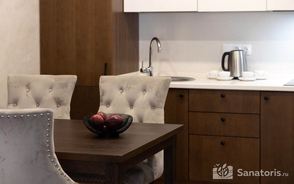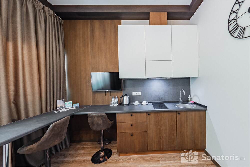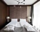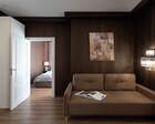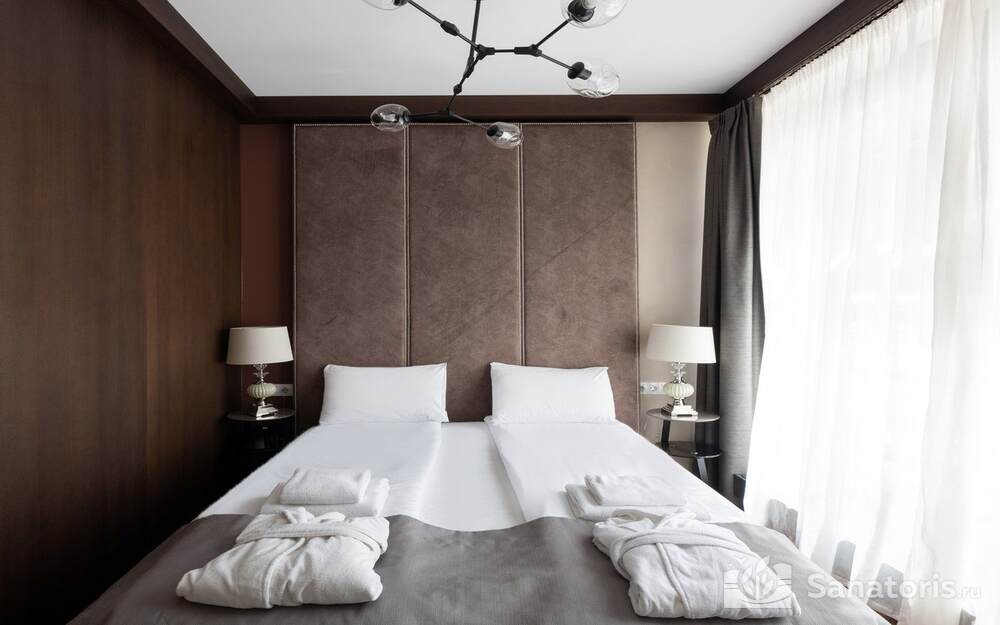 Сдержанность интерьера в комнатах подчеркивается шоколадными оттенками. Базовая комплектация номеров включает в себя:
