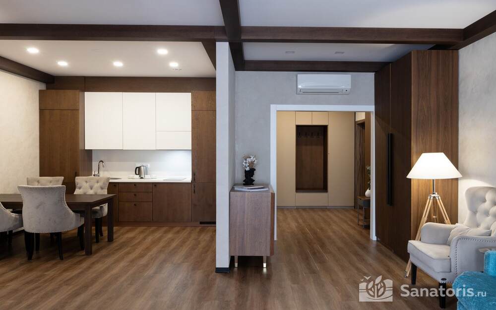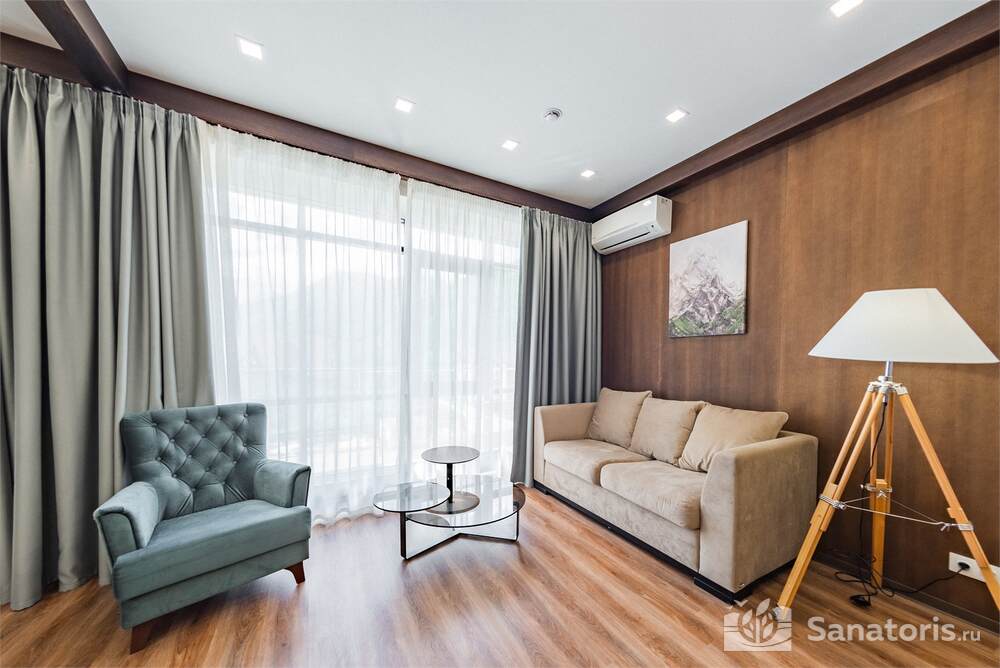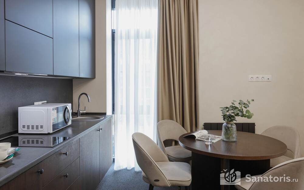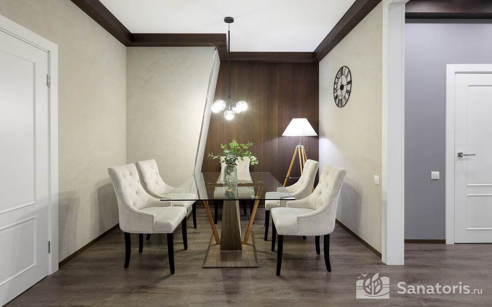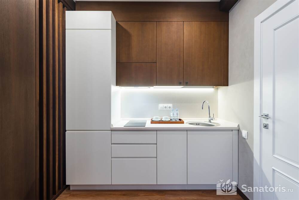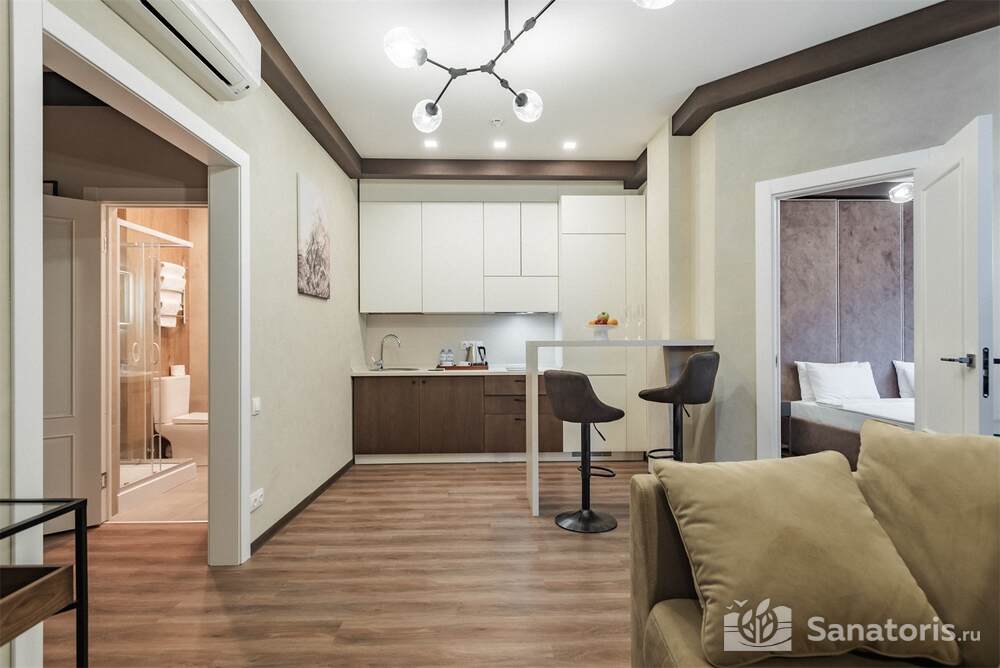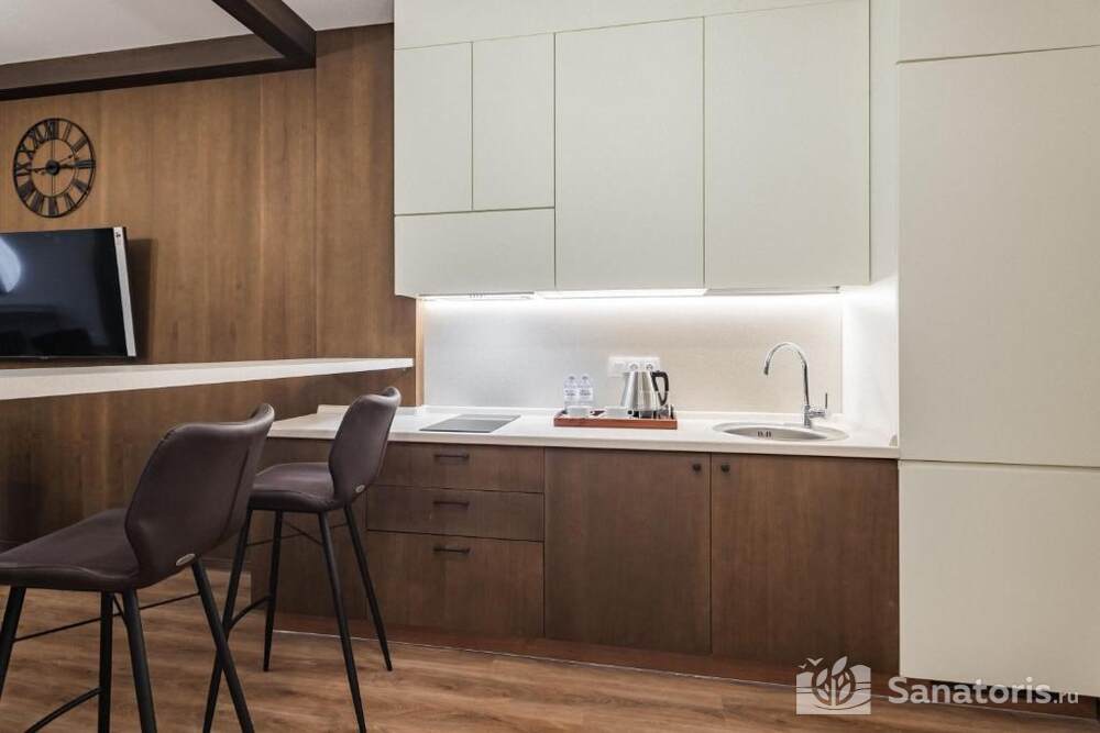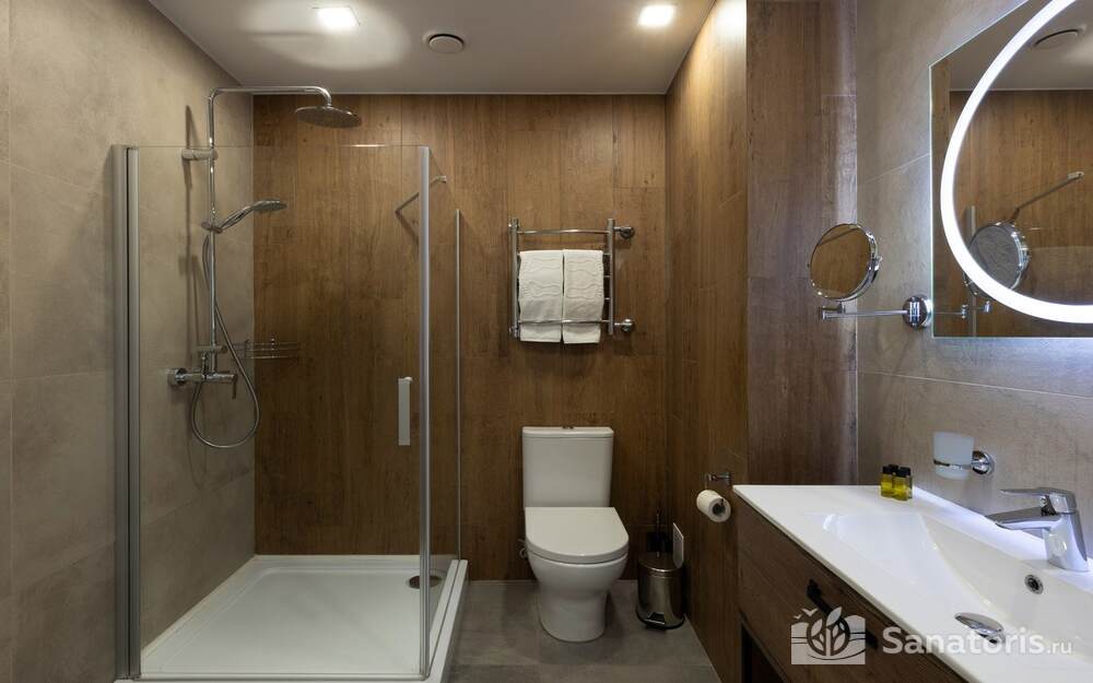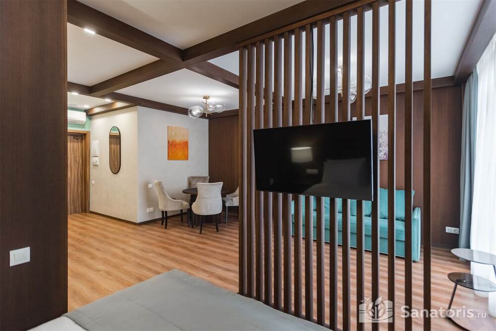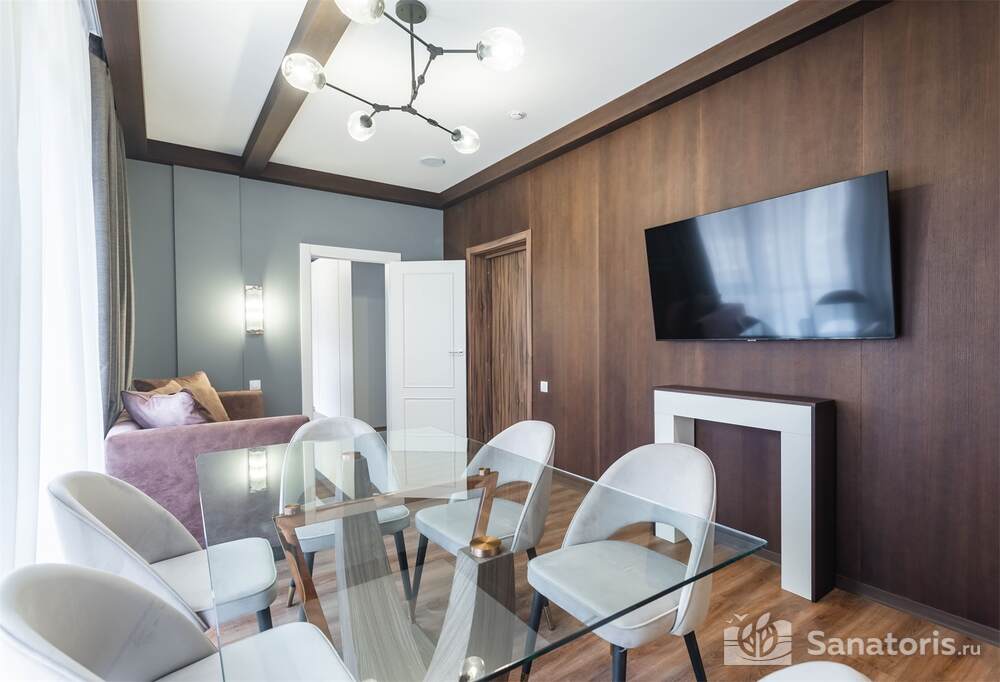 Сдержанность интерьера в комнатах подчеркивается шоколадными оттенками. Базовая комплектация номеров включает в себя: