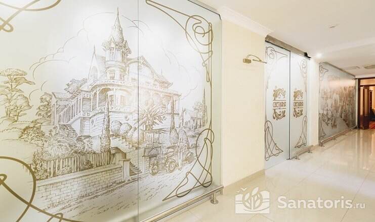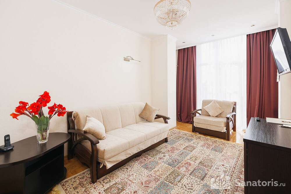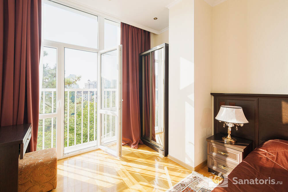 Восьмиэтажное здание санаторного комплекса представляет собой внушительную постройку. Из его окон открывается живописный вид на окрестности – побережье моря, горы, парки, жилые дома, транспортные и пешеходные дороги. Одновременно в санатории могут разместиться порядка 460 отдыхающих. Номера уютные и комфортабельные. В них есть все, что может понадобиться человеку во время отпуска.