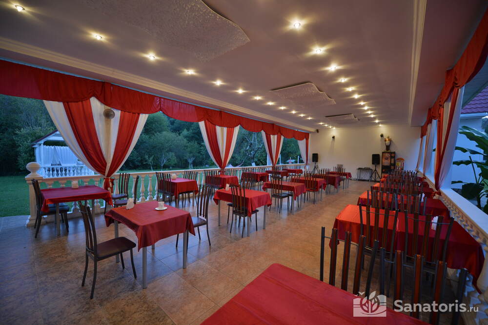 Питание осуществляется в обеденном зале. Все блюда готовятся исключительно из натуральных продуктов, которые доставляют в отель местные фермеры. Так же работает кафе, есть зона отдыха и мангалами и беседками. Здесь можно пожарить мясо и приятно провести время с семьей или друзьями.
