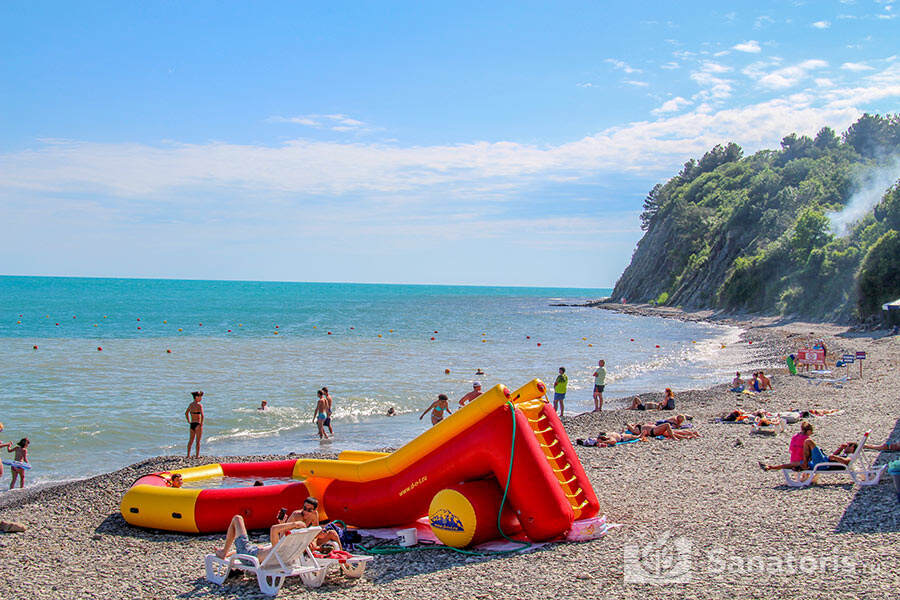 Расстояние от пансионата до пляжа всего 300 метров. На берегу Черного моря отдыхающие смогут позагорать, искупаться или поиграть в пляжный волейбол.