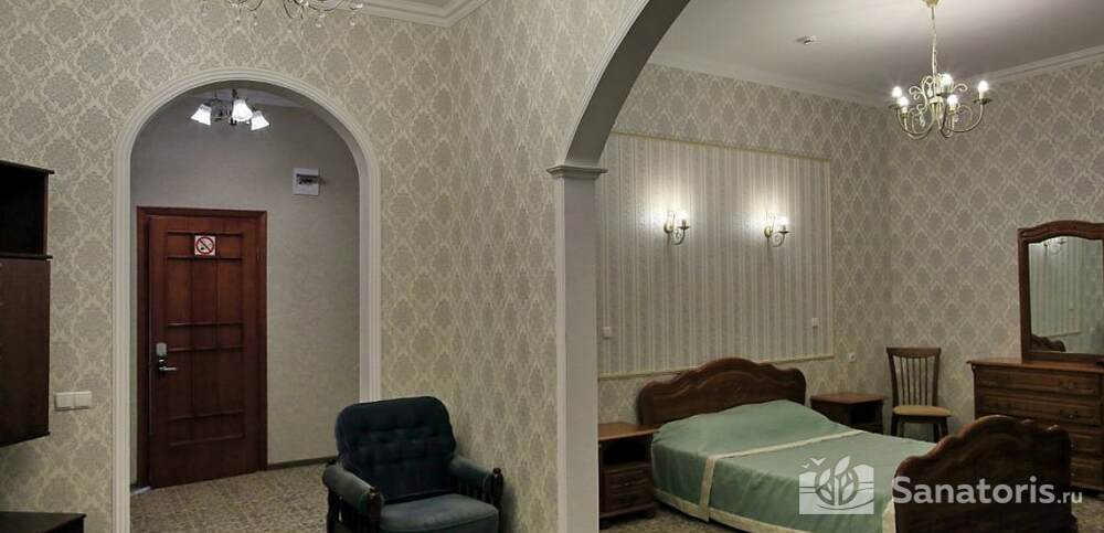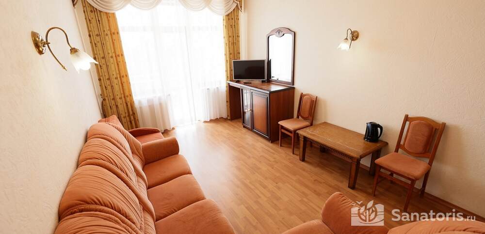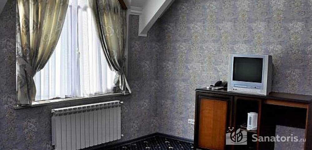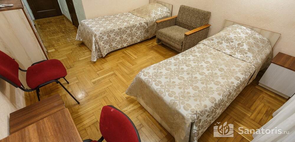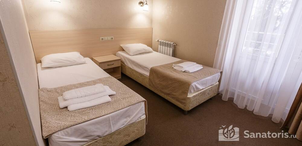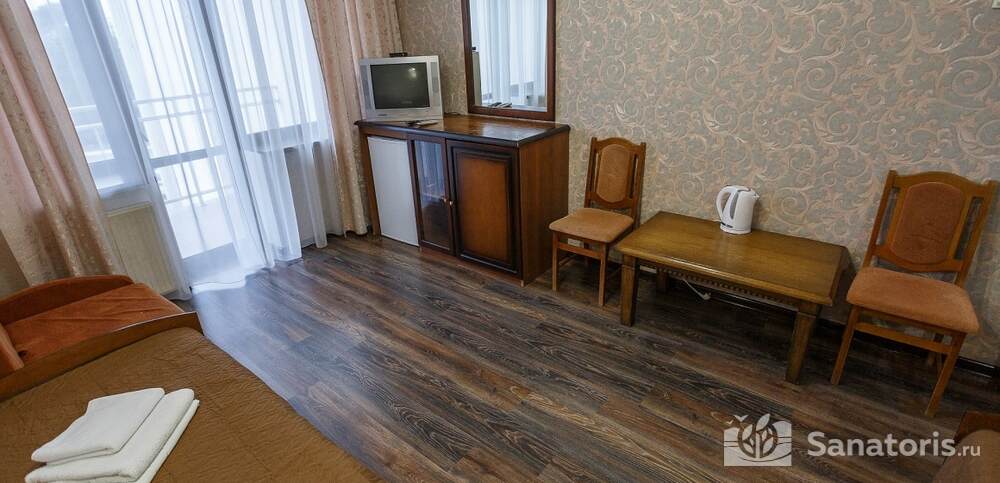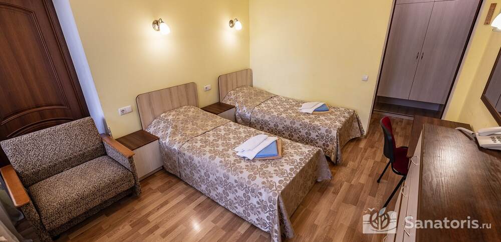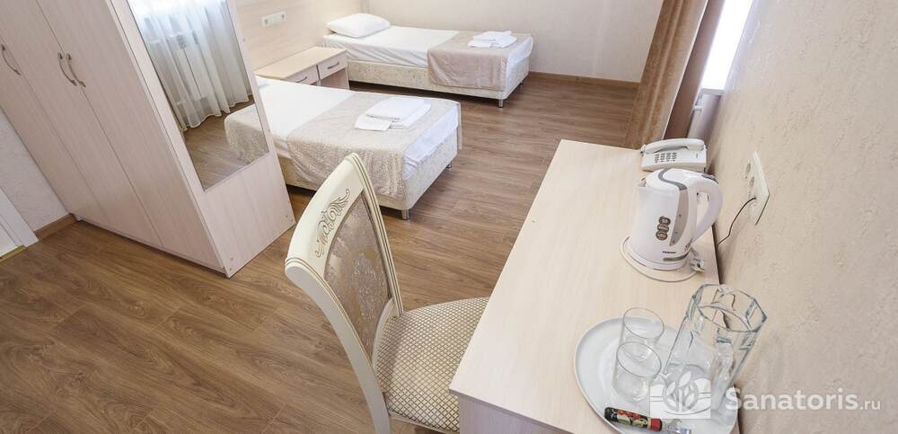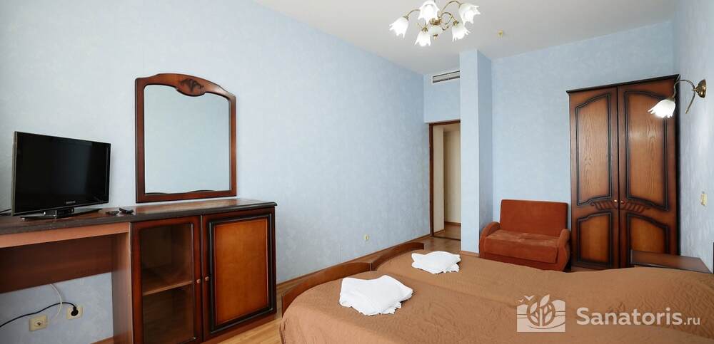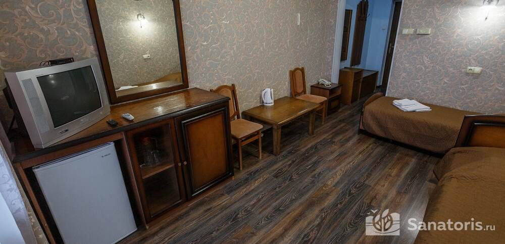Номера комфортные и оснащены всем необходимым. В них имеется холодильник, кондиционер и телевизор, отдельные ванные комнаты. Недалеко от него раскинулось море и песчаный пляж. Вблизи санатория бьют минеральные источники. Ежедневное употребление такой воды укрепляет иммунную систему, избавляет от воспалительных процессов и простуд, положительно влияет на организм человека в целом.