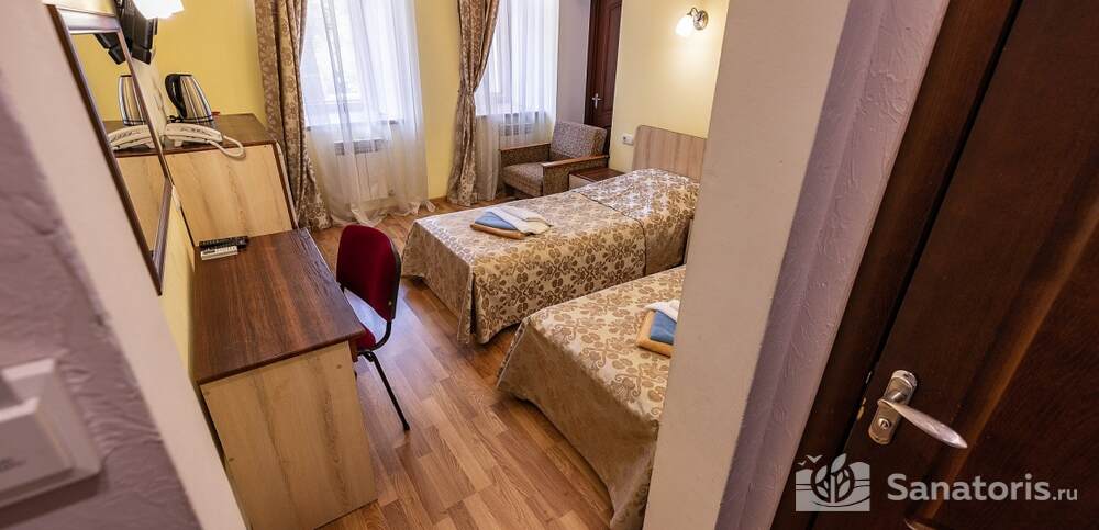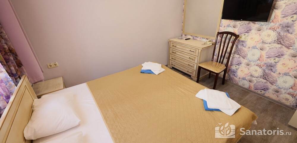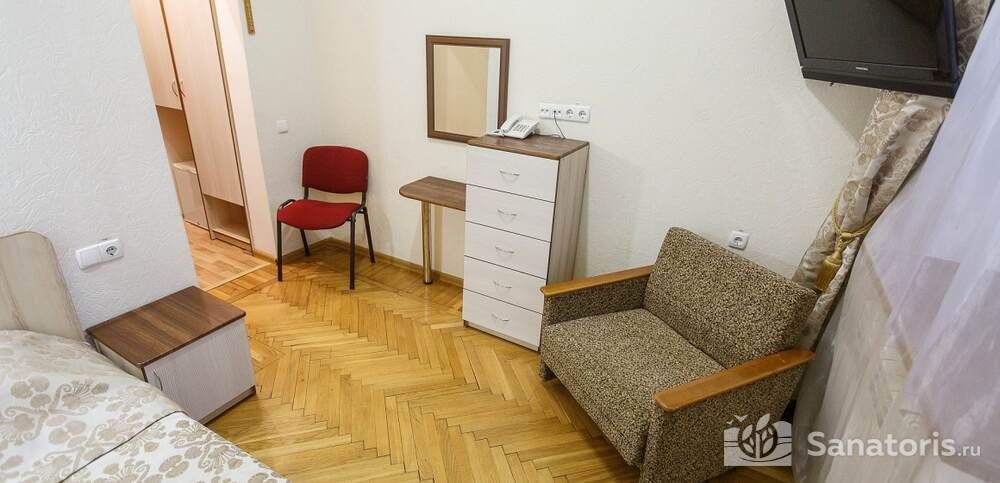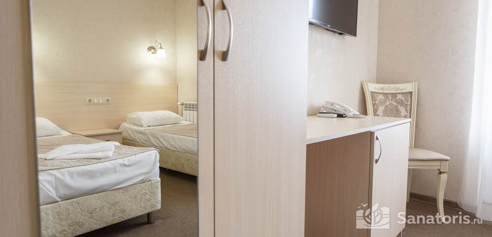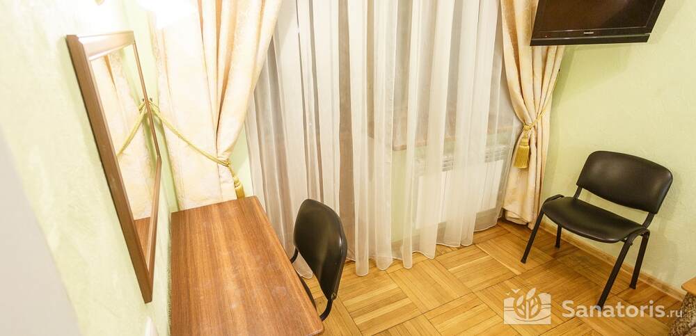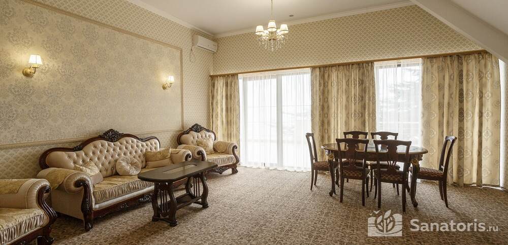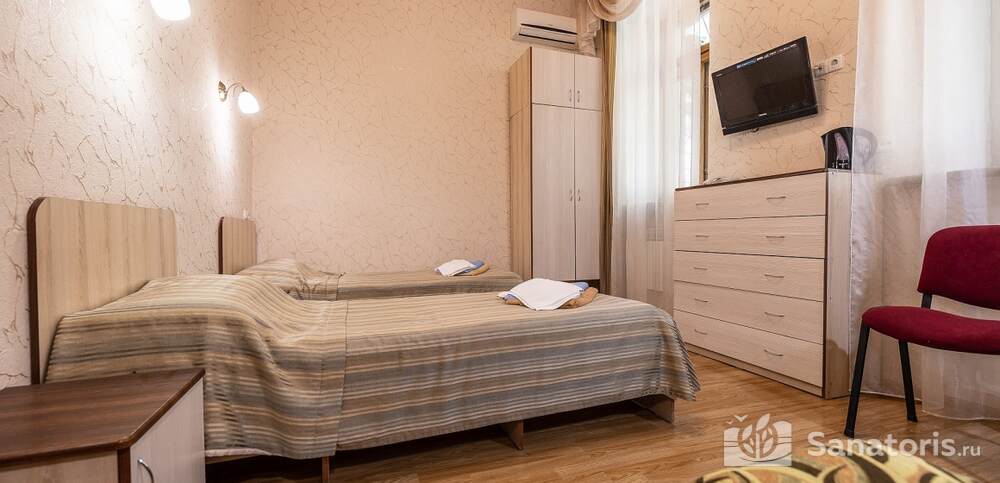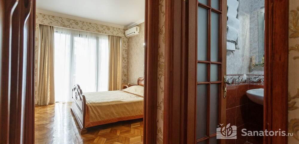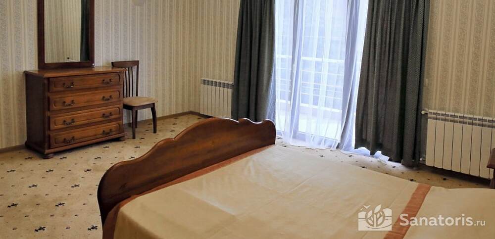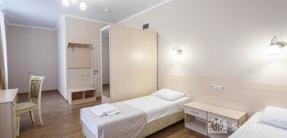 Номера комфортные и оснащены всем необходимым. В них имеется холодильник, кондиционер и телевизор, отдельные ванные комнаты. Недалеко от него раскинулось море и песчаный пляж. Вблизи санатория бьют минеральные источники. Ежедневное употребление такой воды укрепляет иммунную систему, избавляет от воспалительных процессов и простуд, положительно влияет на организм человека в целом.